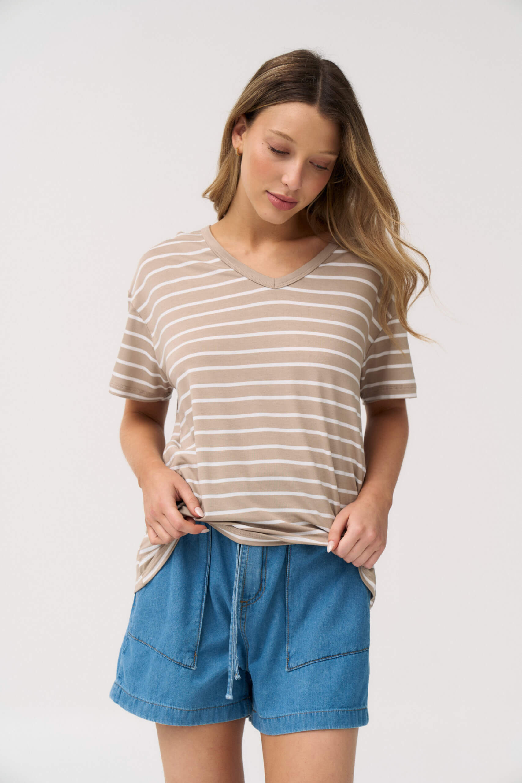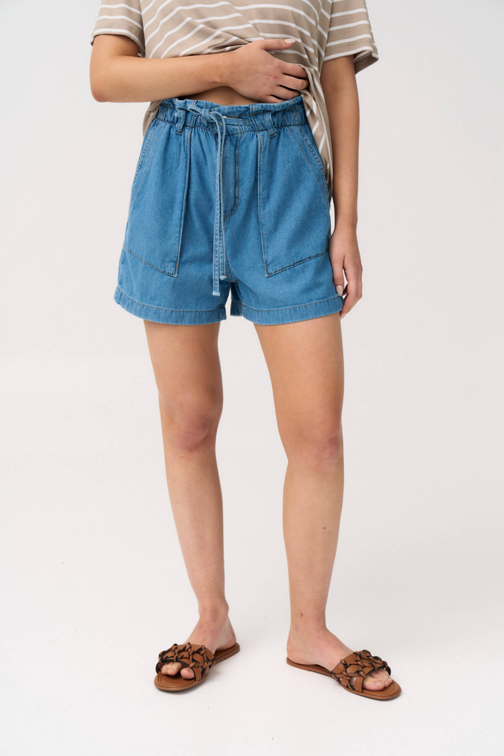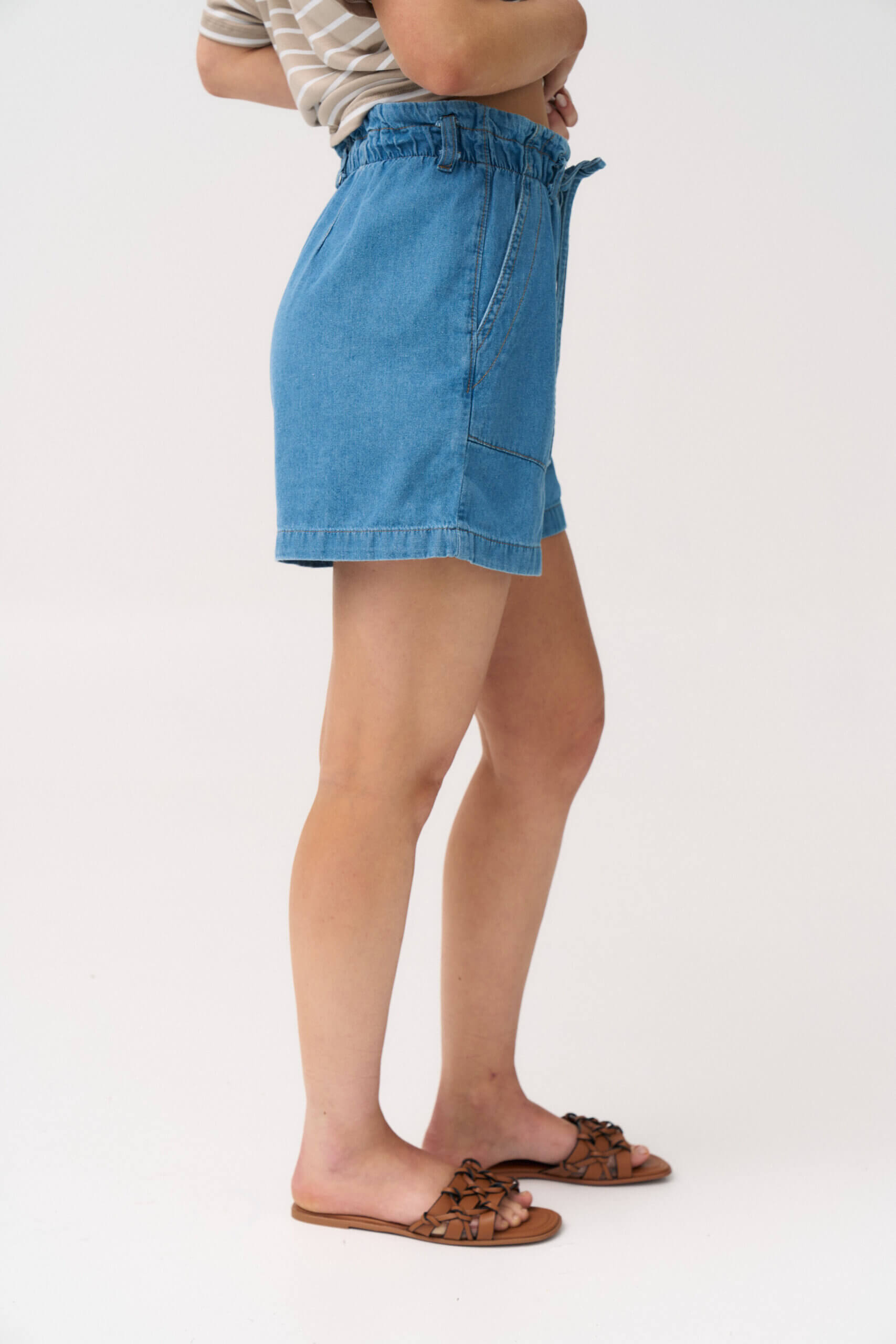 Short de jean con cintura elastizada con volados y bolsillos delanteros.