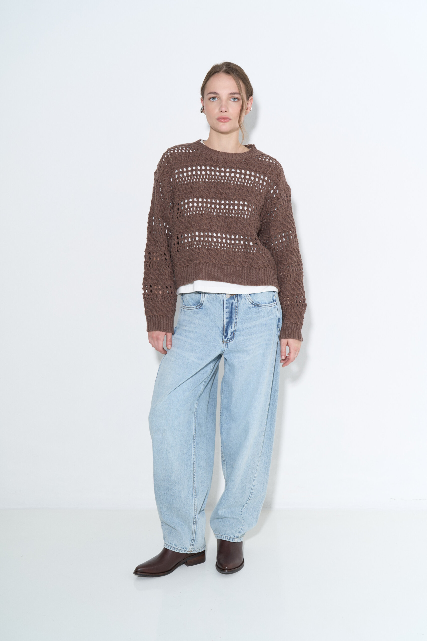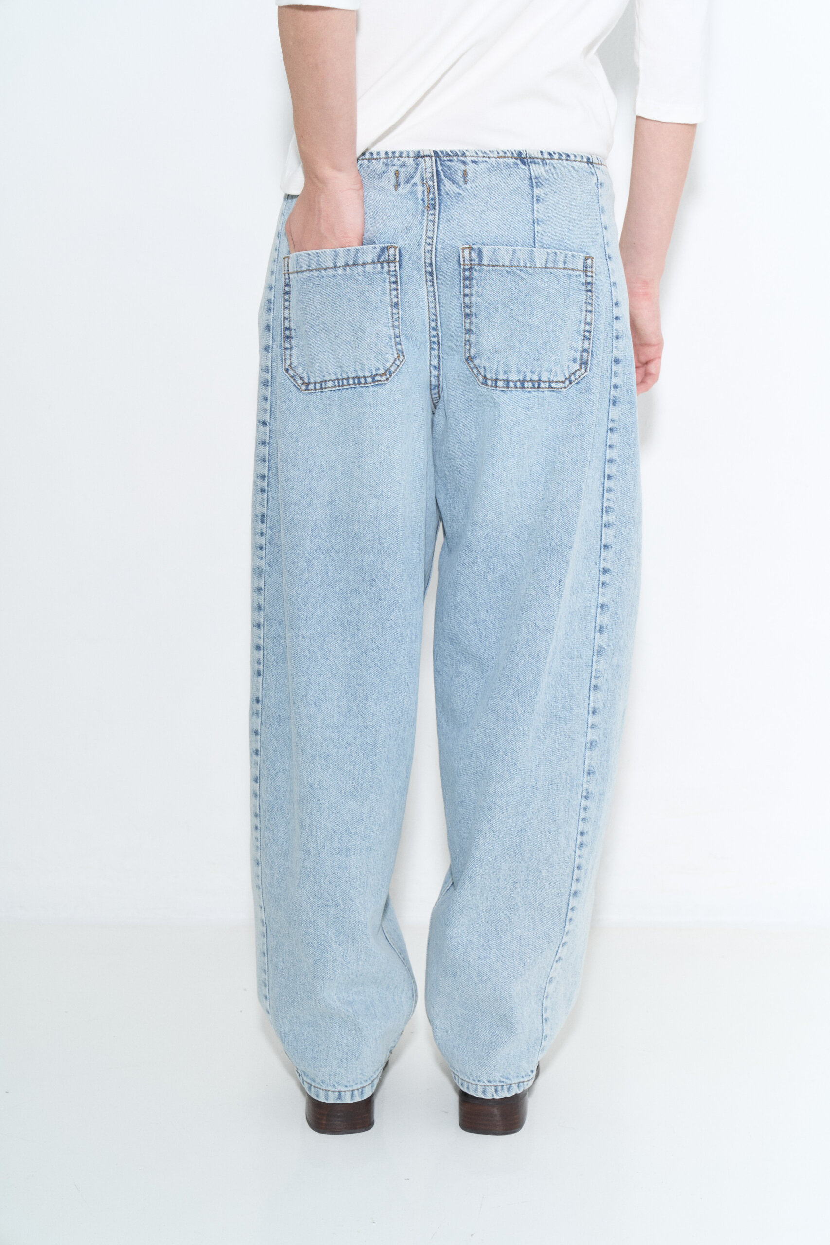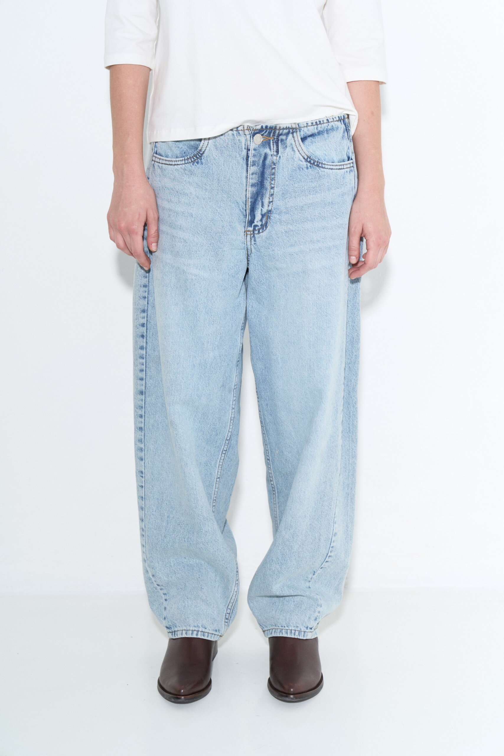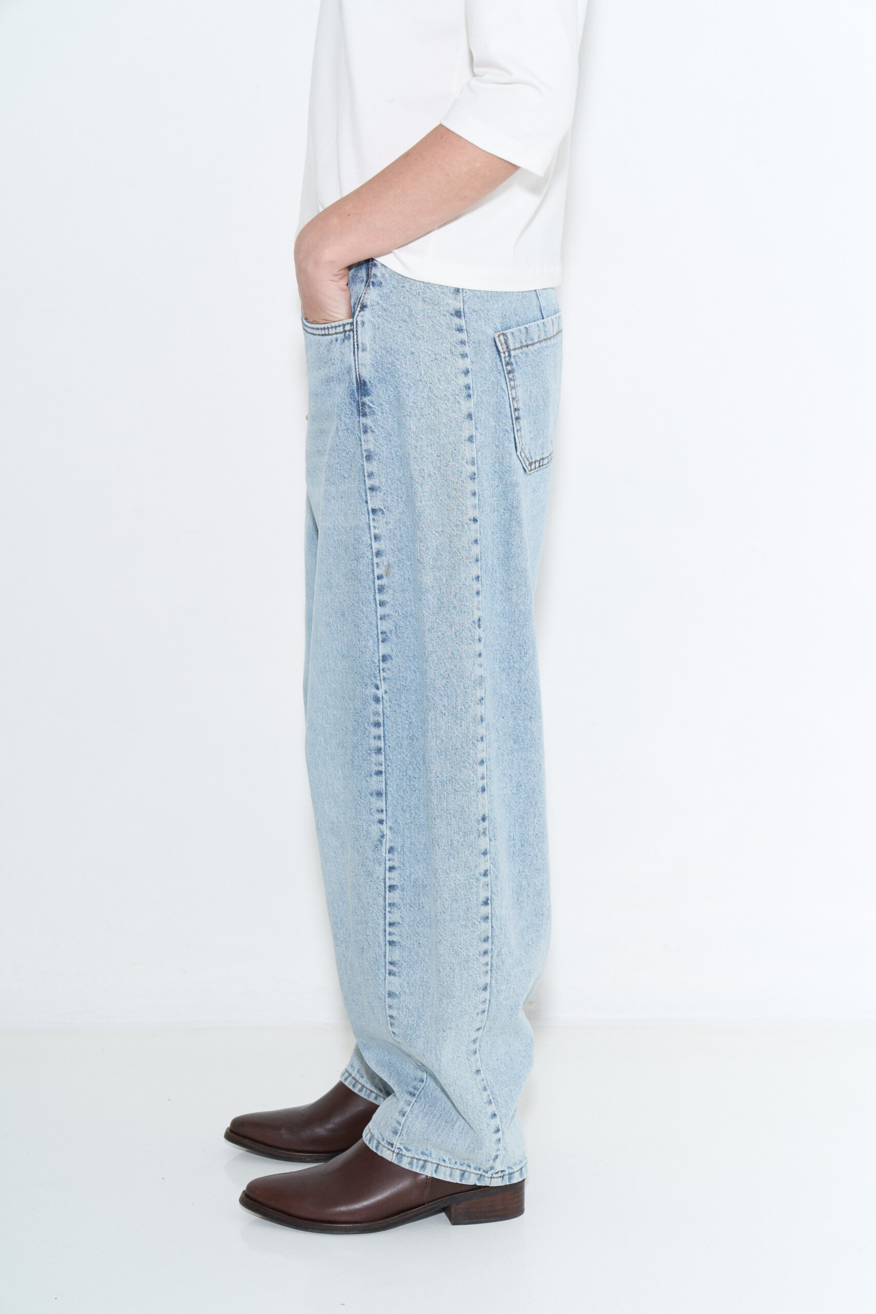 Jean balloon rígido tiro medio con recortes laterales y cintura entera con vista interna, ruedo común.