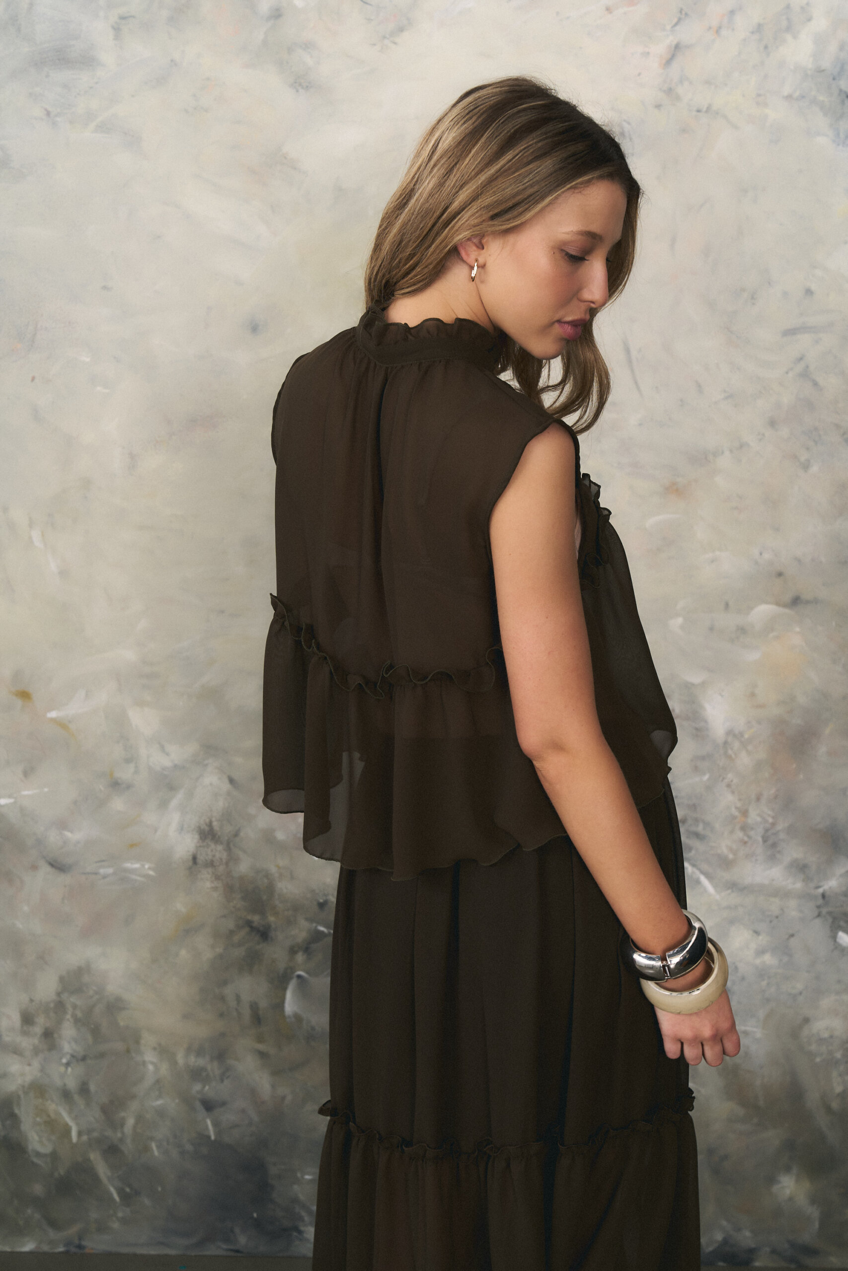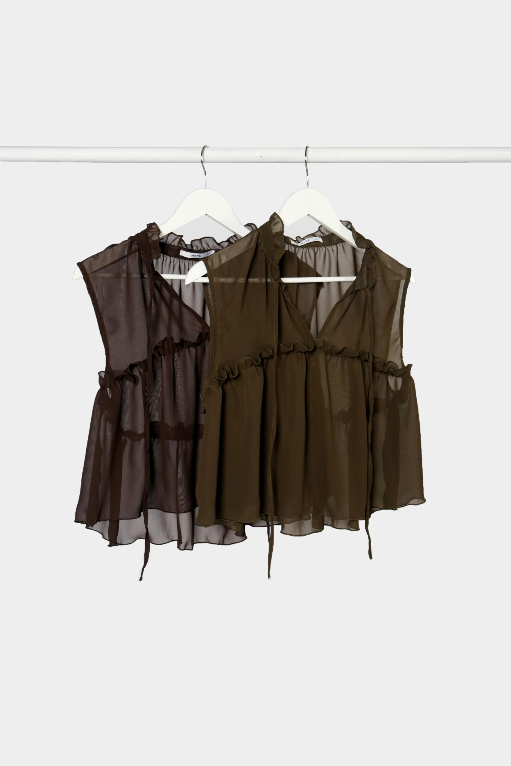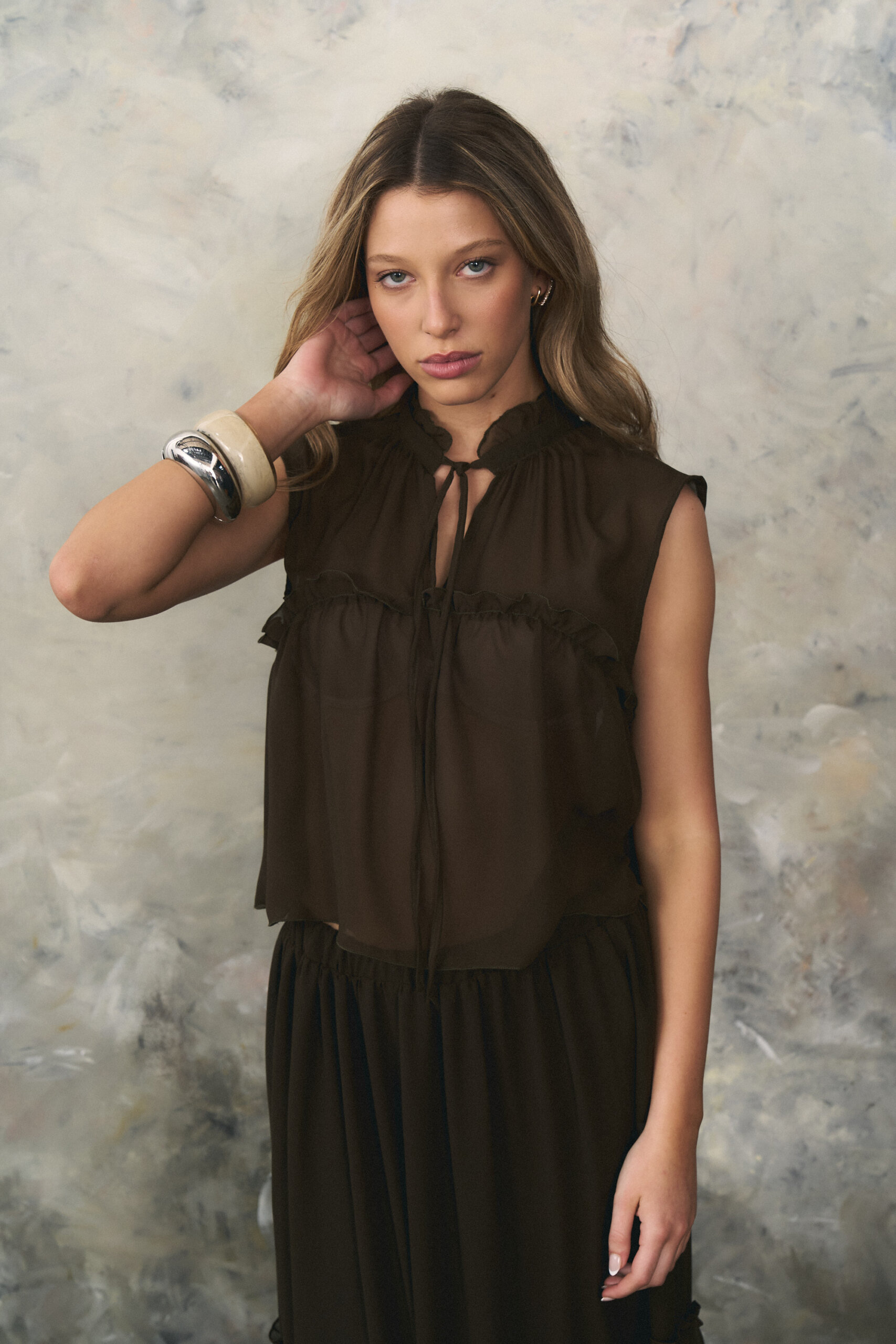 Blusa confeccionada en gasa con lazo y volados en cuello. Recorte con fruncido y volado en delantero y espalda.