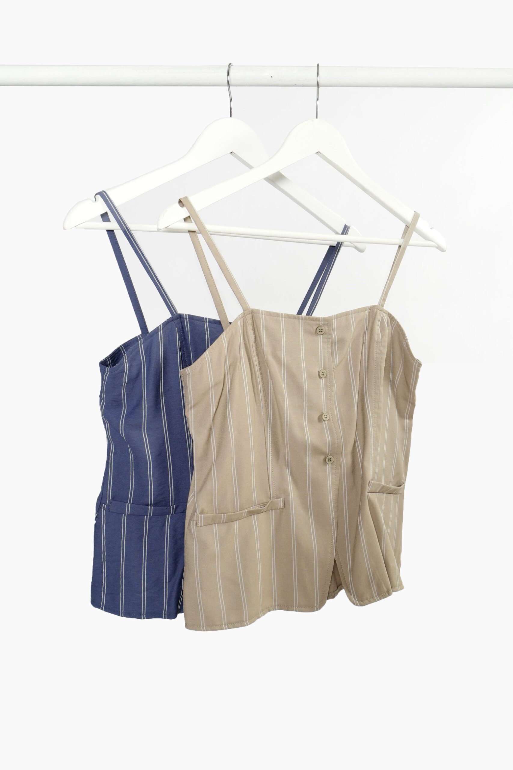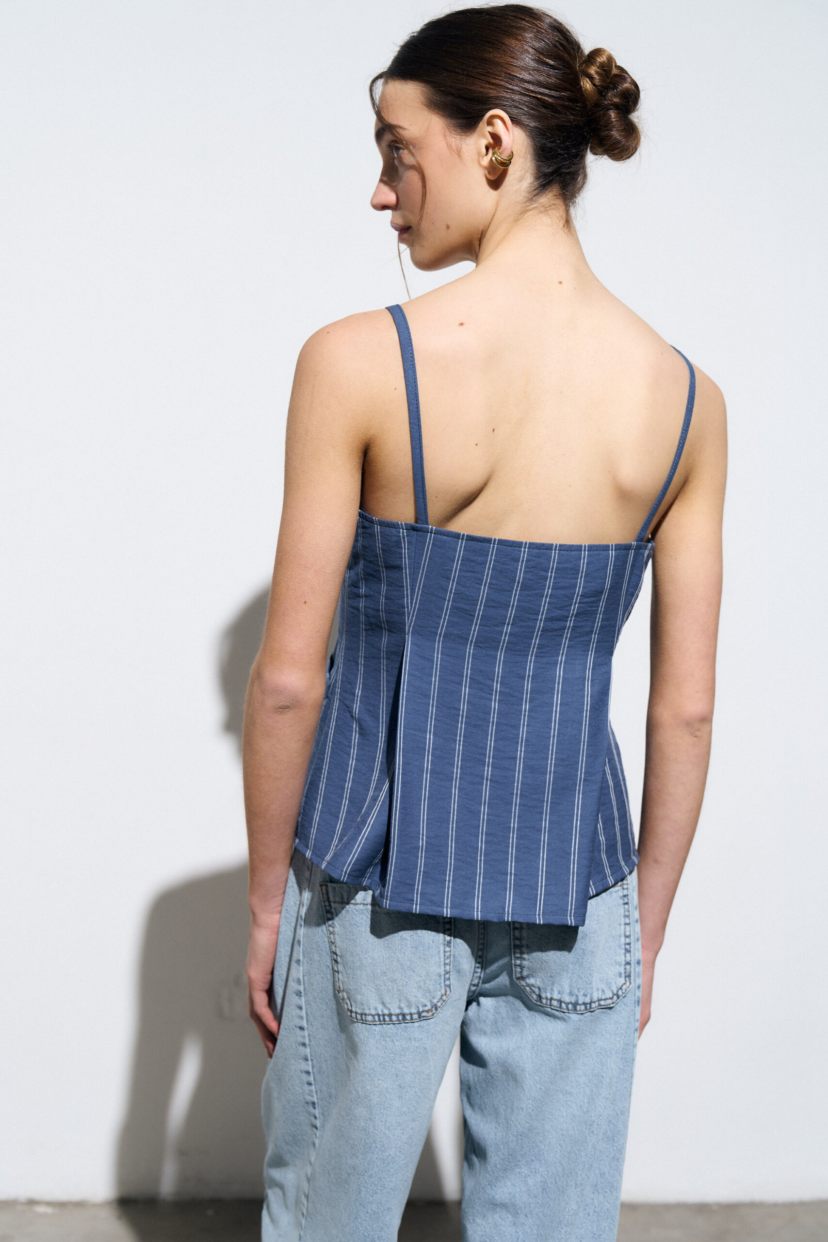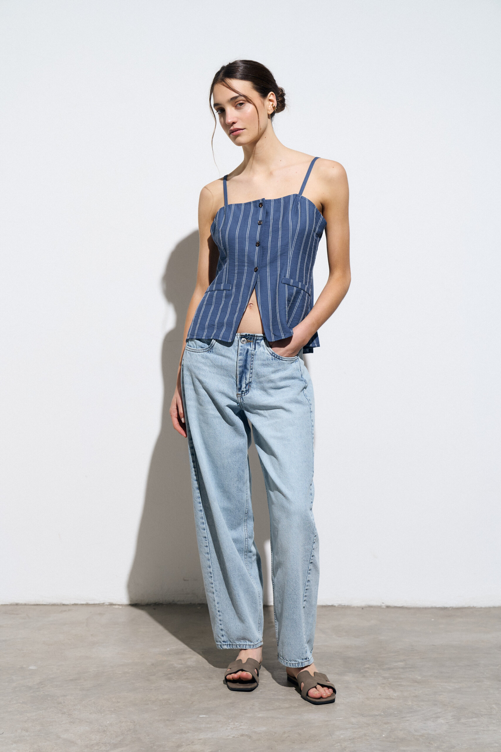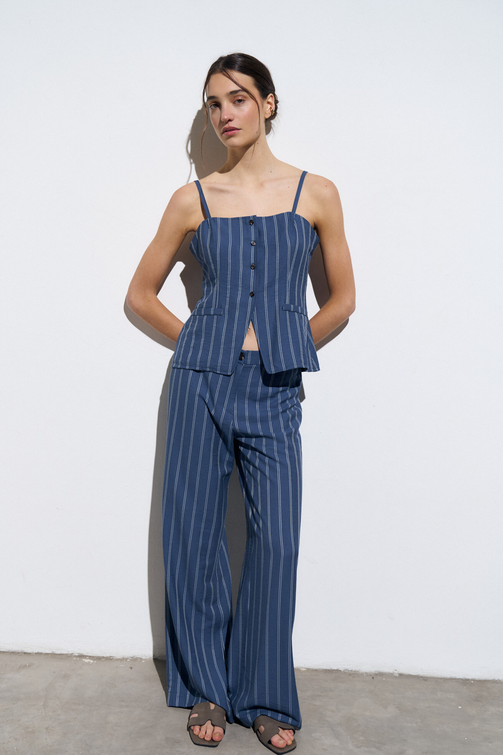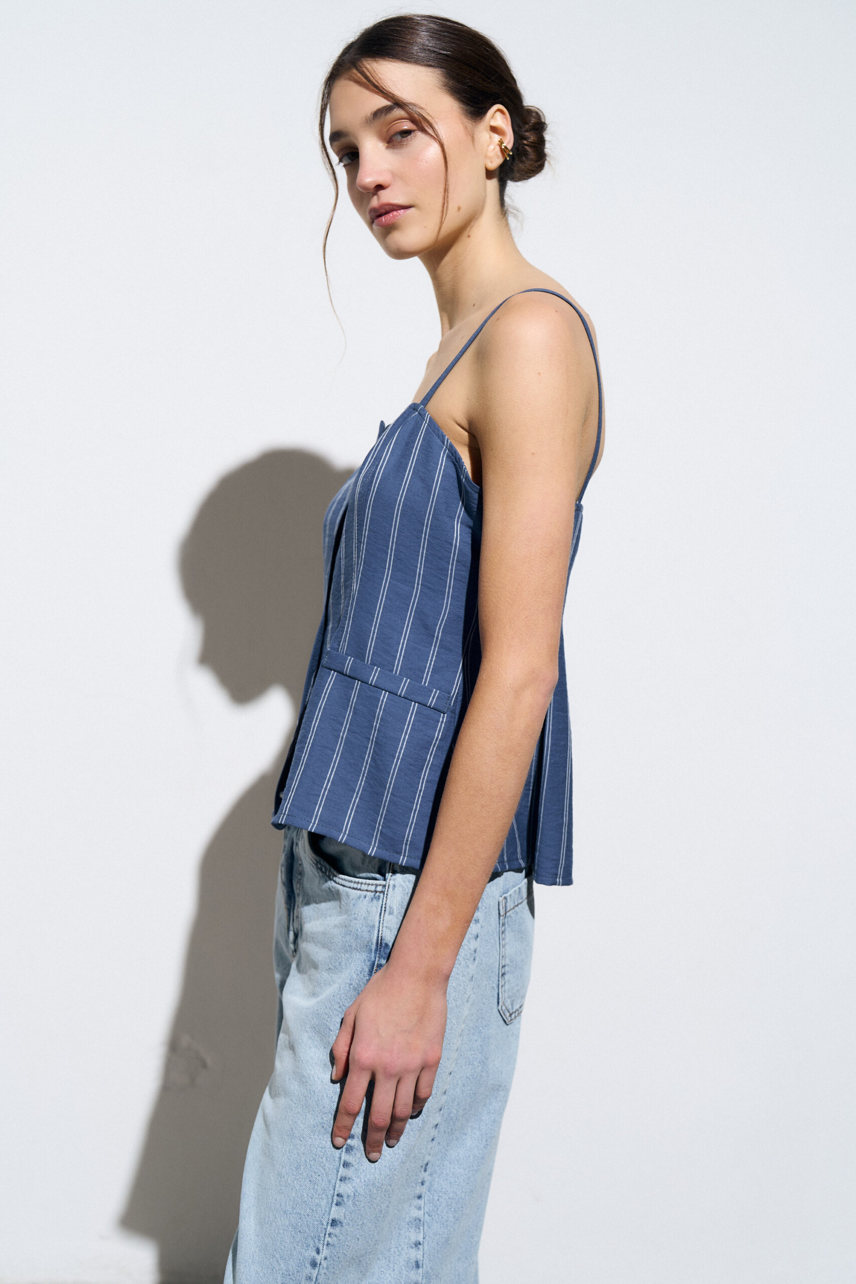 Blusa sastrera con escote recto, breteles finos, bolsillos falso ojal y cruce delantero con botones a tono. Confeccionada en tejido sastero rayado.