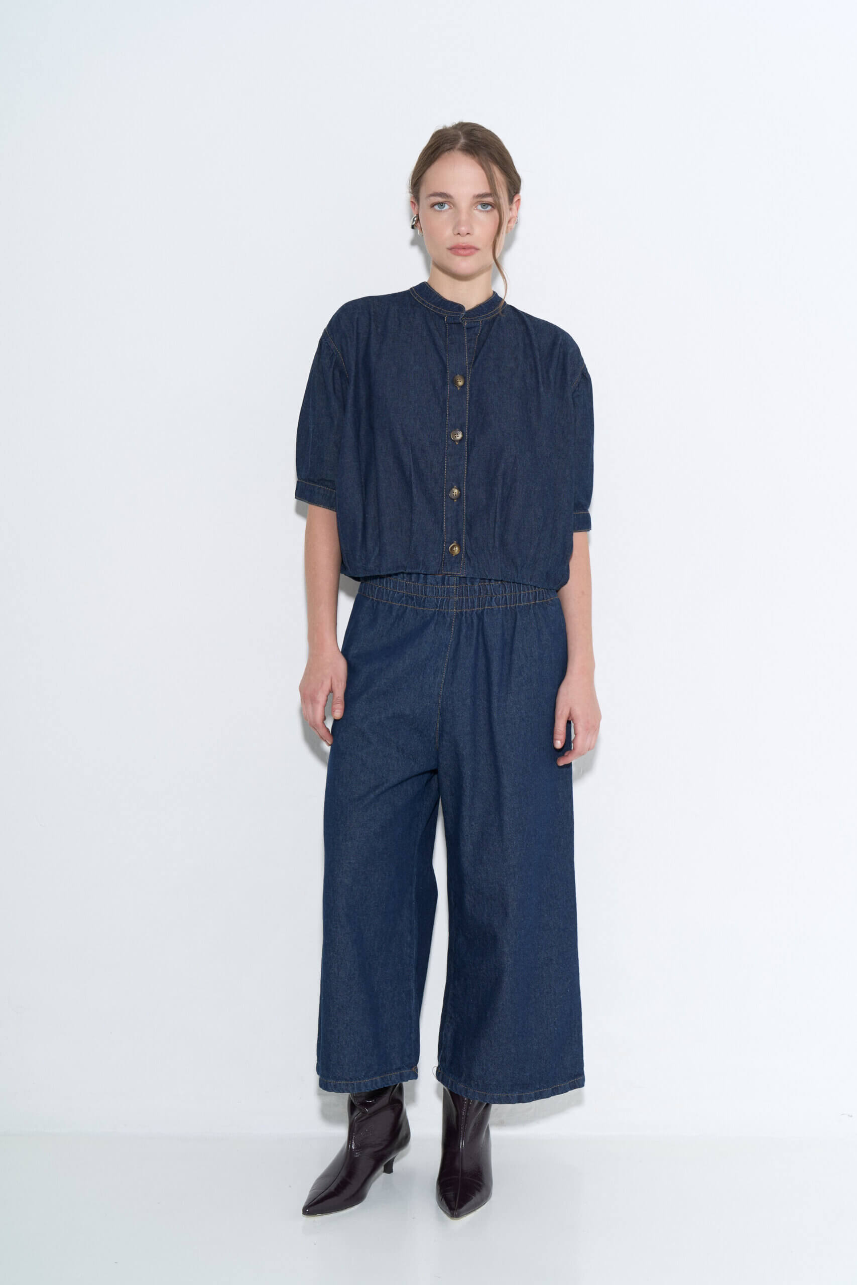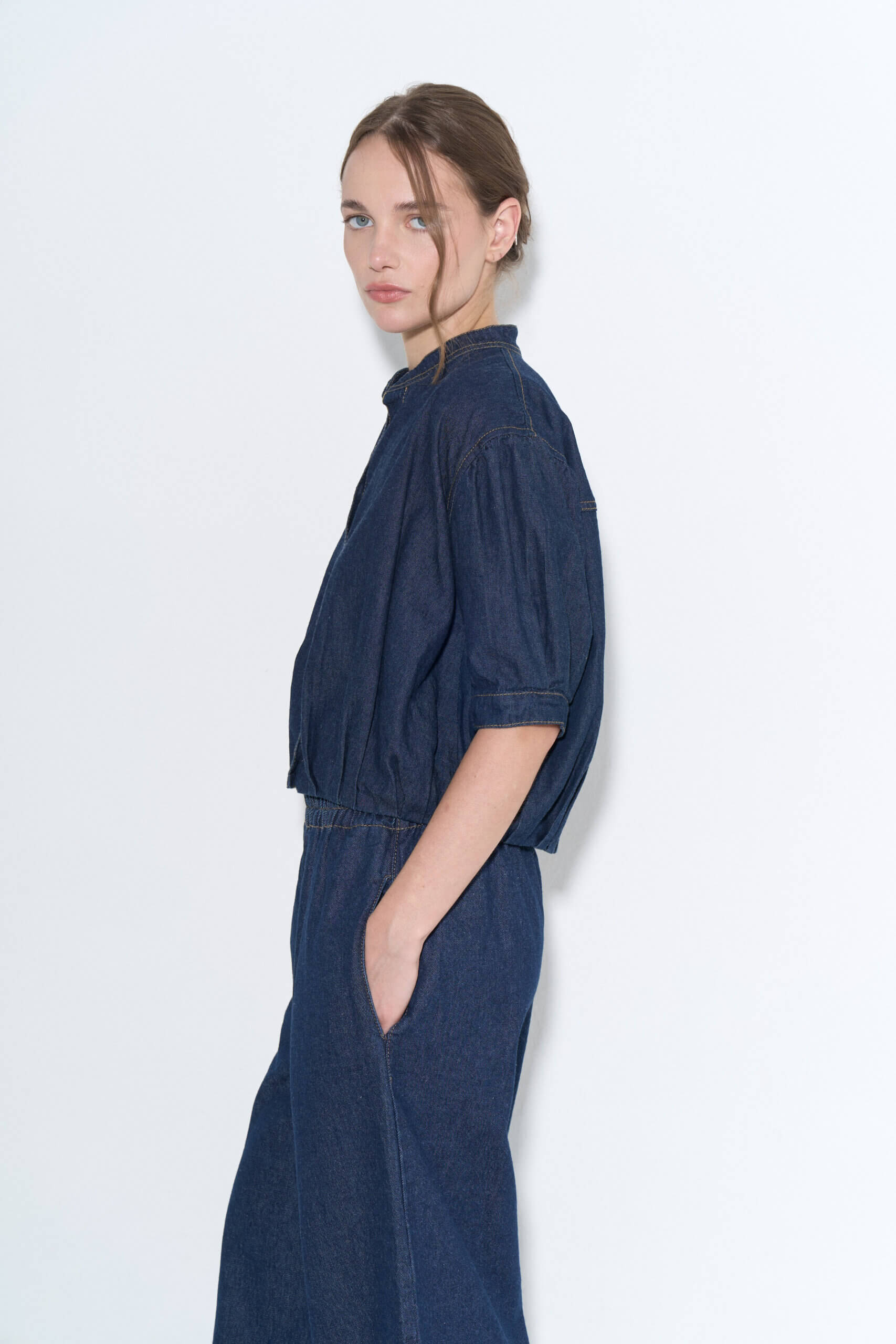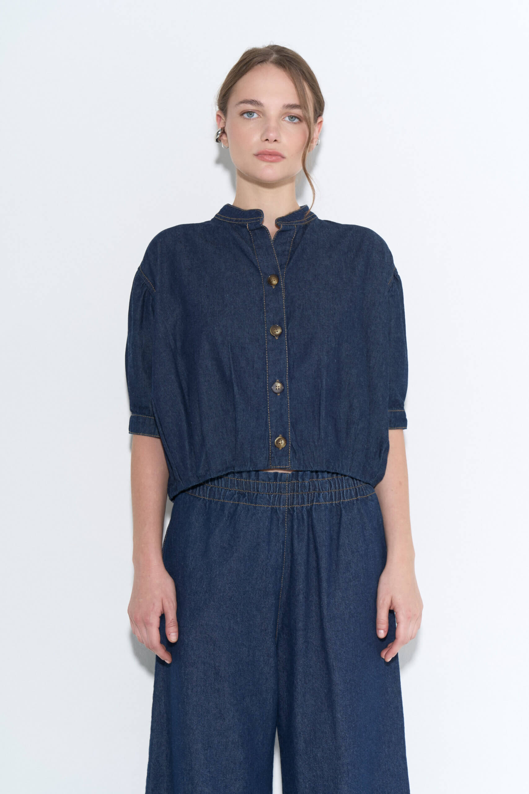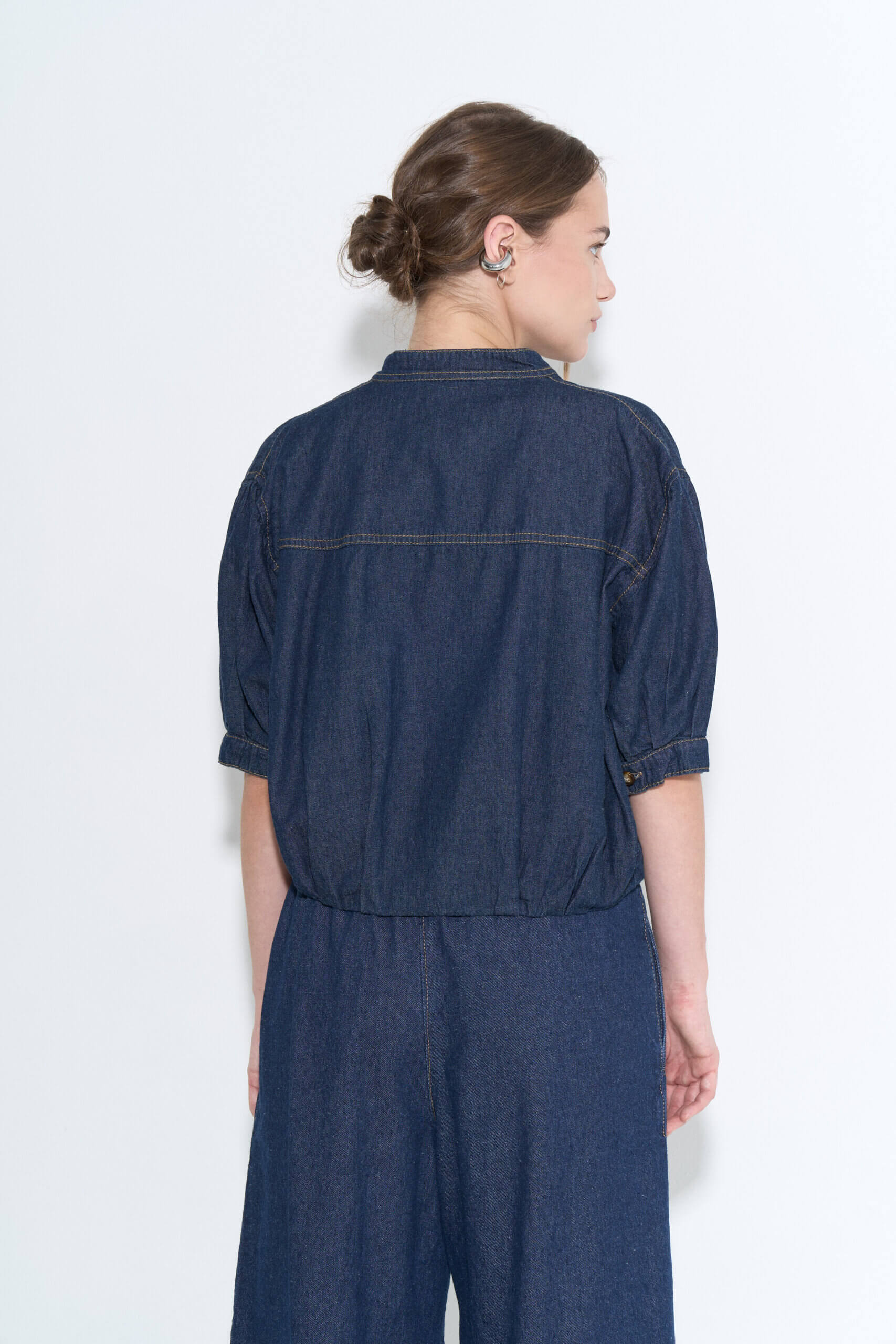 Blusa de denim, cuello redondo. Manga corta abullonada. Cierre frontal con cartera y botones veteados.
