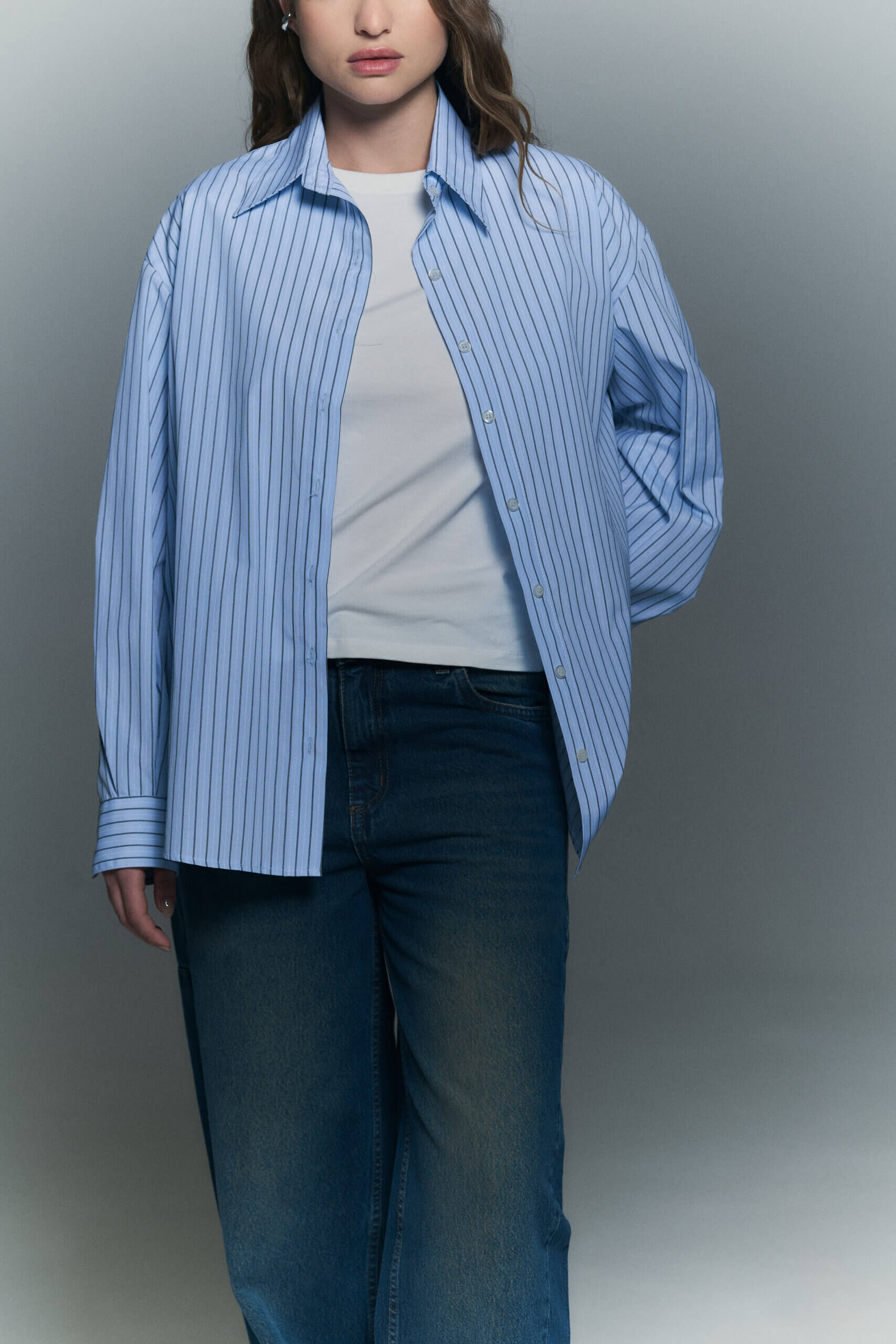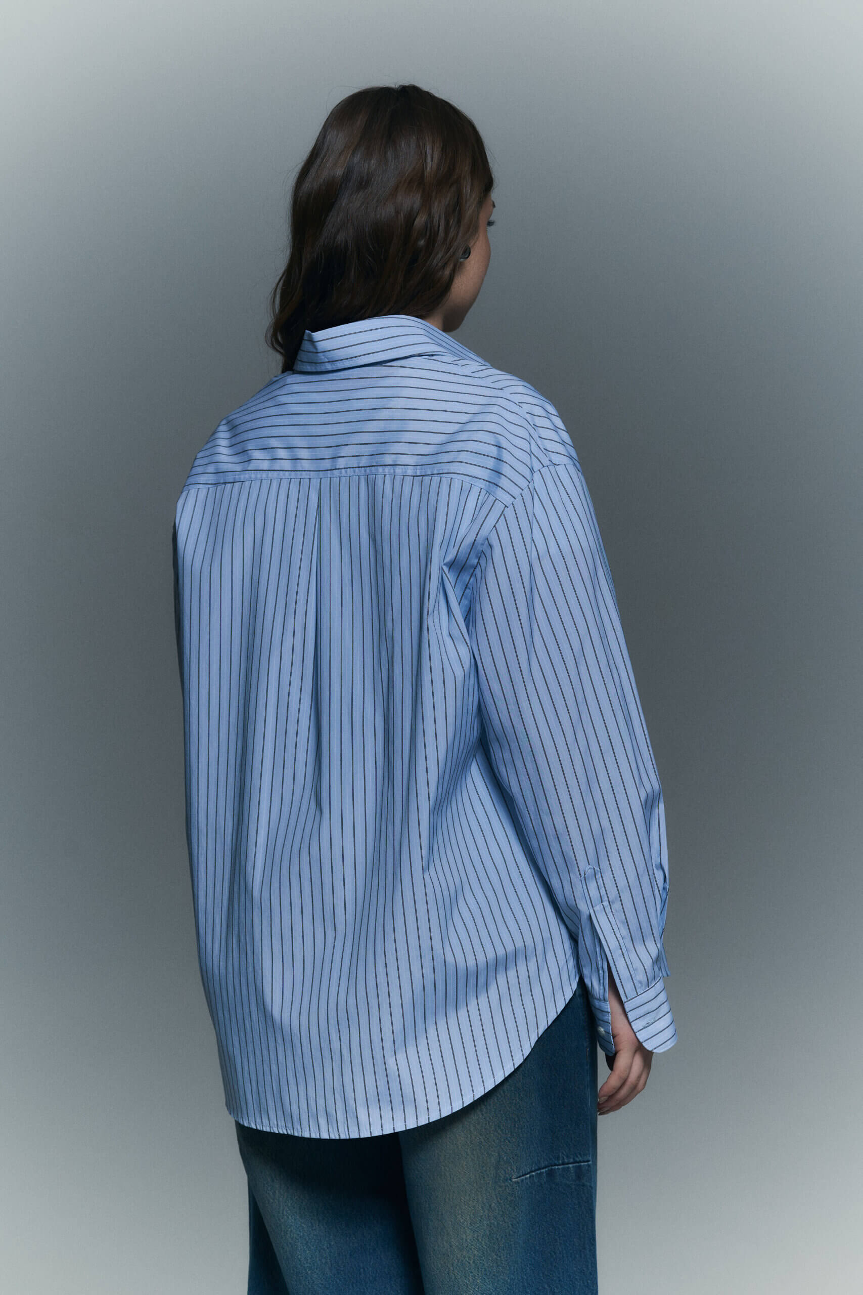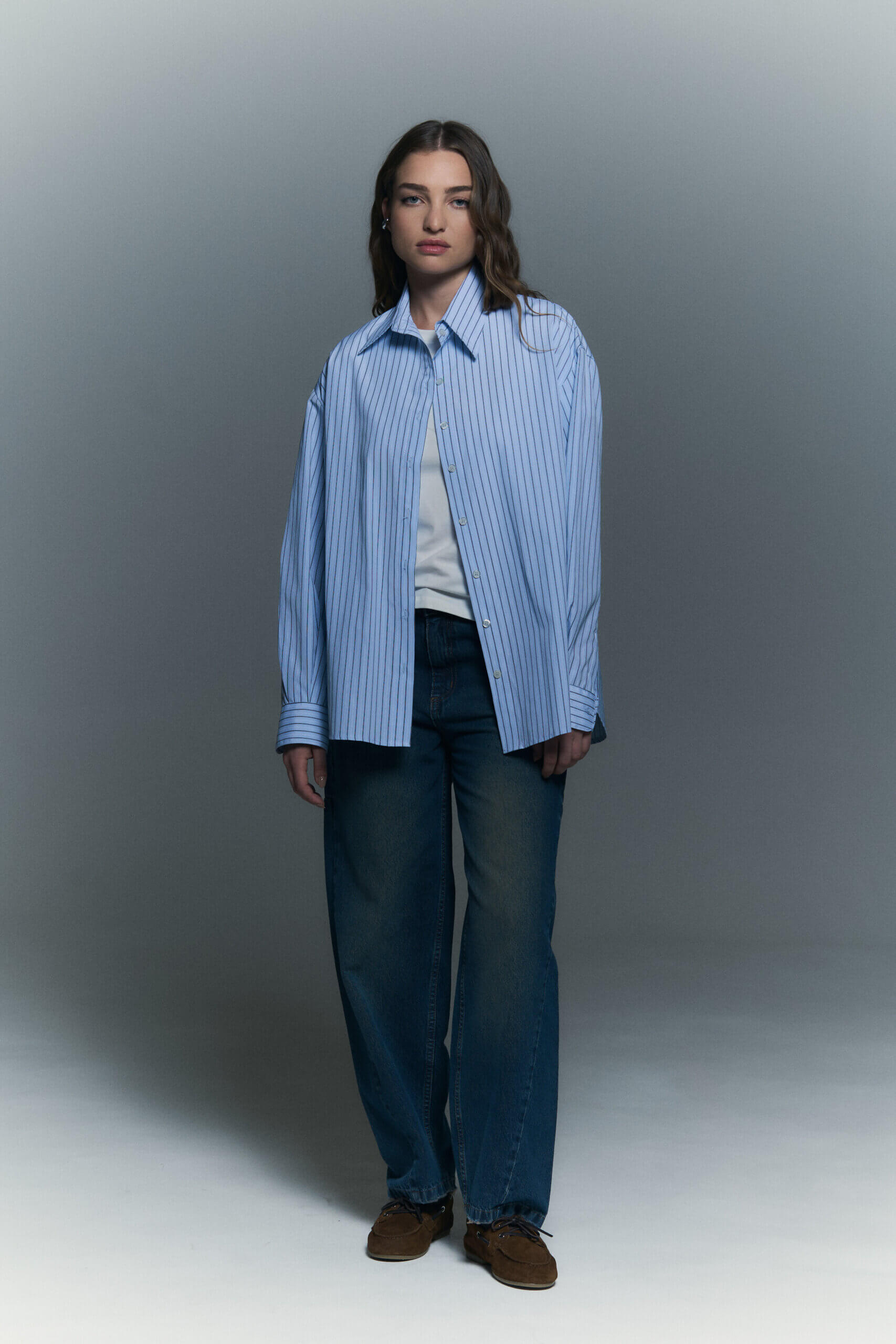 Camisa balloon de denim camisero, manga larga con cartera con botoneria veteada.