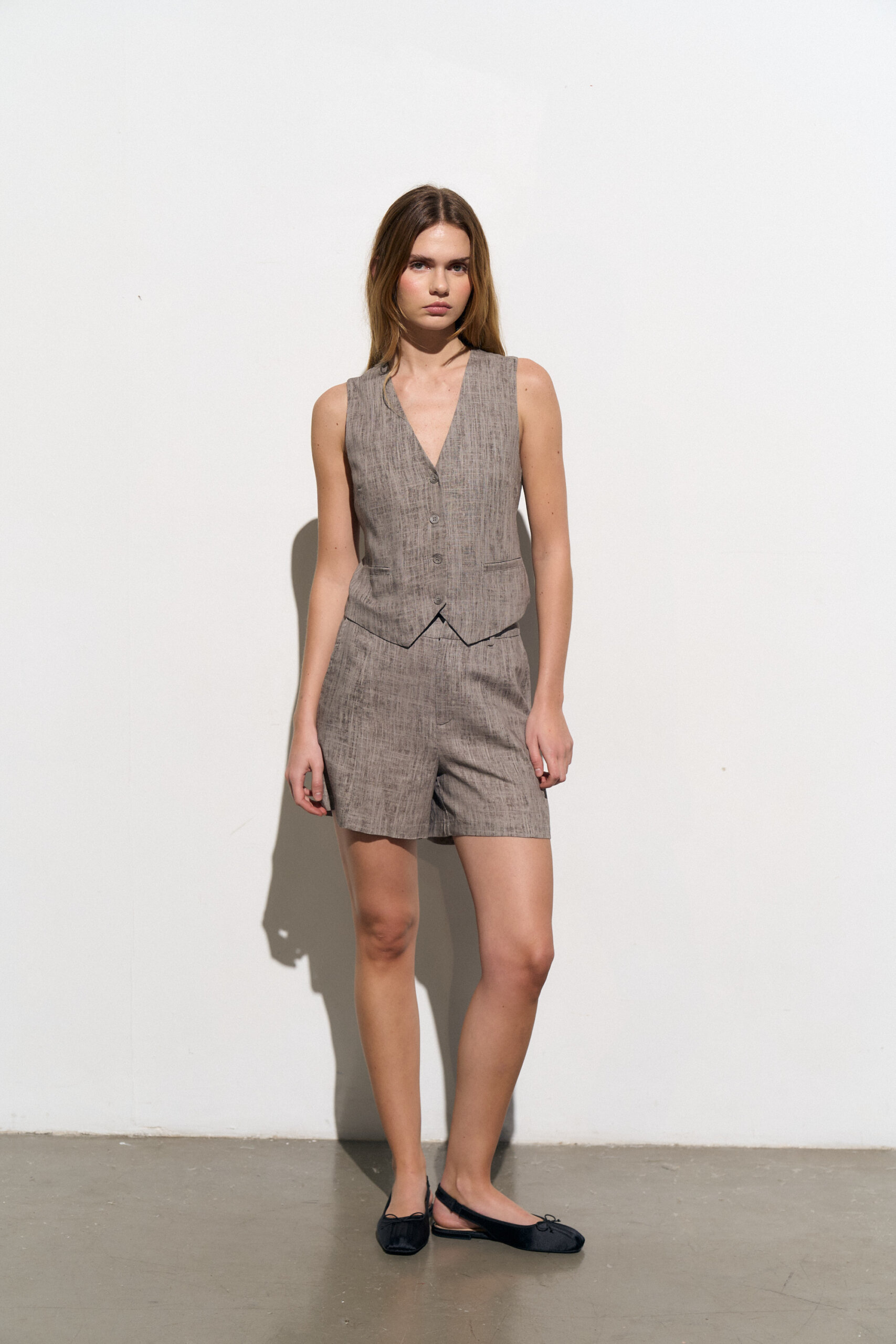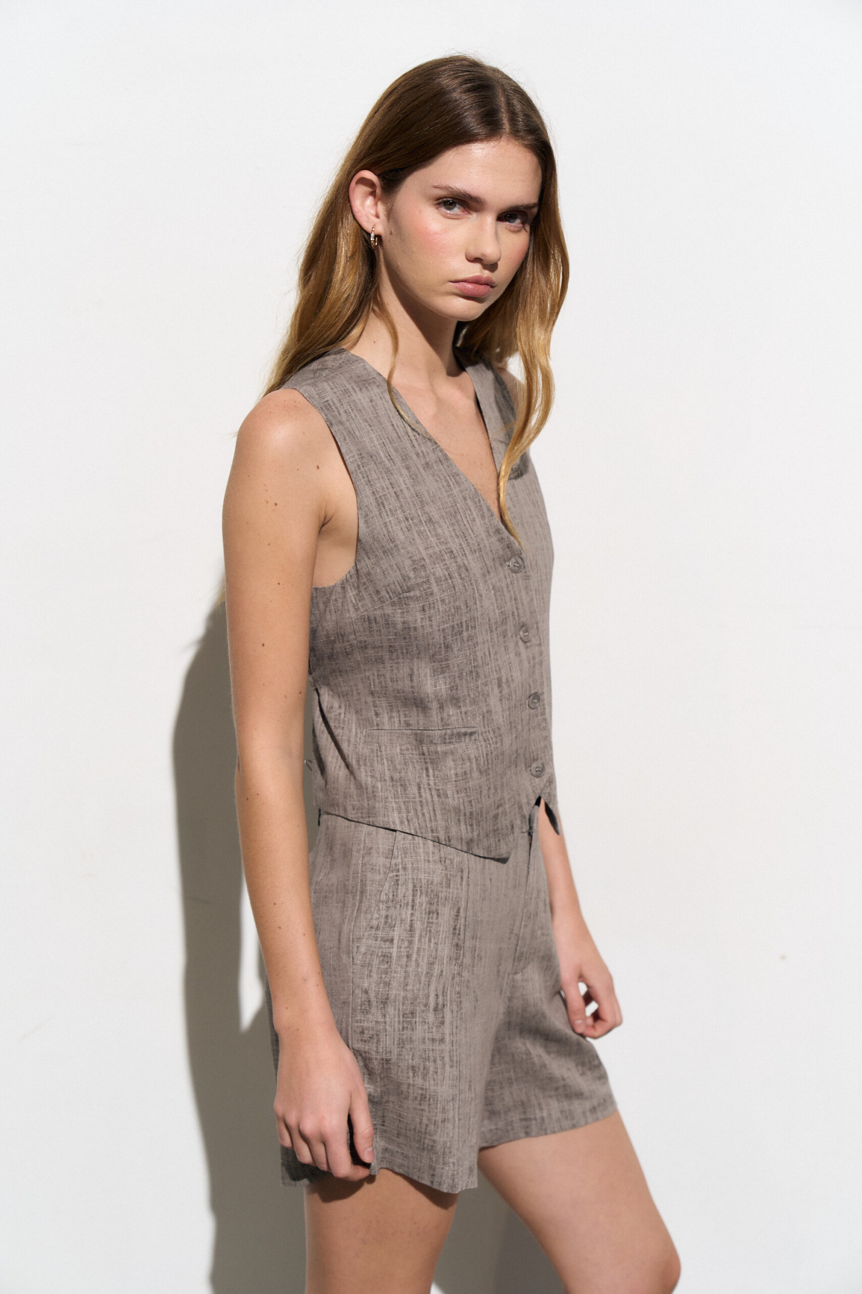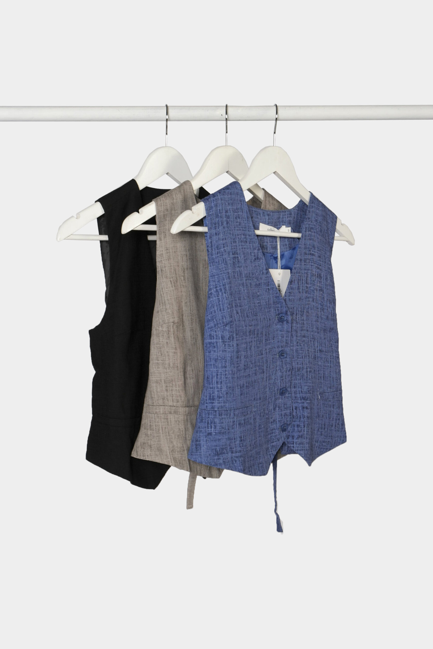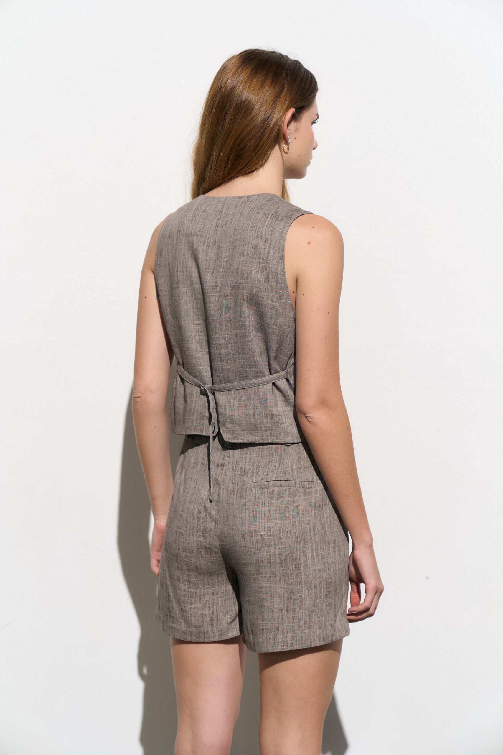 Chaleco sastrero de lino washed, con falso bolsillo en el delantero y cinto regulable en espalda.
