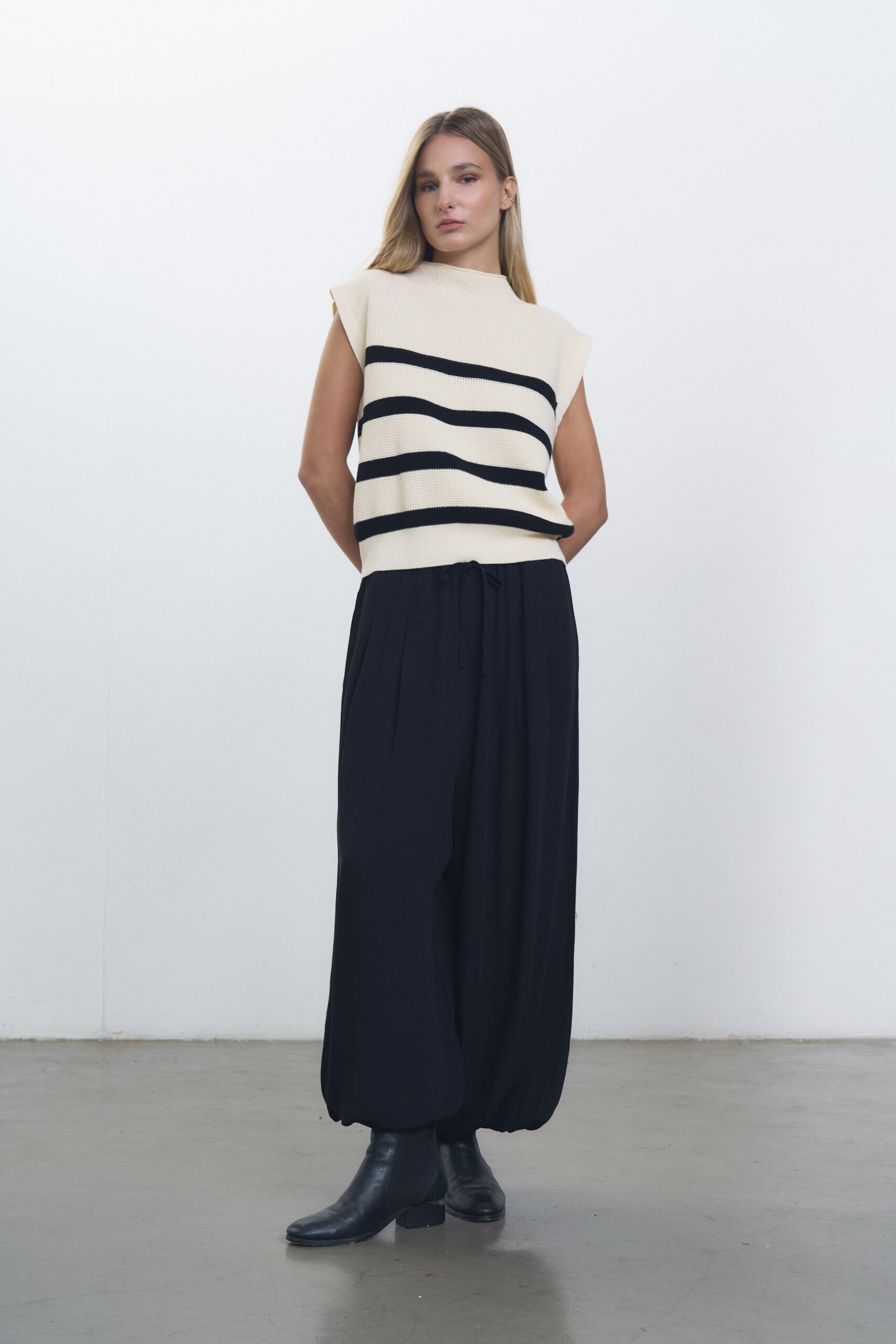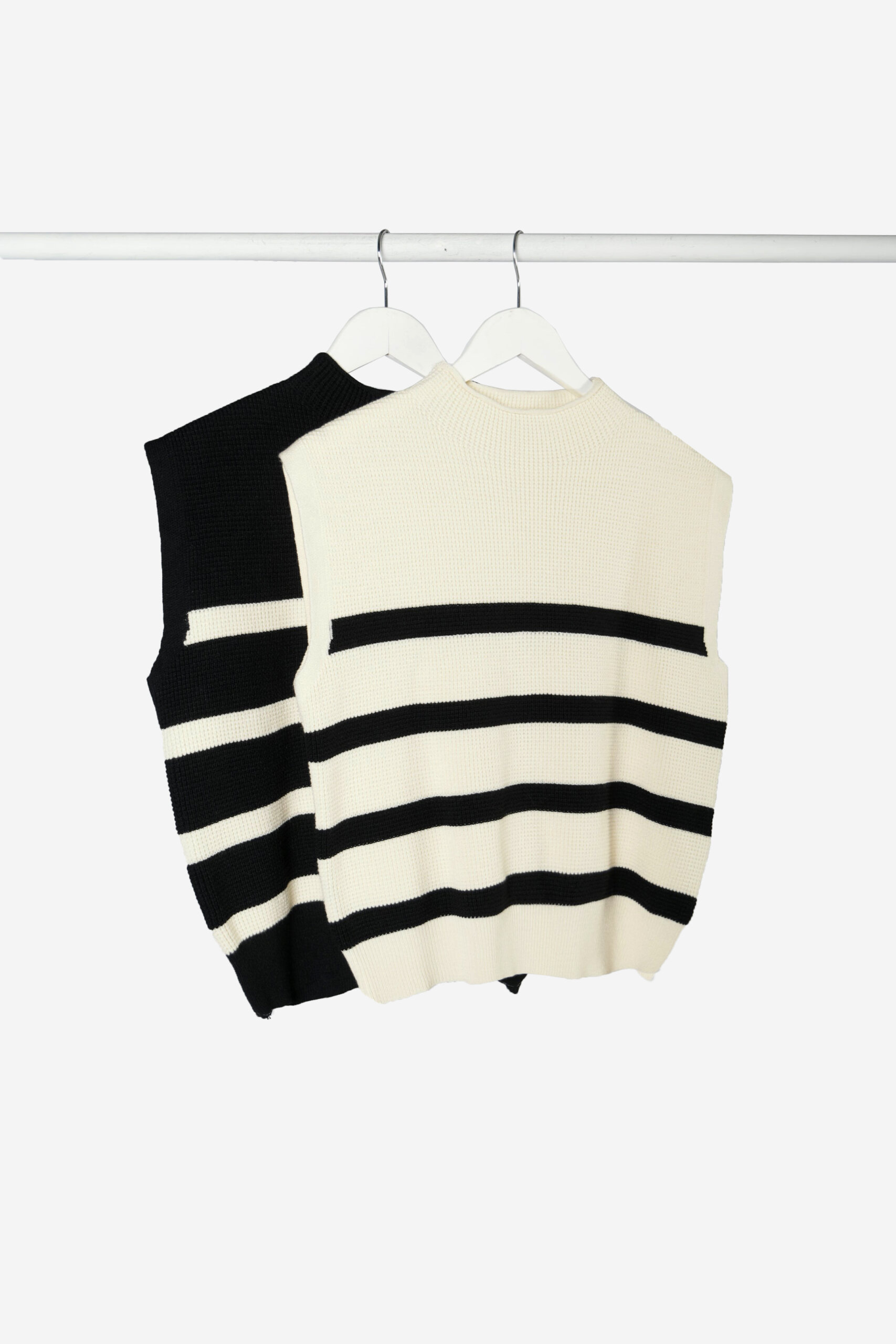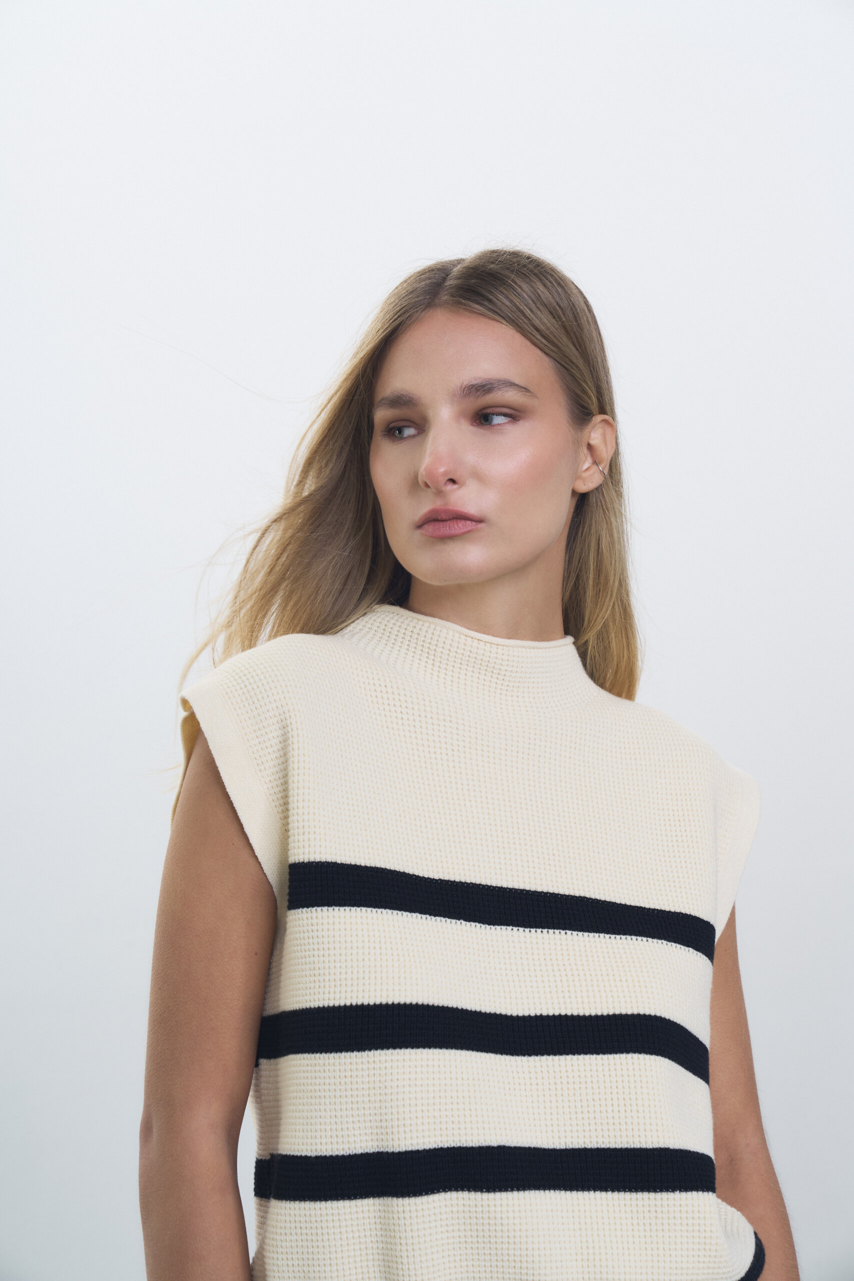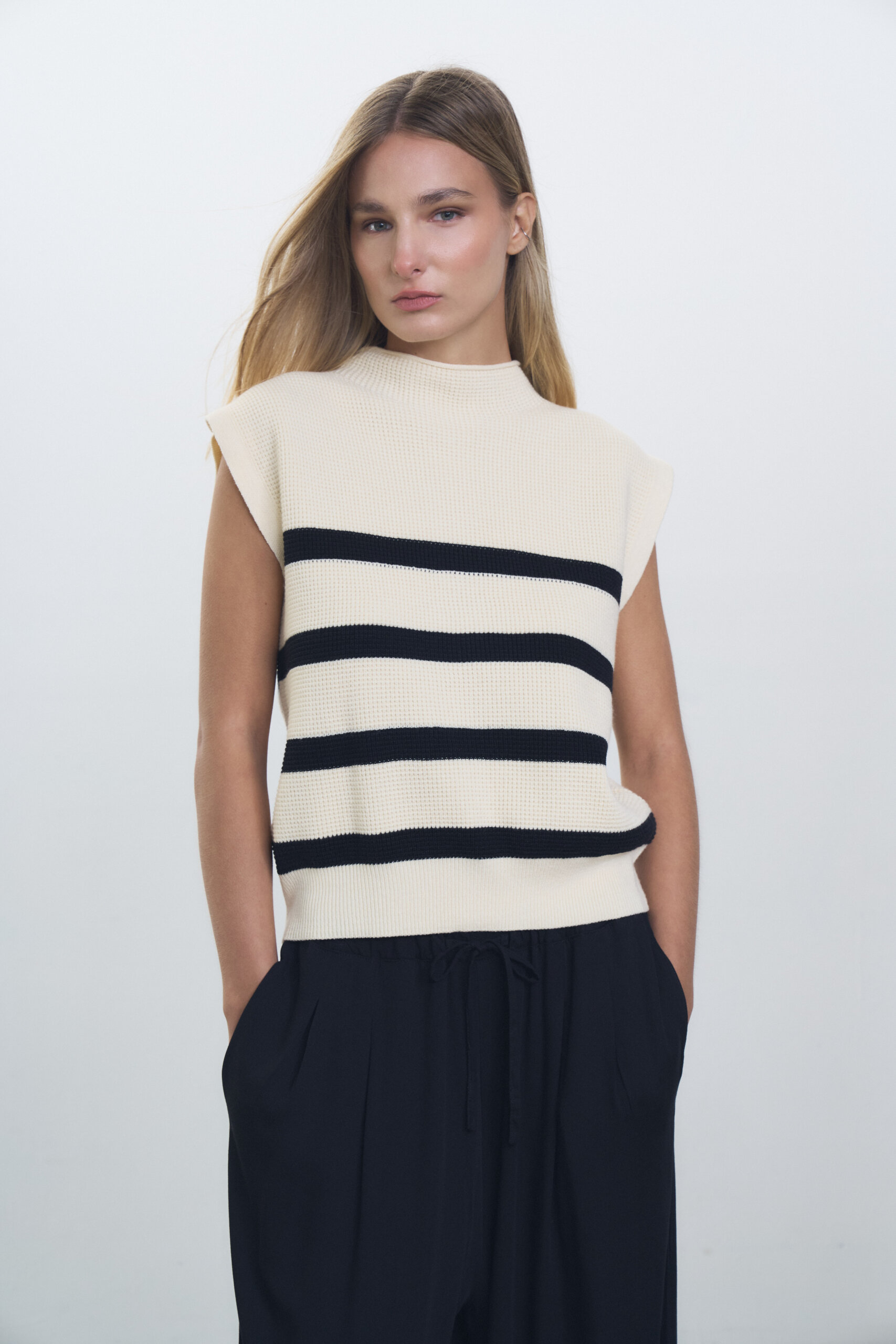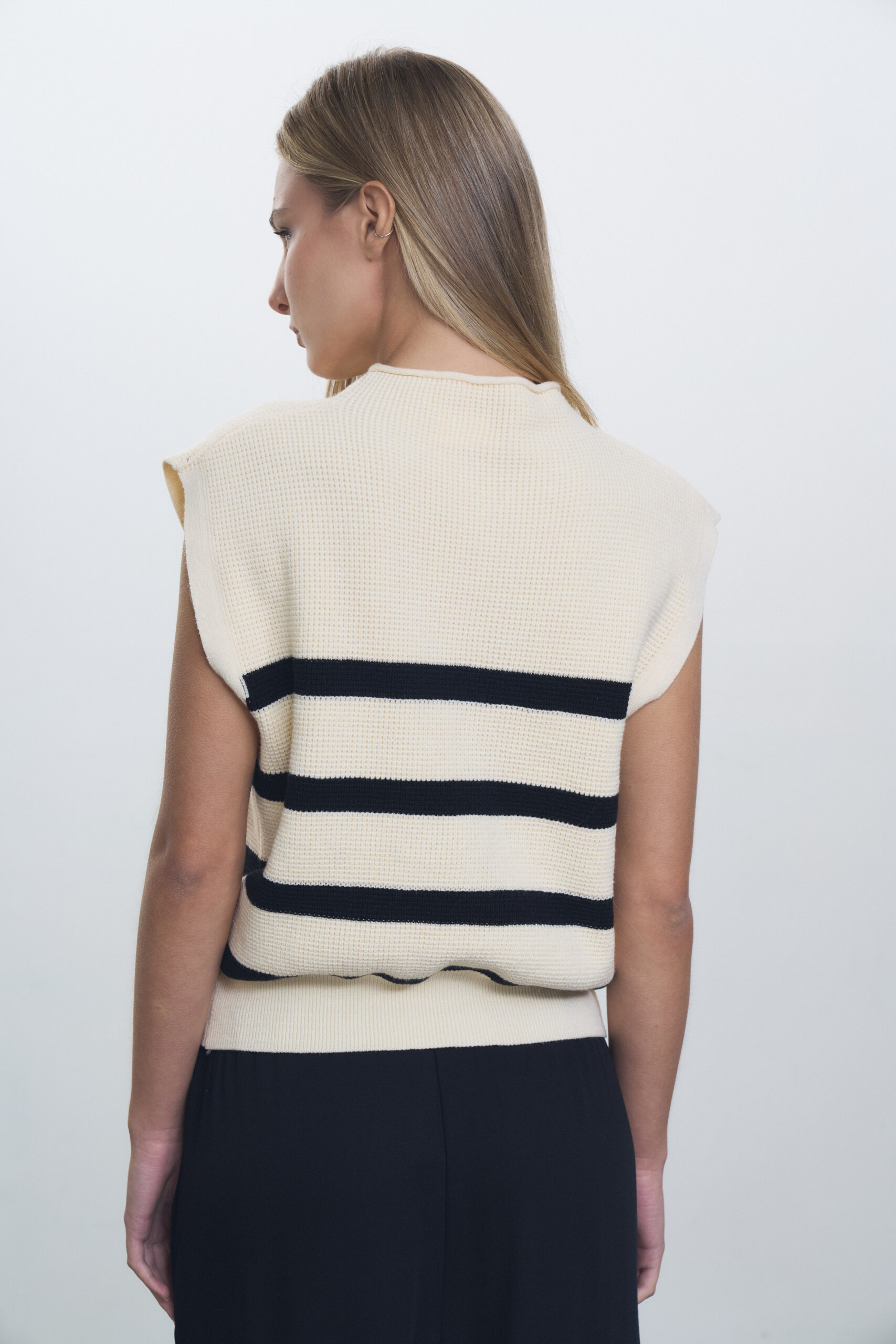 Chaleco tejido en punto ingles, media polera con puño ancho en cintura rayado.