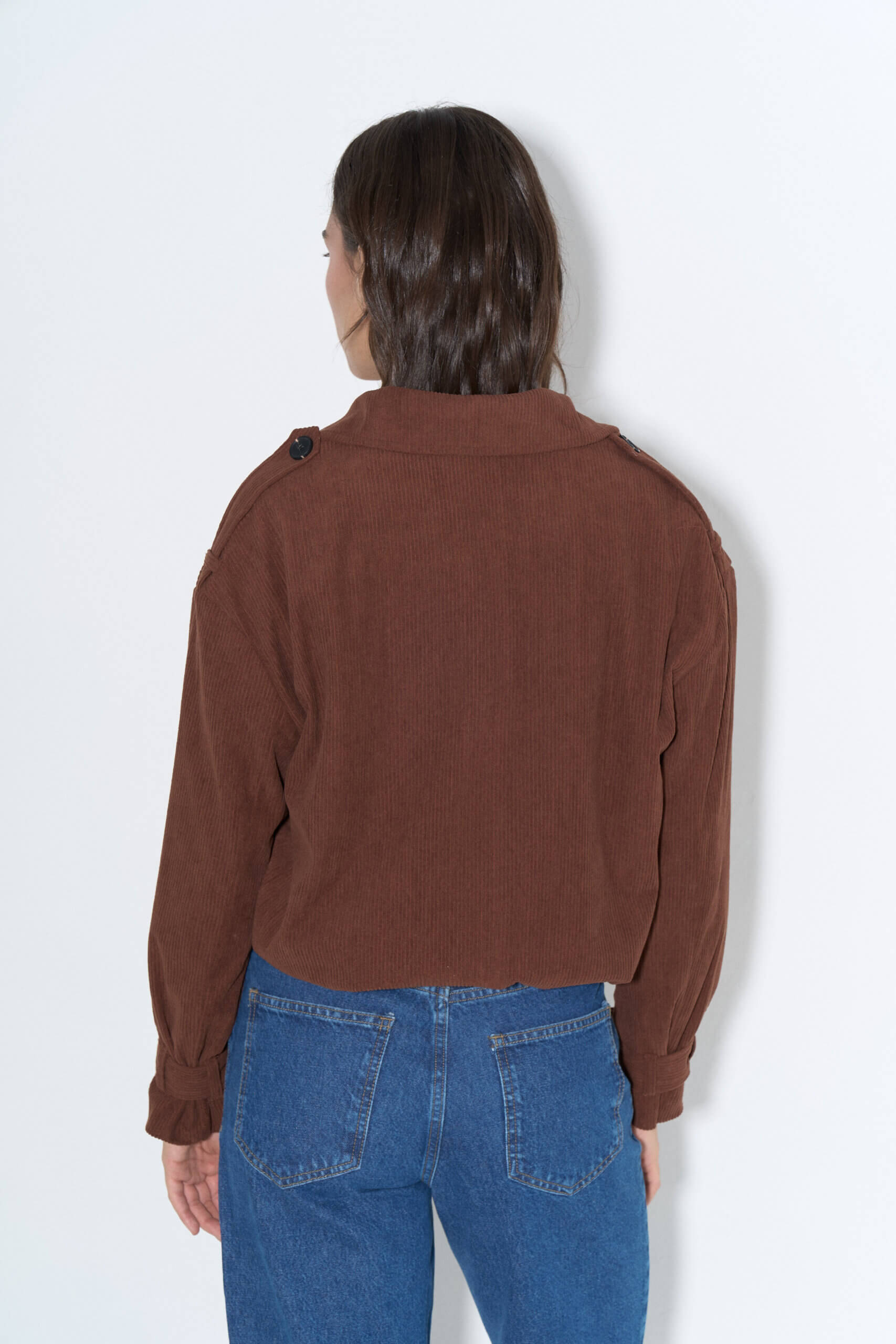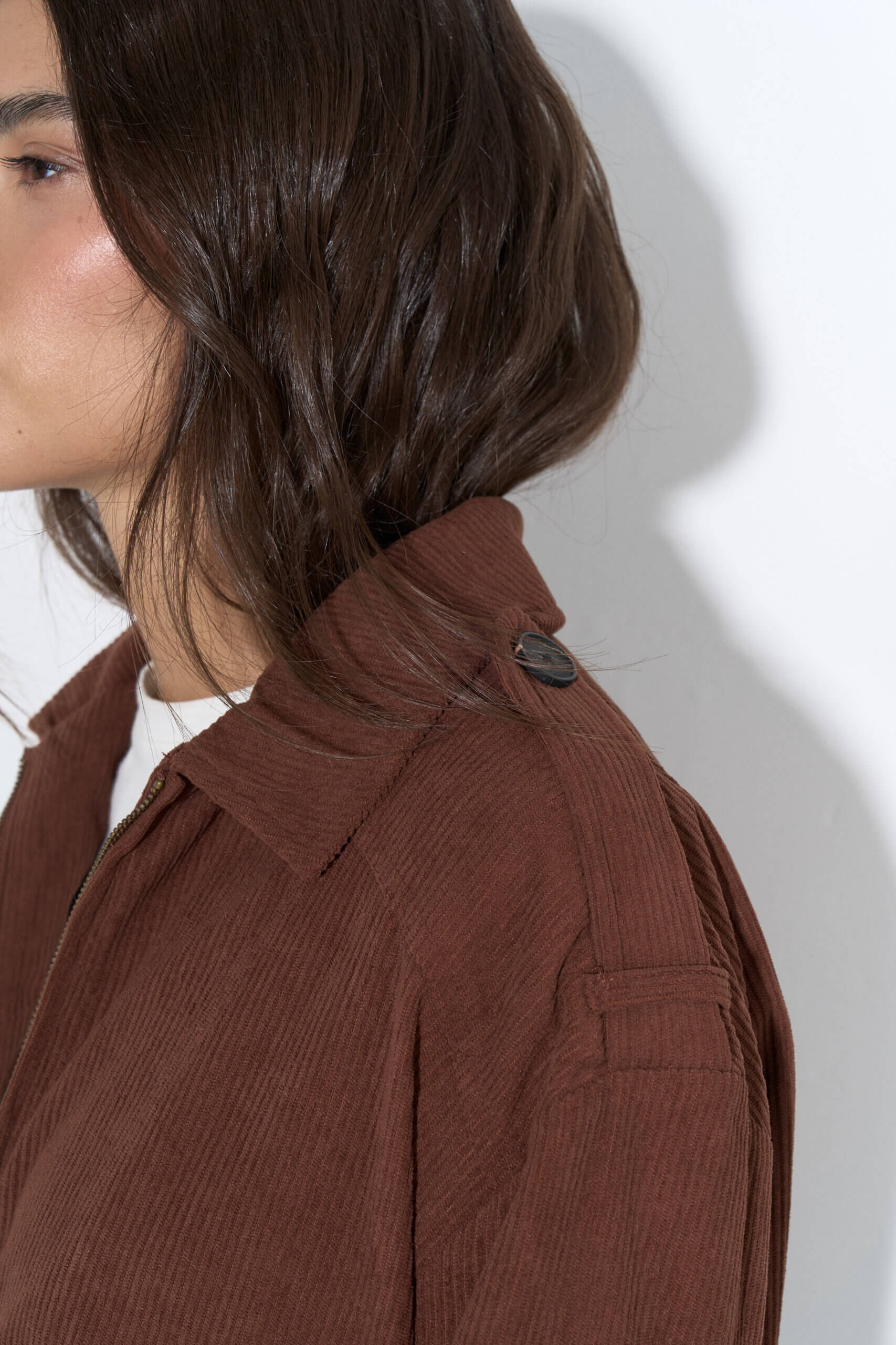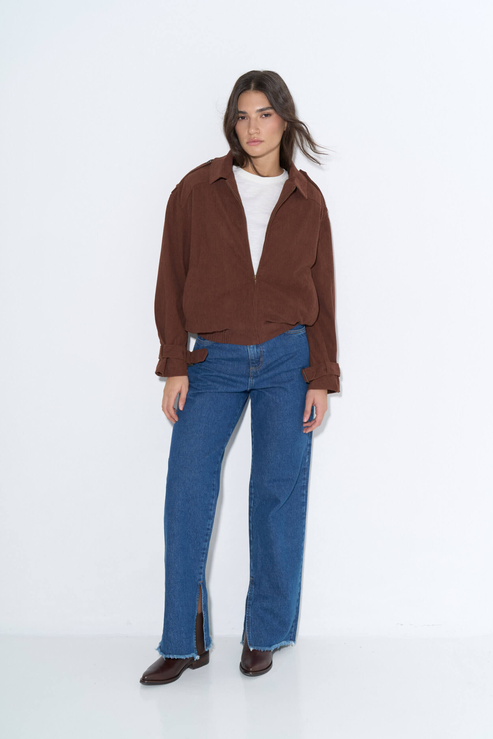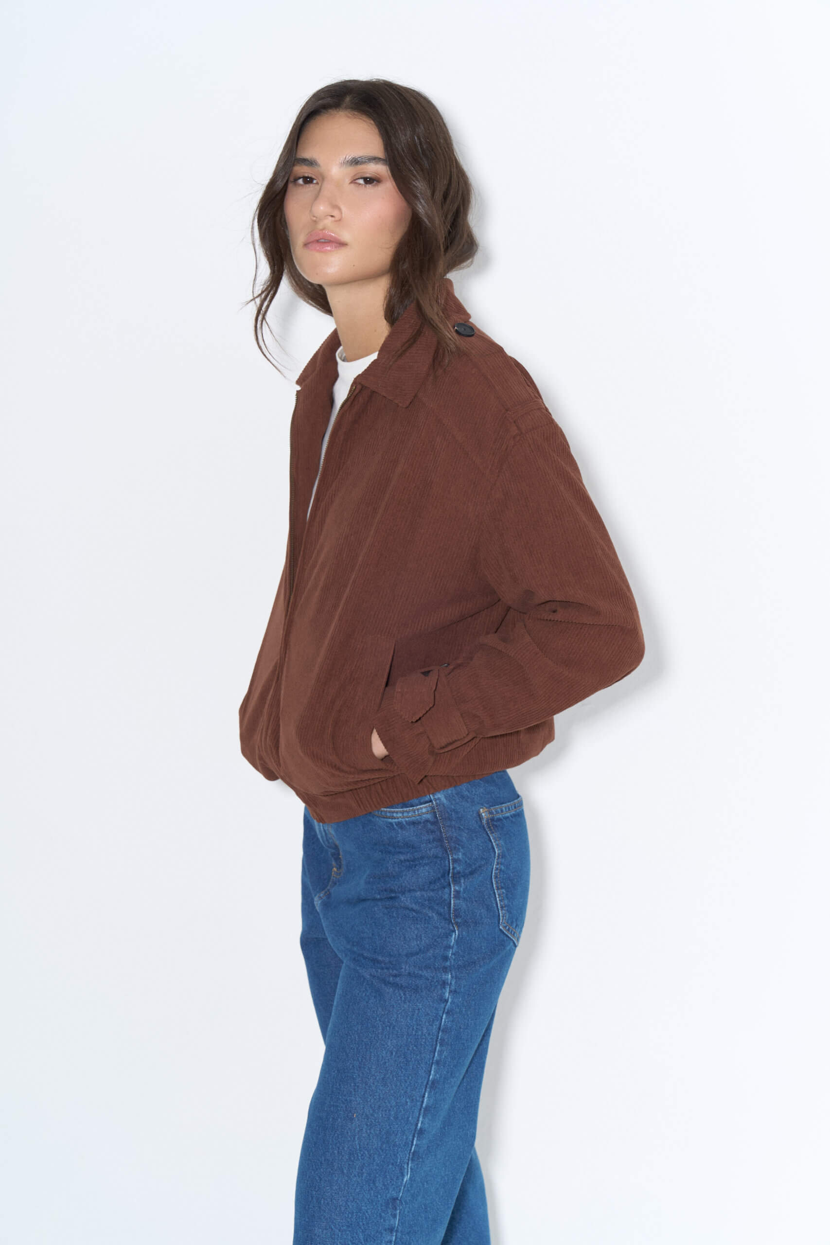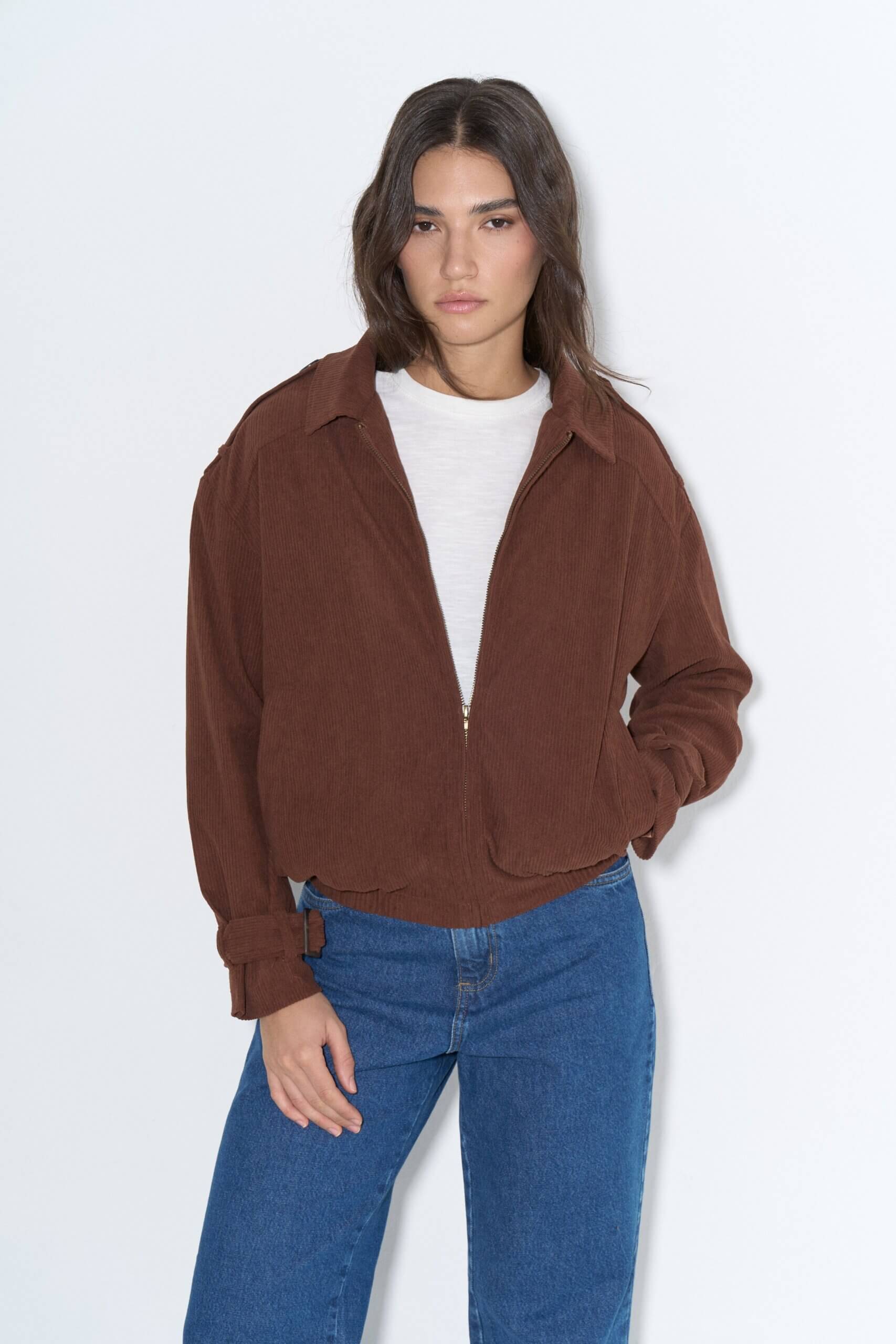 Chaqueta de corderoy tipo bomber con cierre y charreteras en muñecas y hombros.