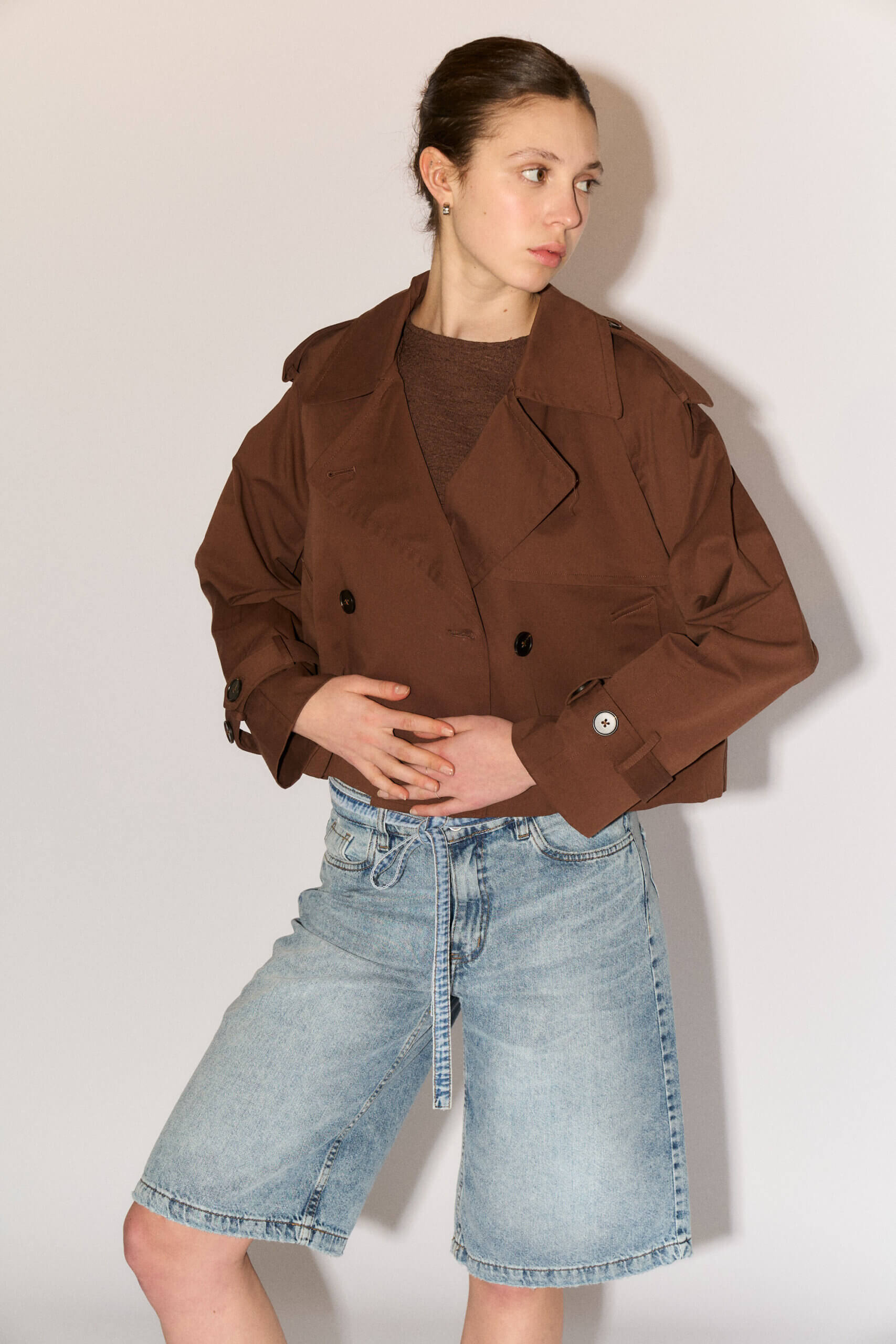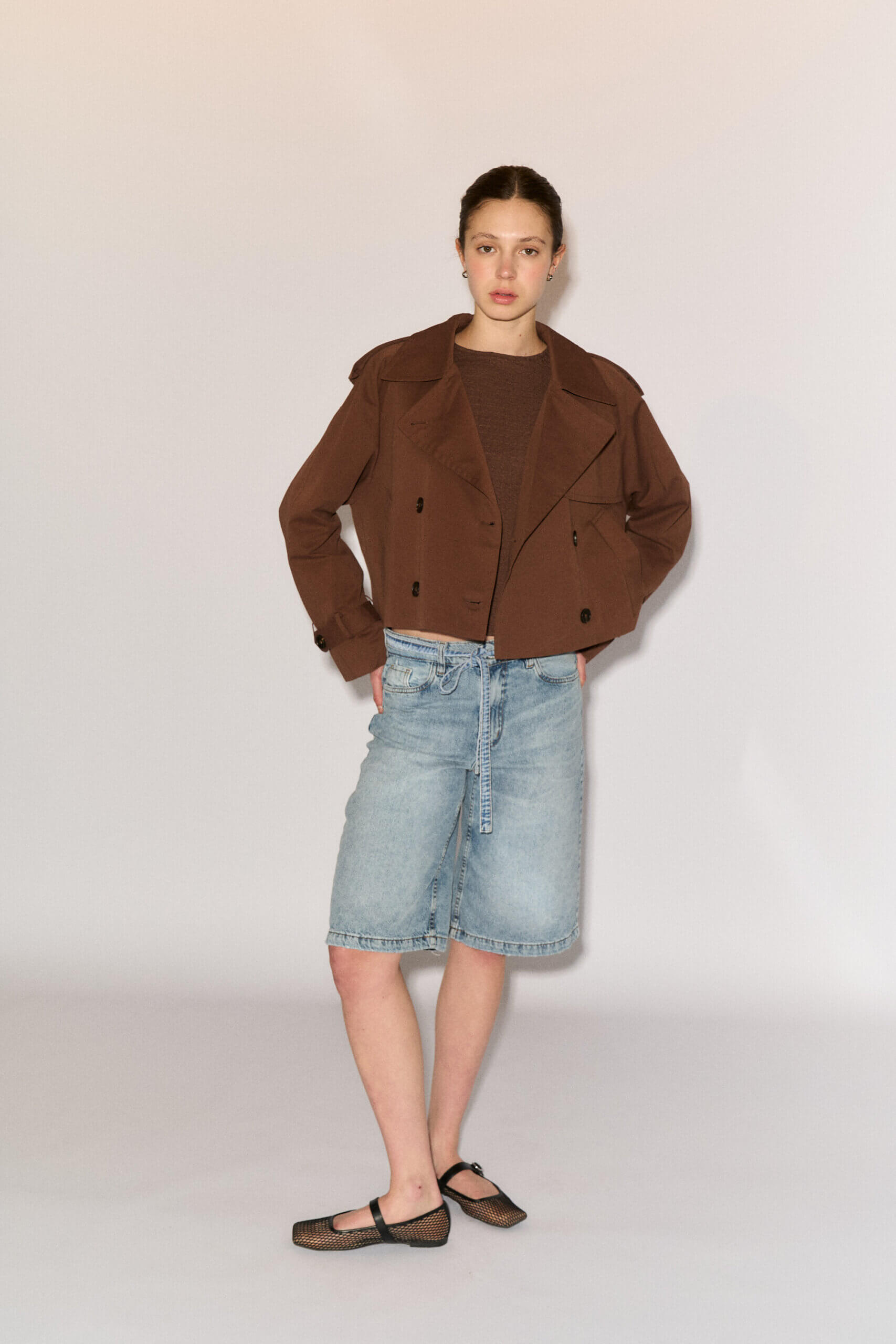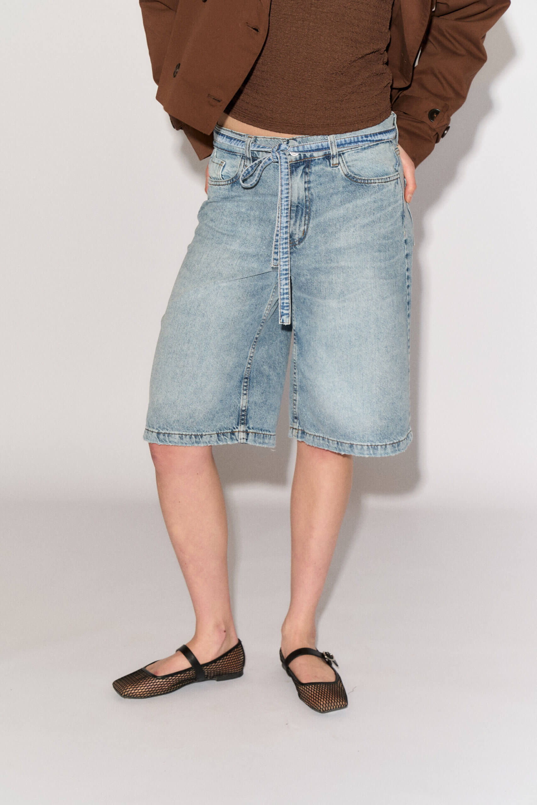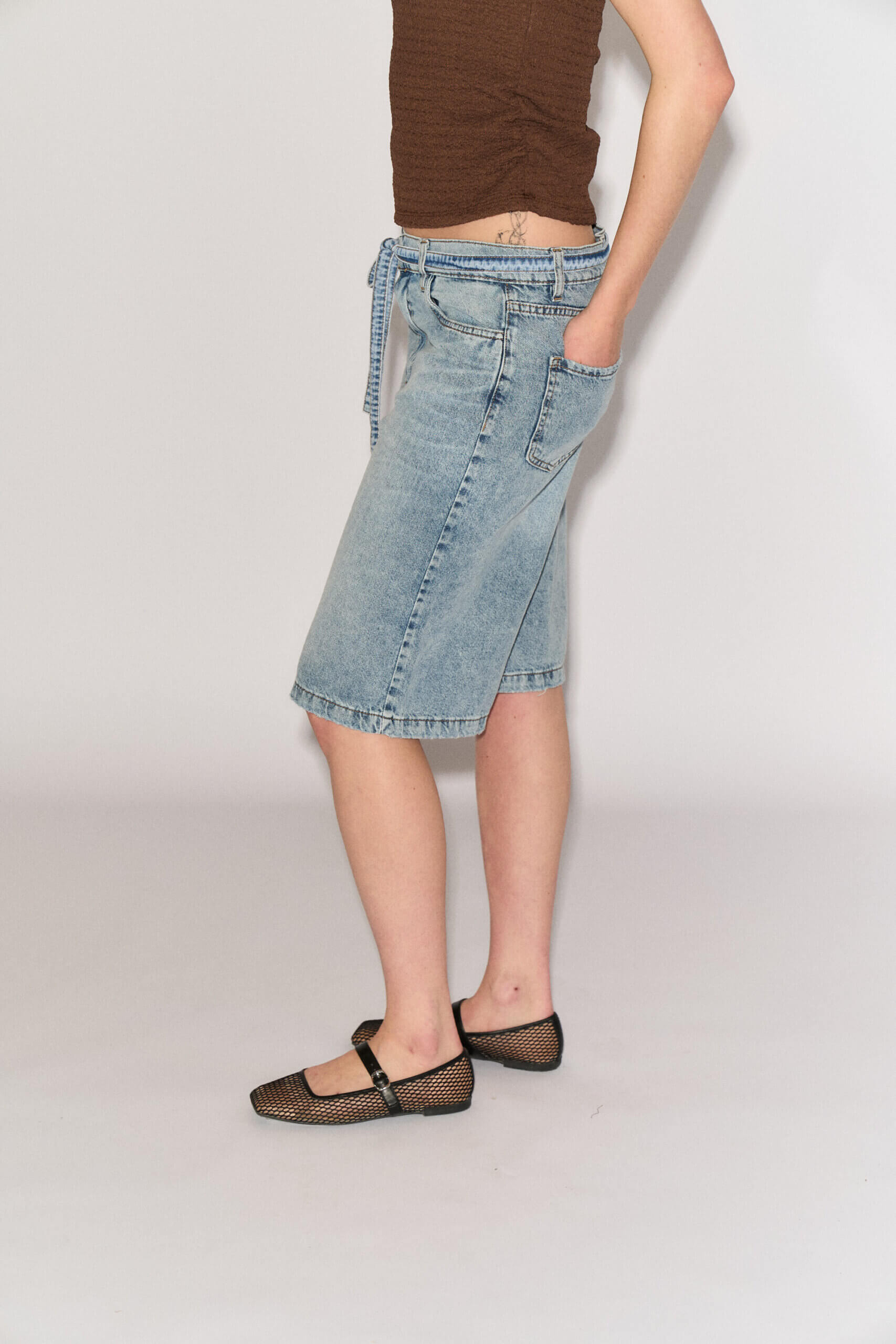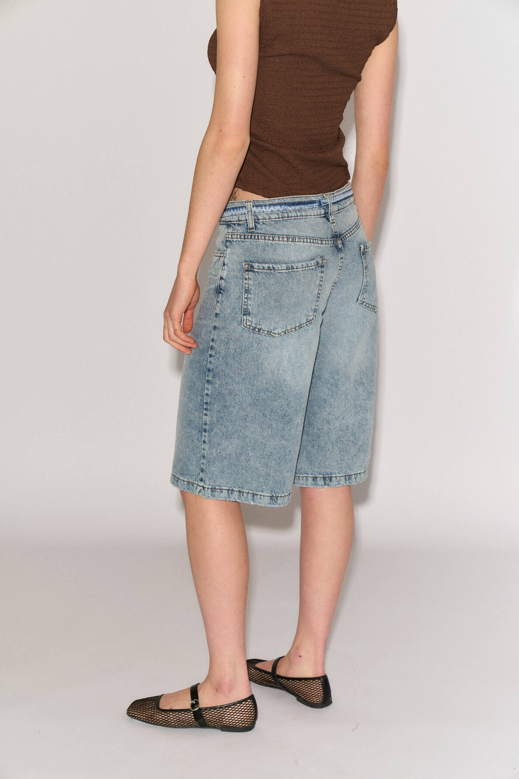 Jort bermuda de denim rígido, con lazo en cintura, 5 bolsillos y ruedo ancho.
