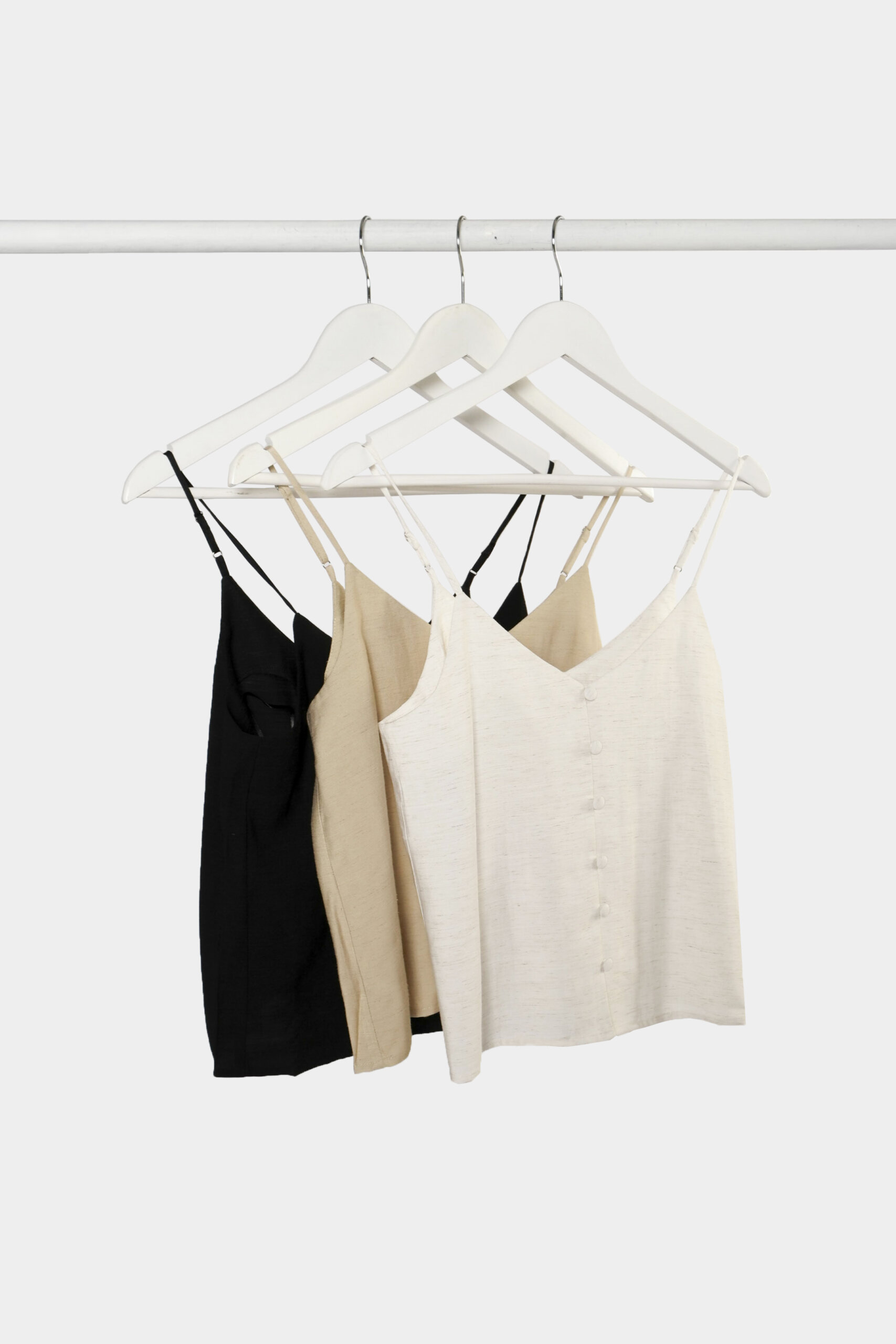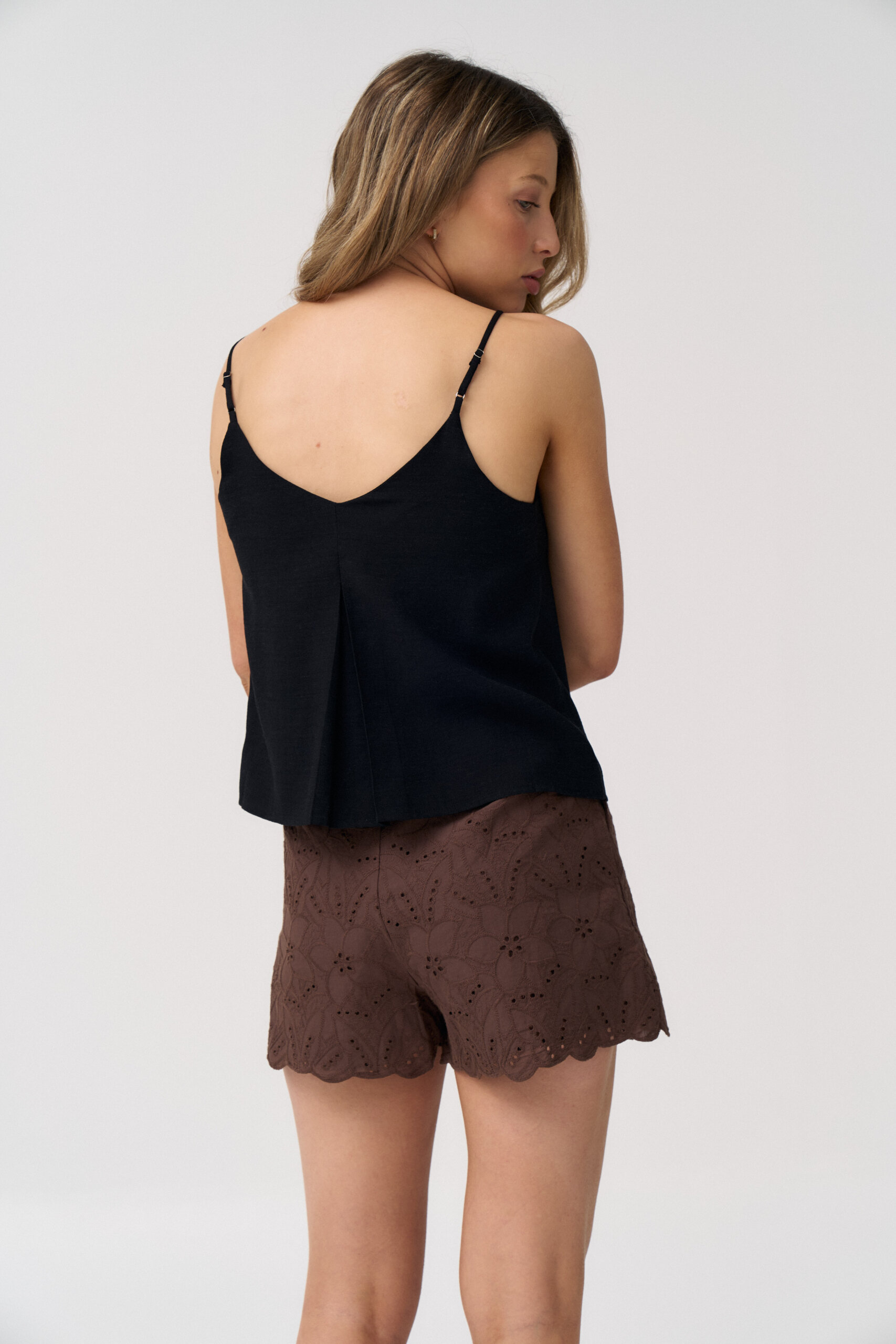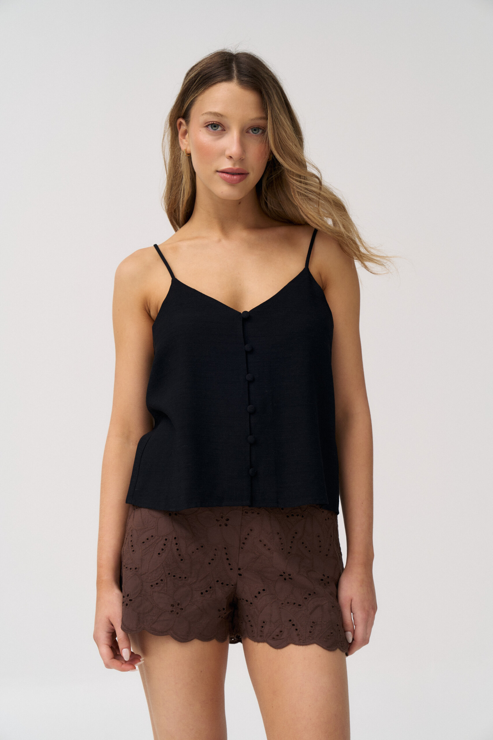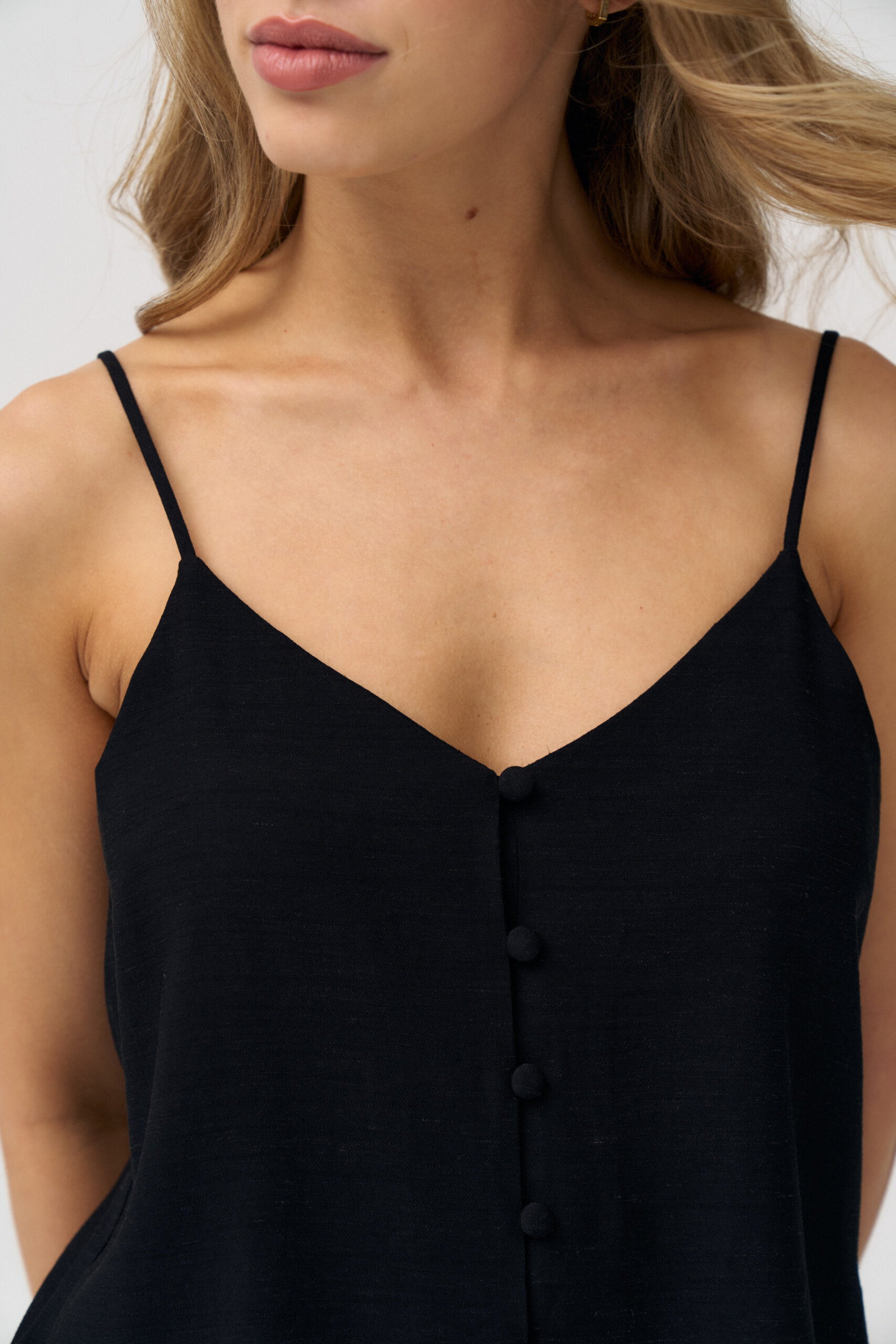 Musculosa de lino rayon con botones forrados y pliegue en espalda.