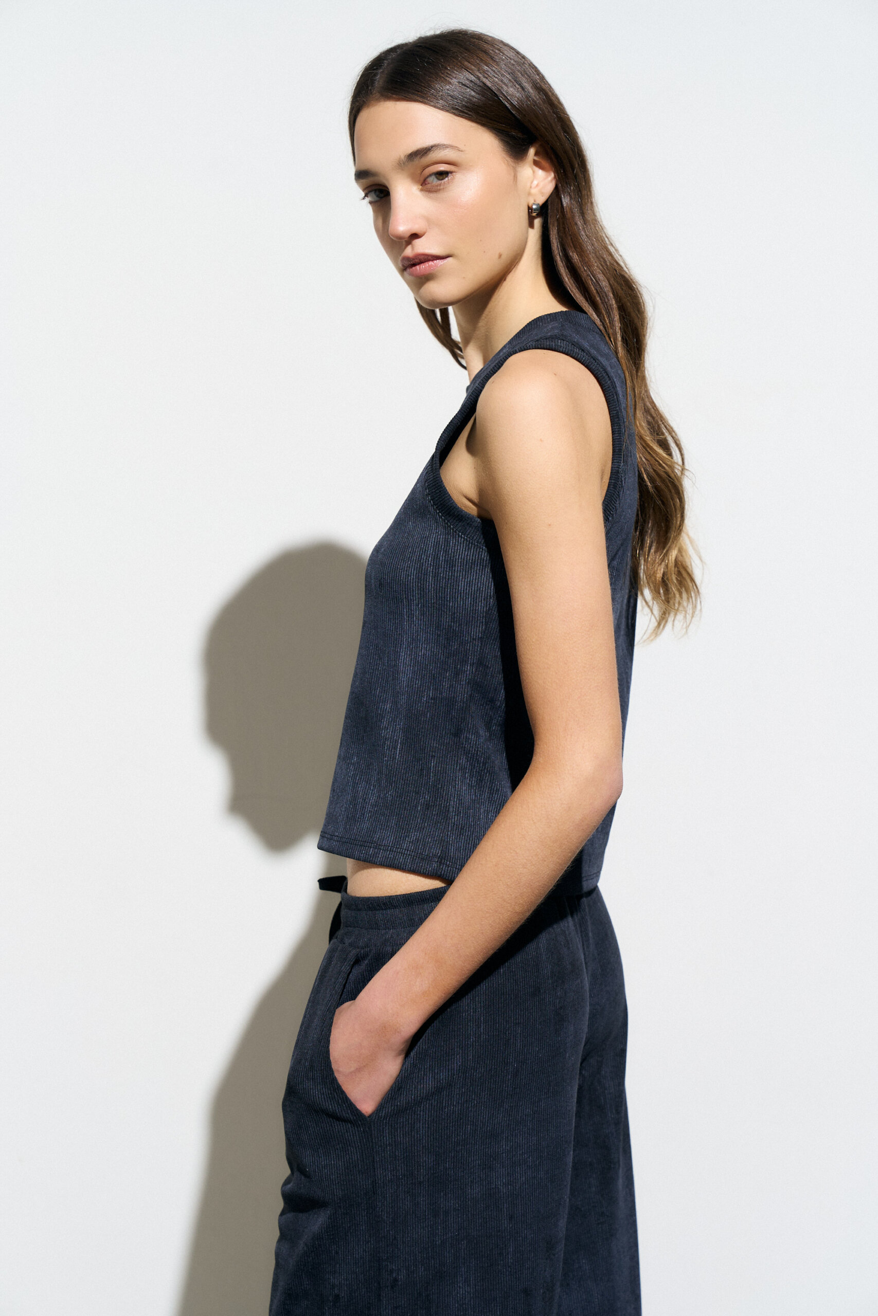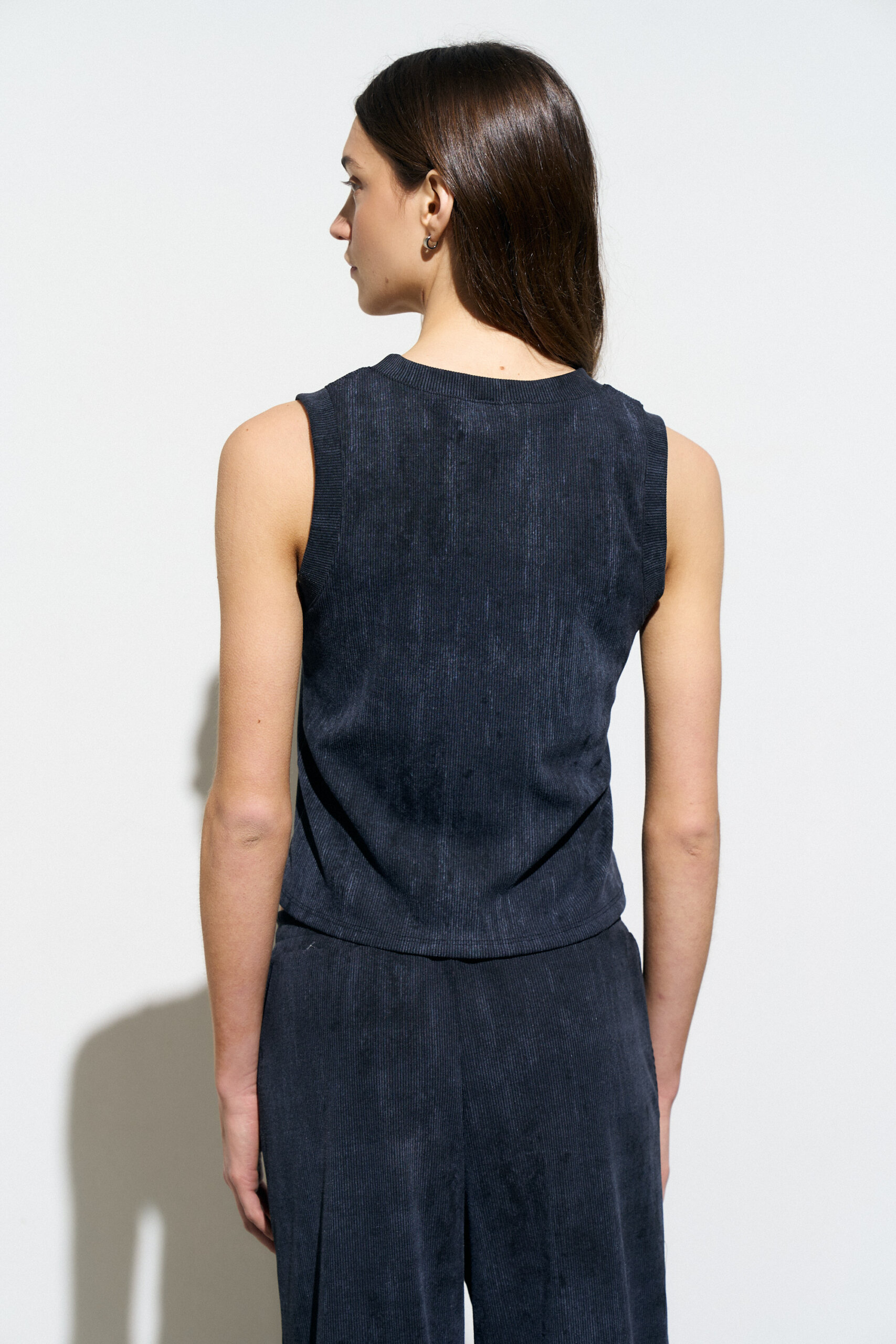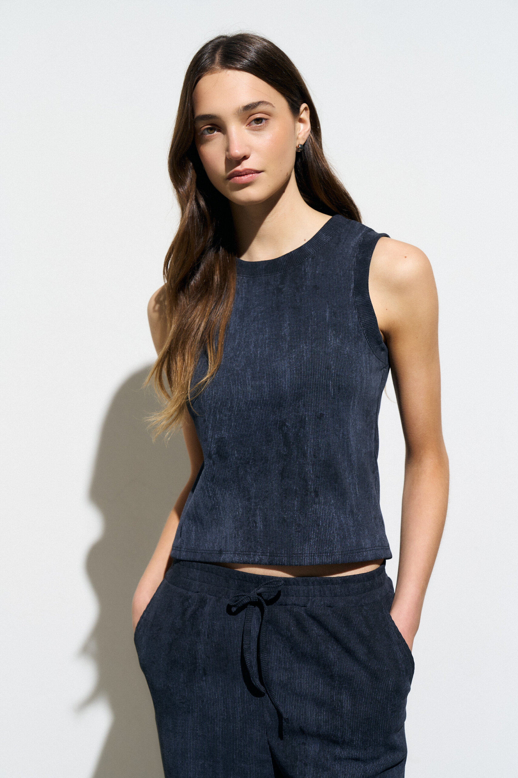 Musculosa de fit clasico con escote redondo. Confeccionada en morley con efecto vintage batik.