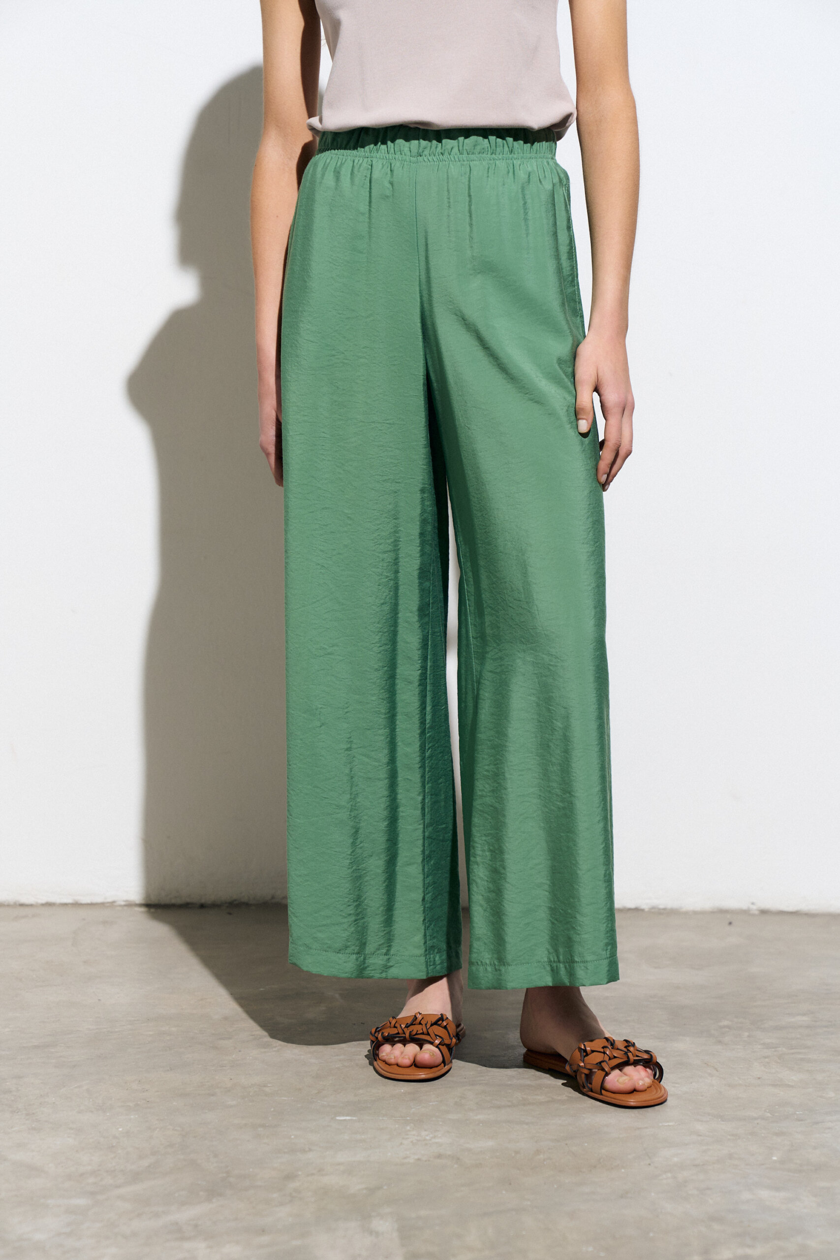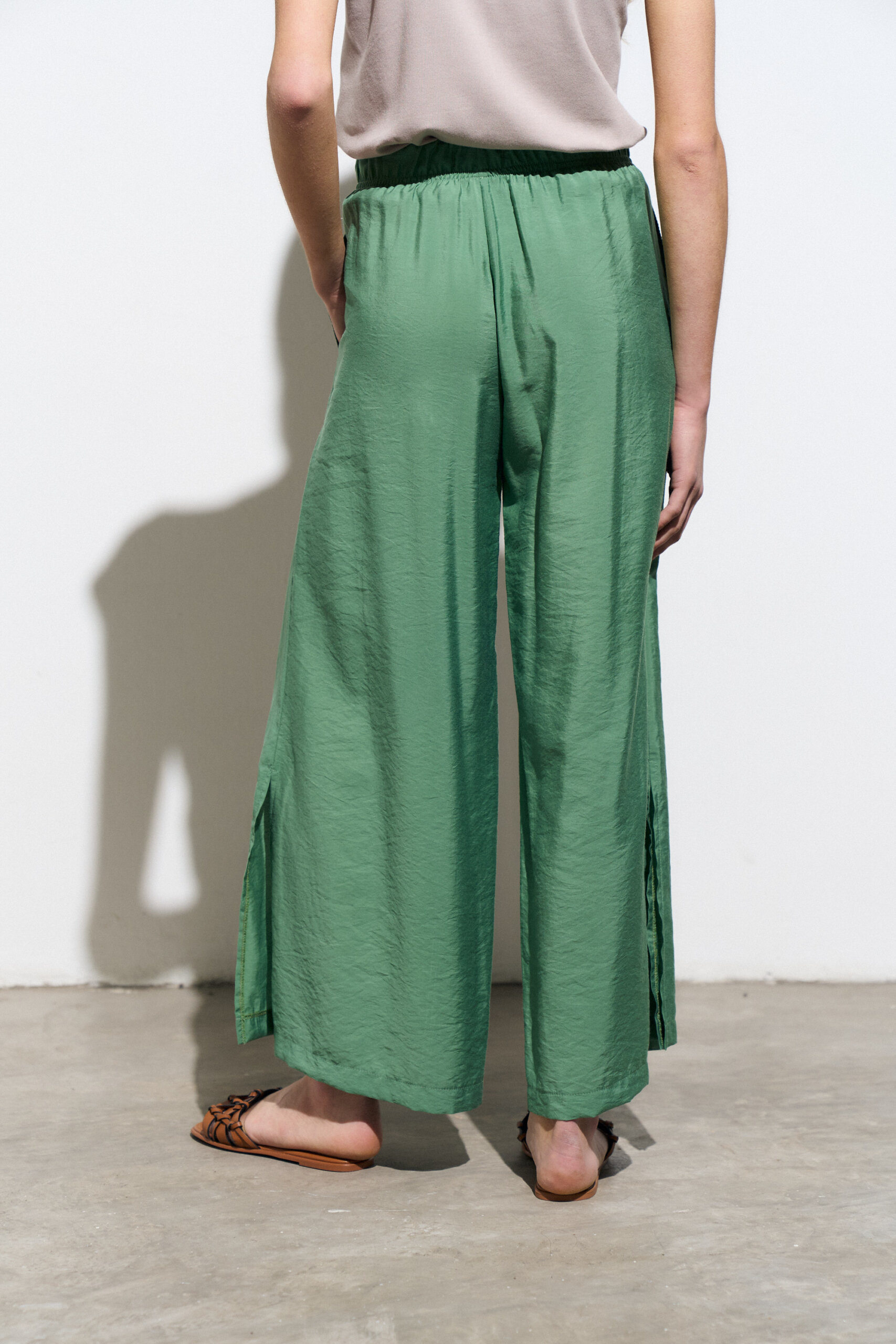 Pantalon palazzo con cintura elastizada y bolsillos laterales. Confeccionado en viscosa satinada.