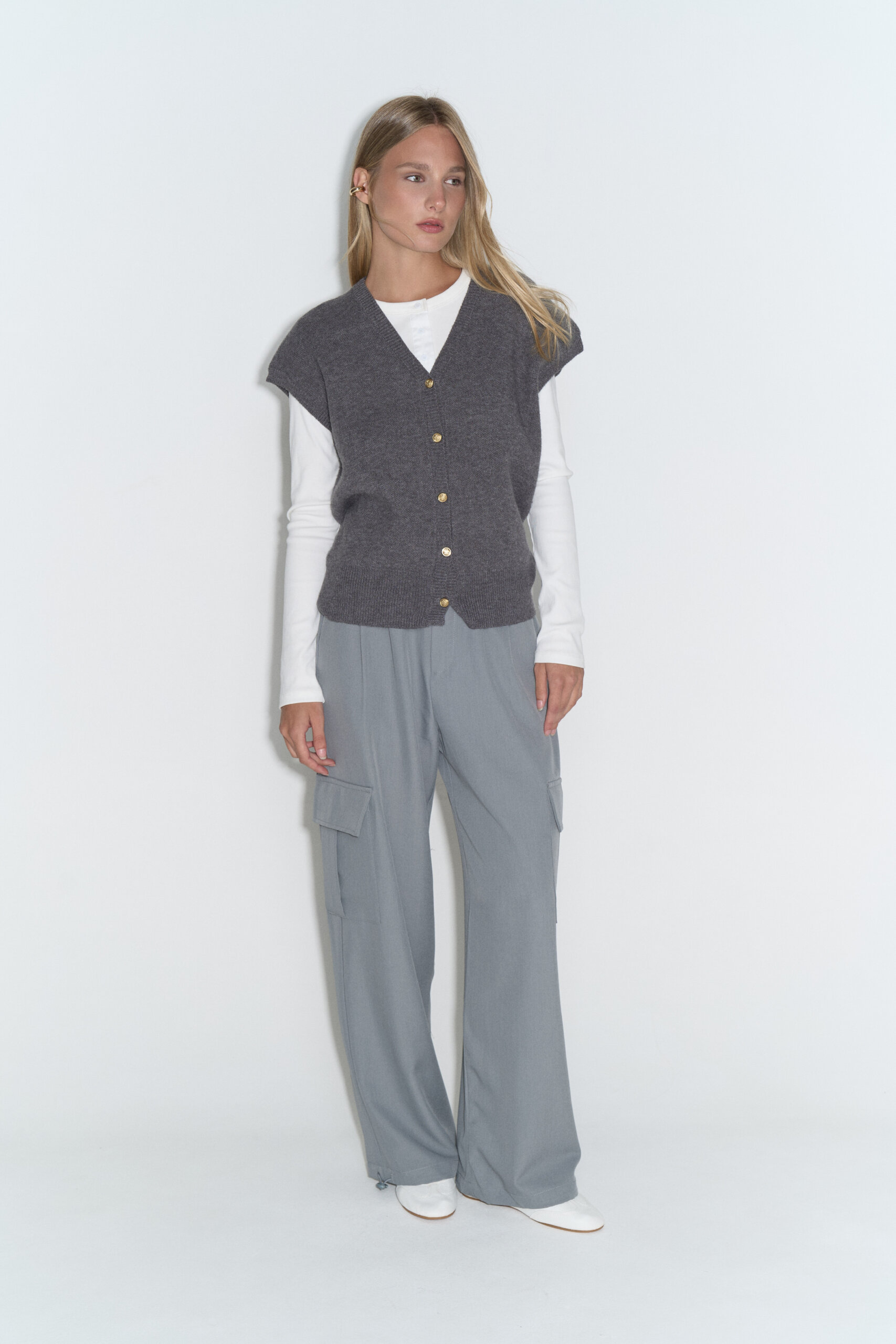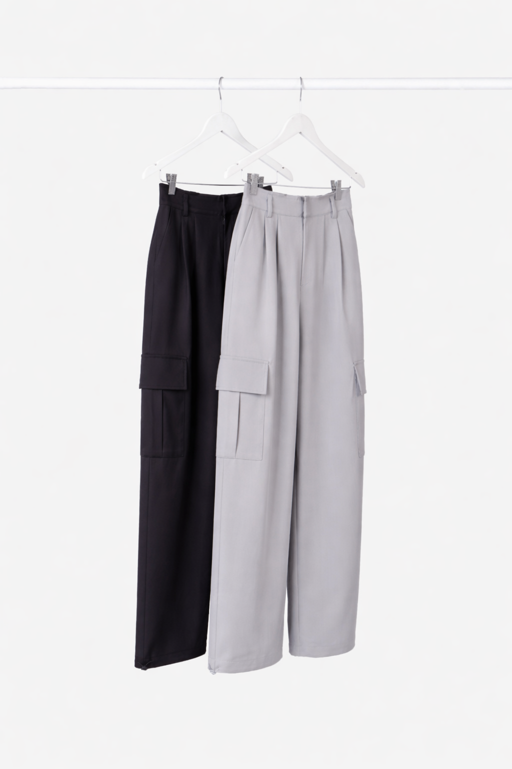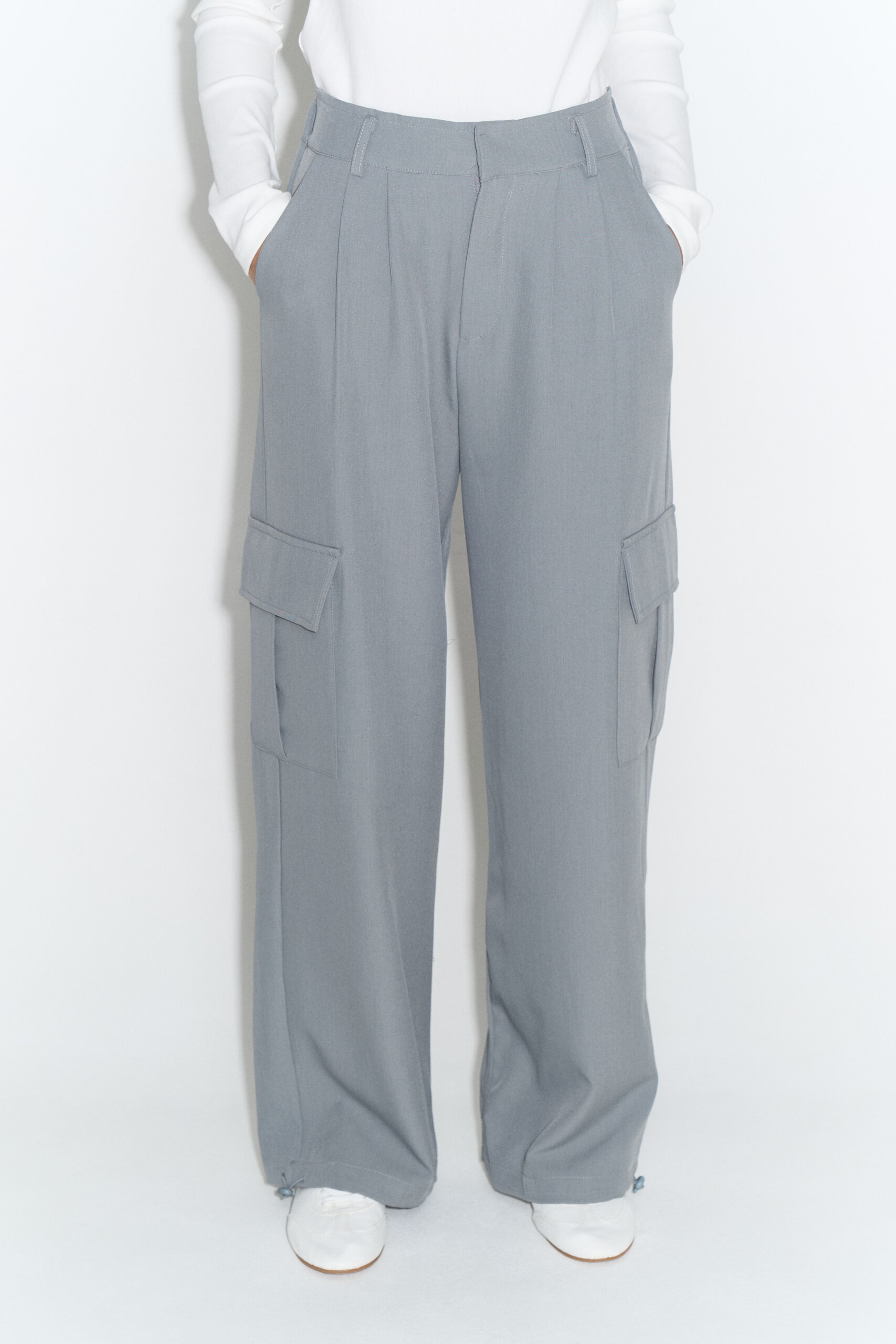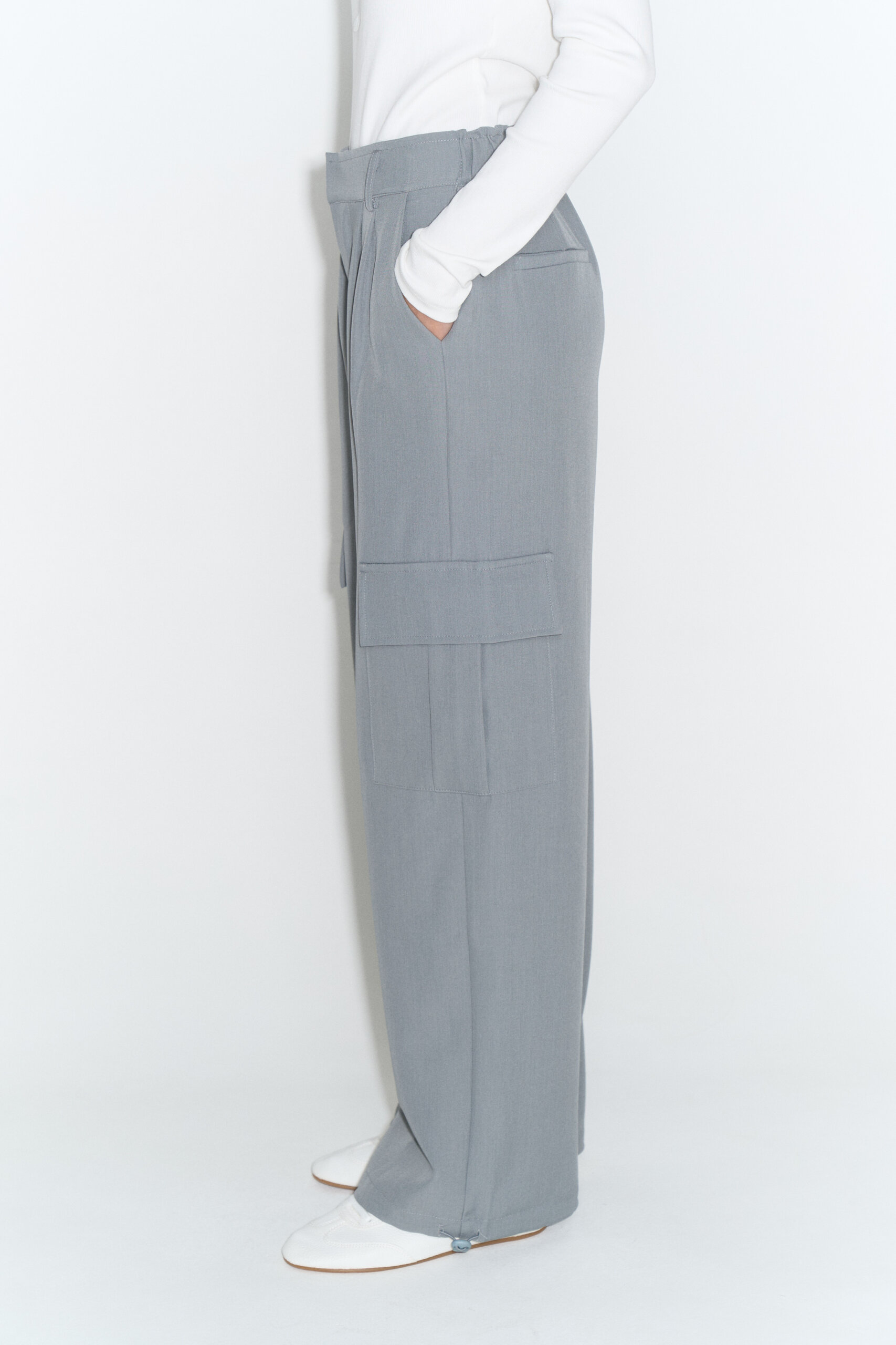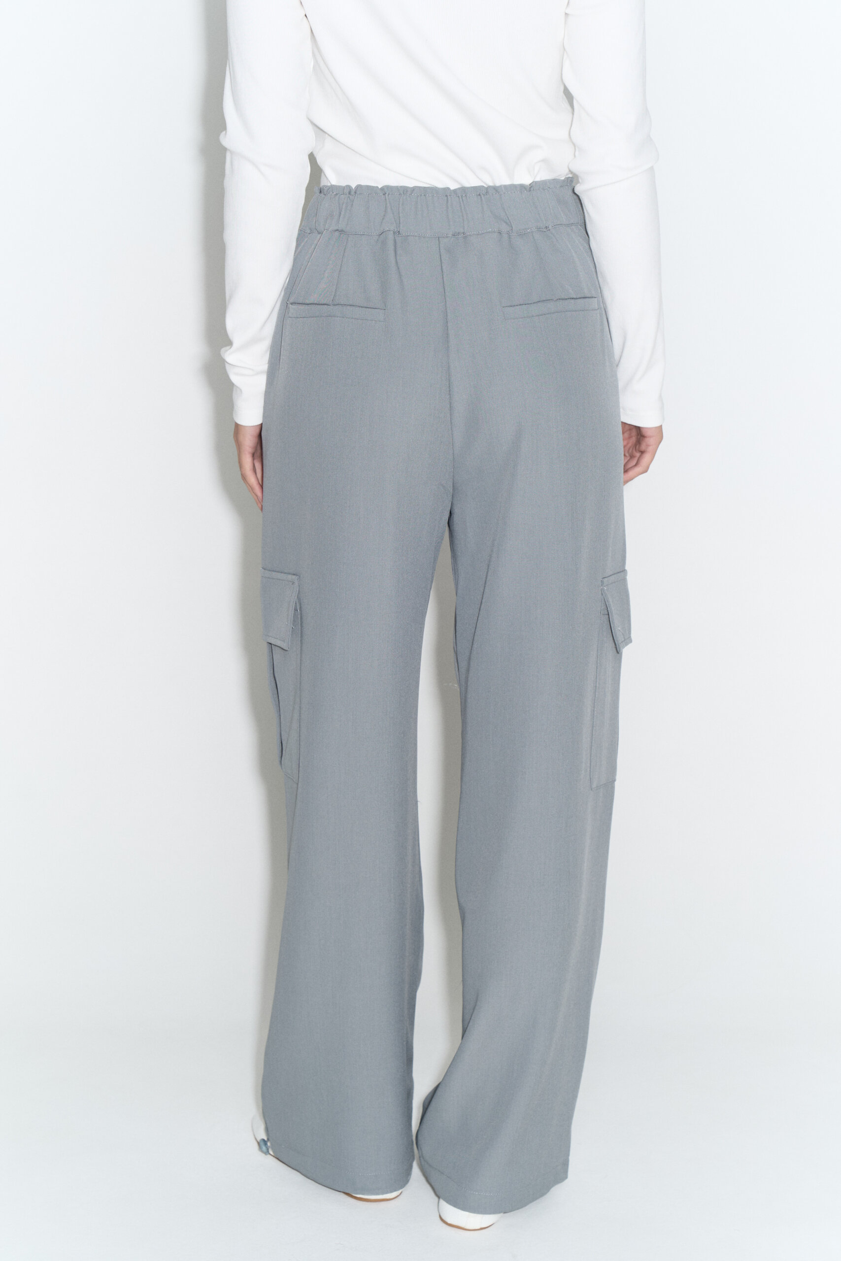 Pantalón de tela sastrera con bolsillos cargo, pinzas y cintura trasera elastizada.