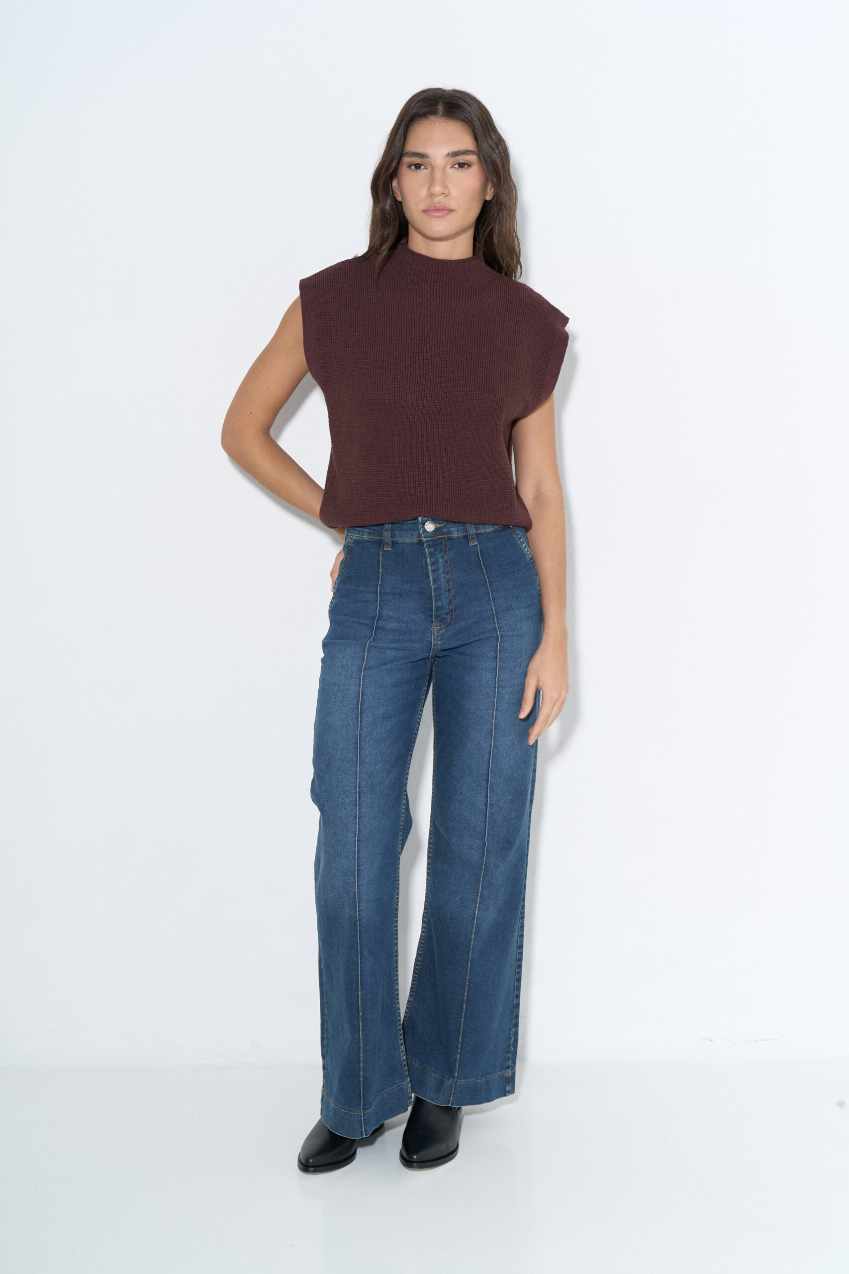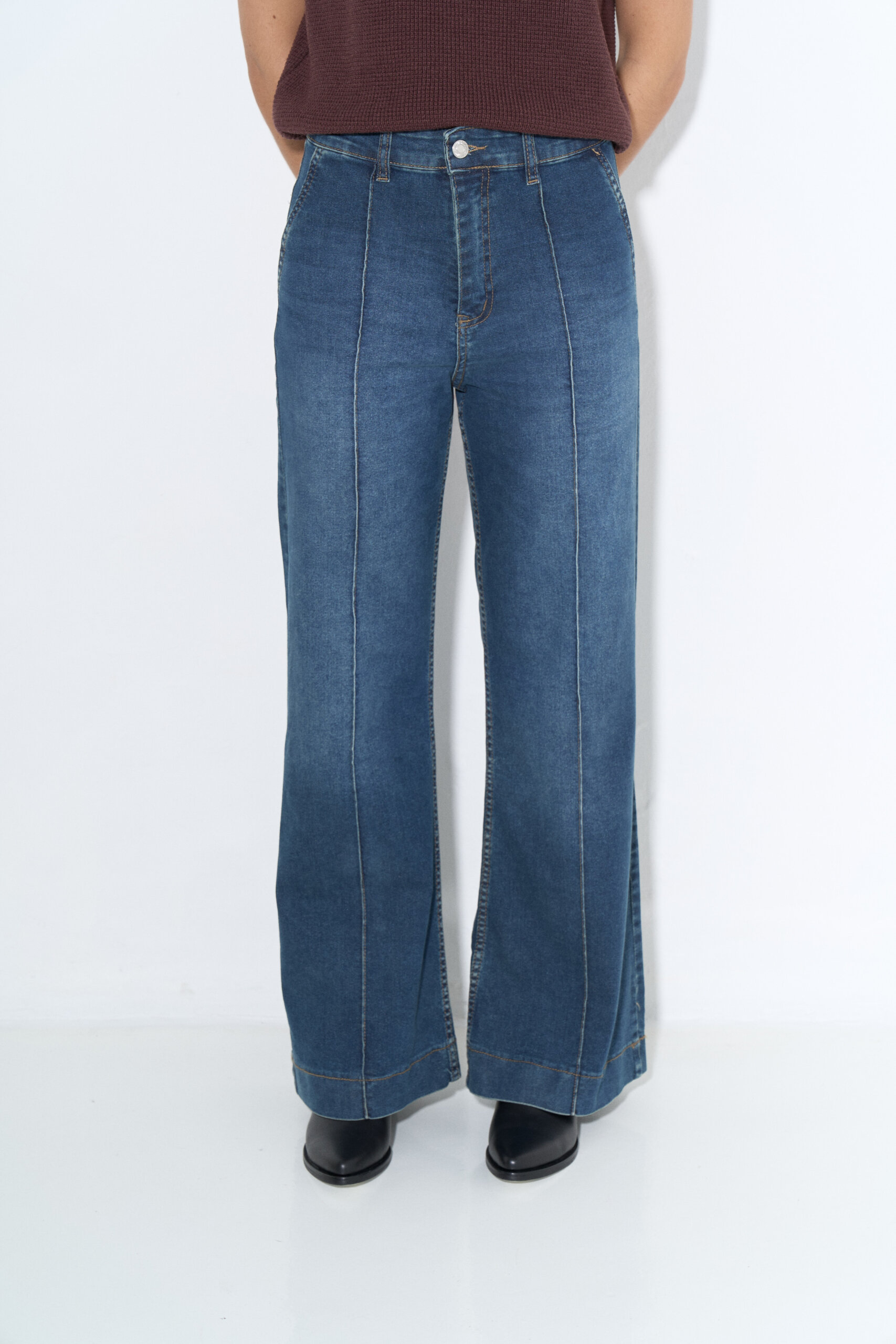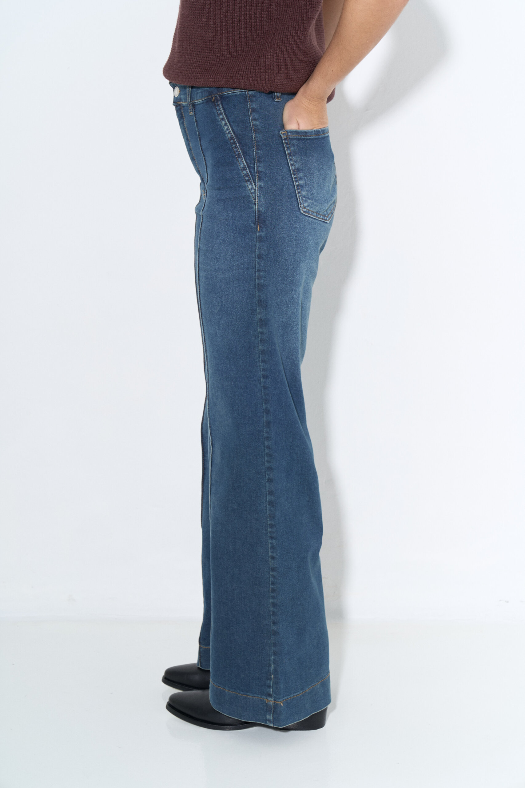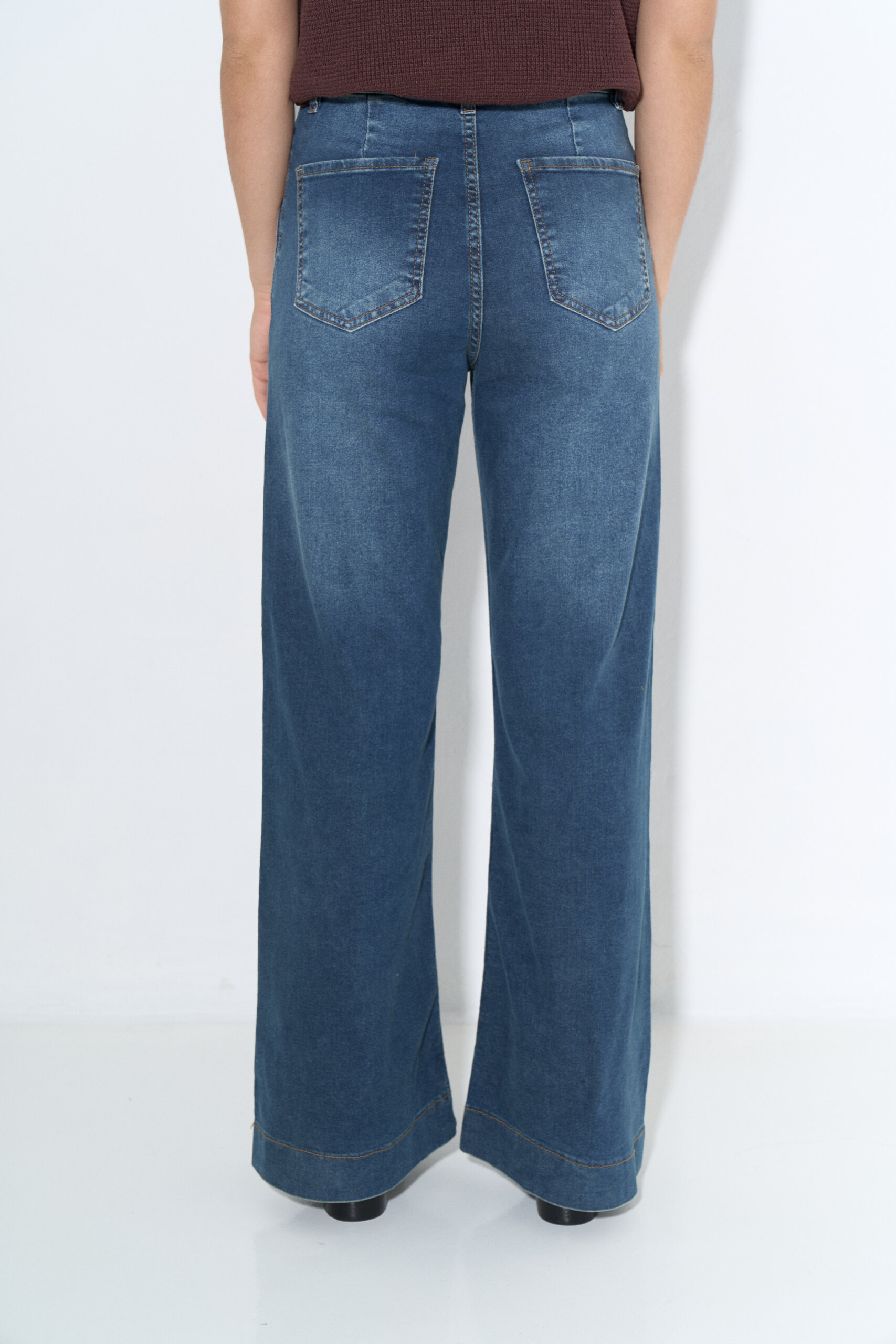 Pantalon wide leg en denim elastizado con alforzas en delantero y bolsillos chinos laterales