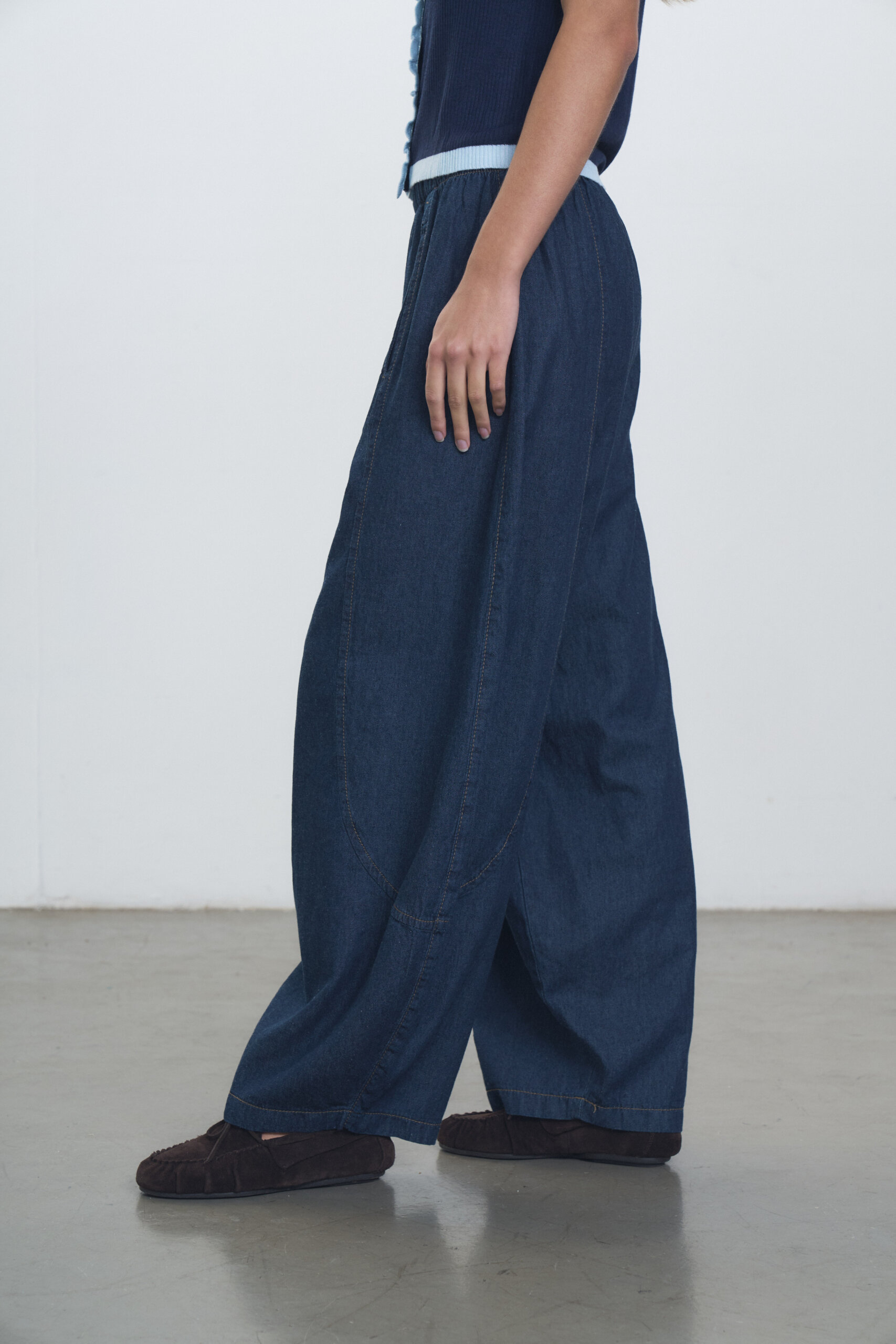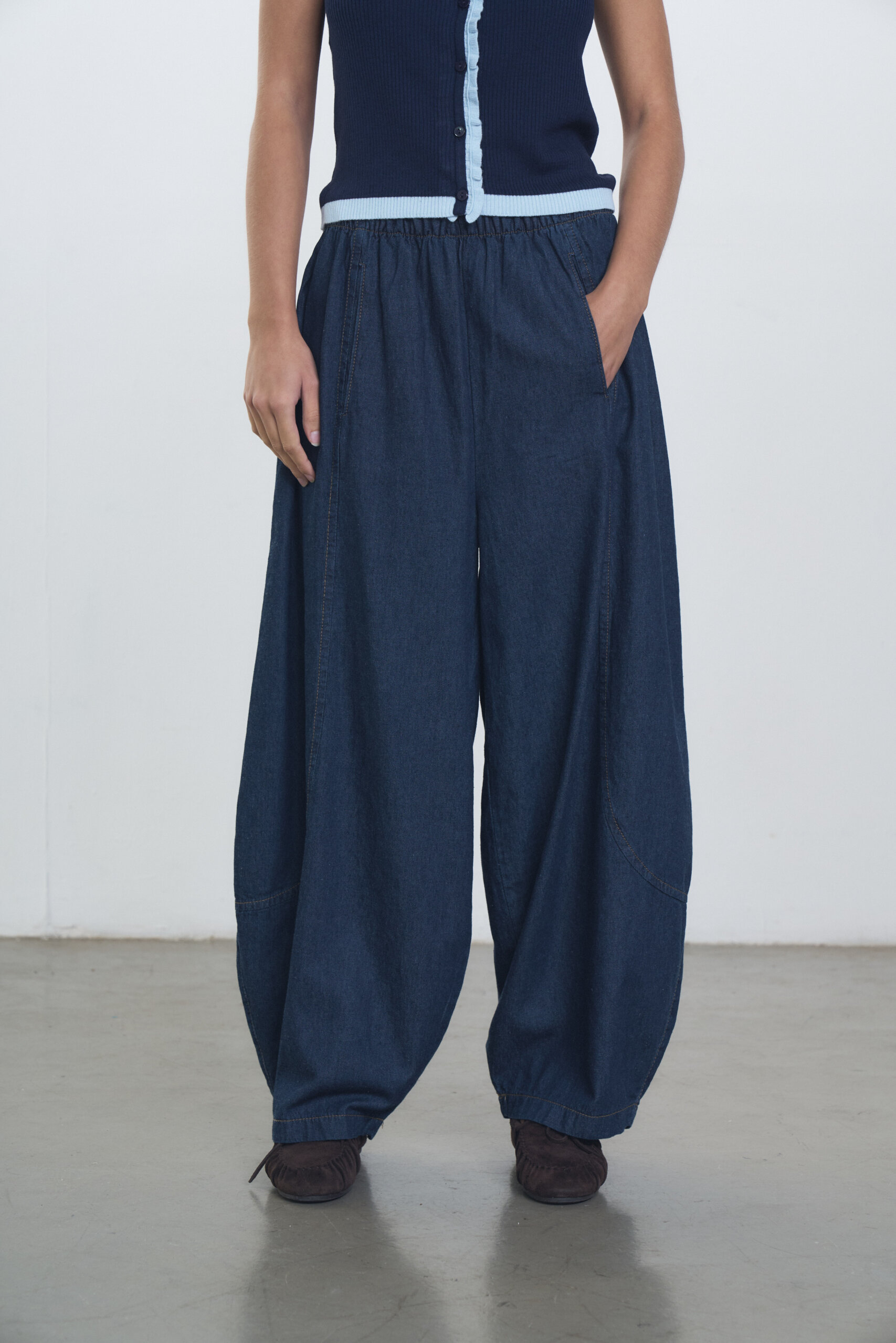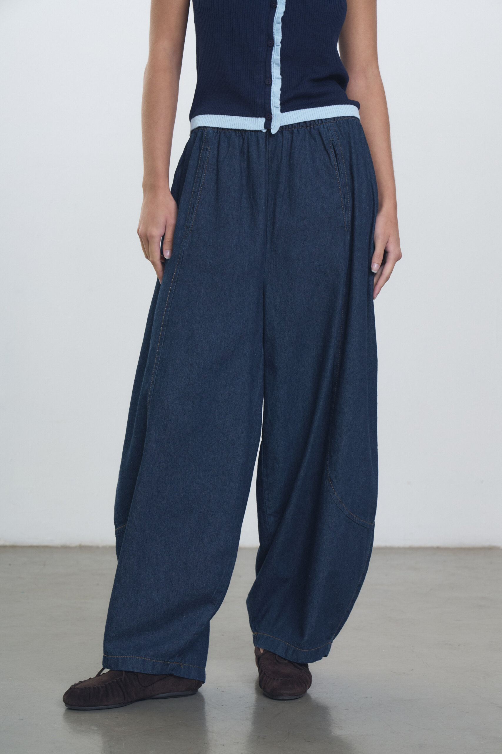 Pantalon babucha en denim camisero con recortes y cintura elastizada. Conjunto con Sweater Marfil