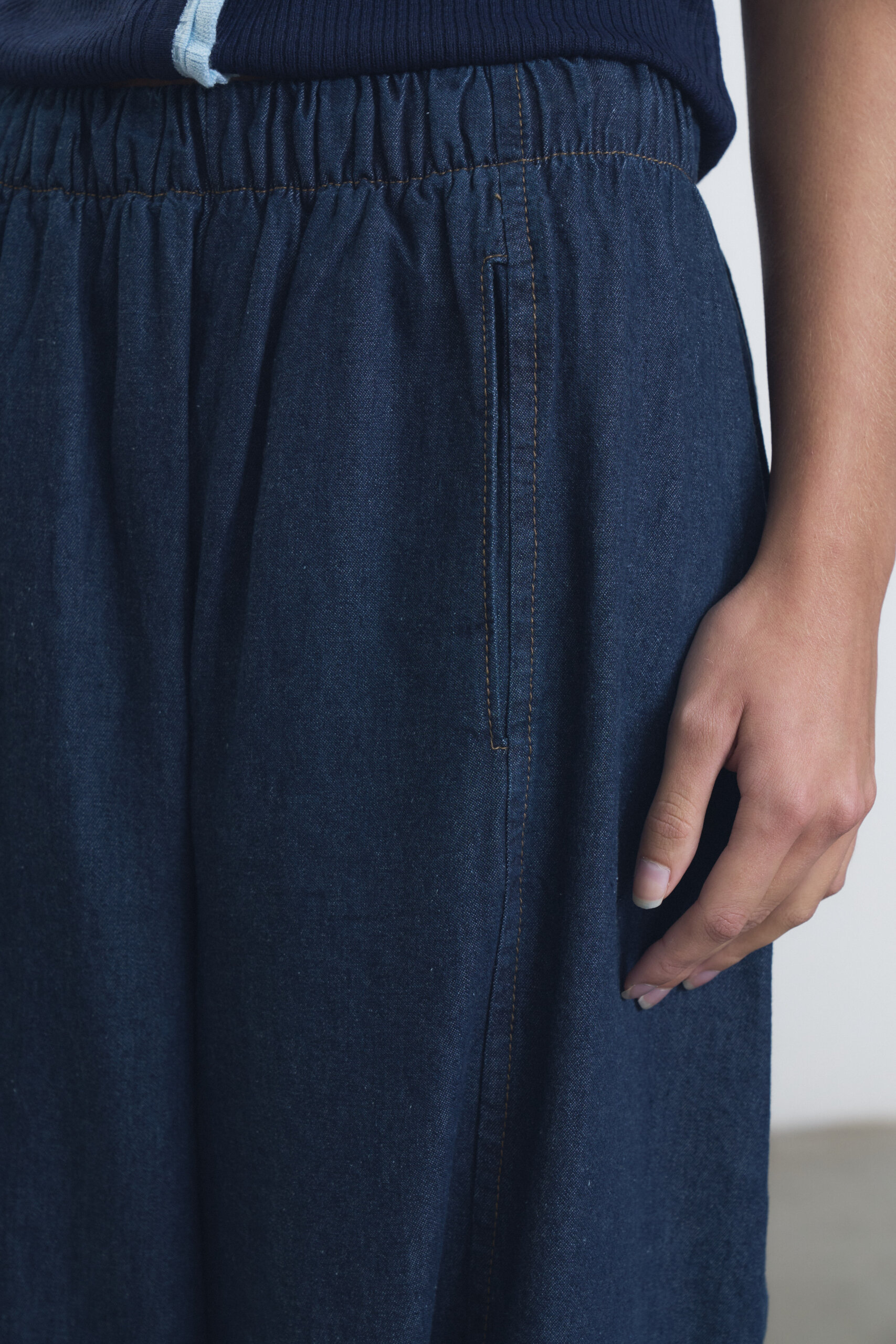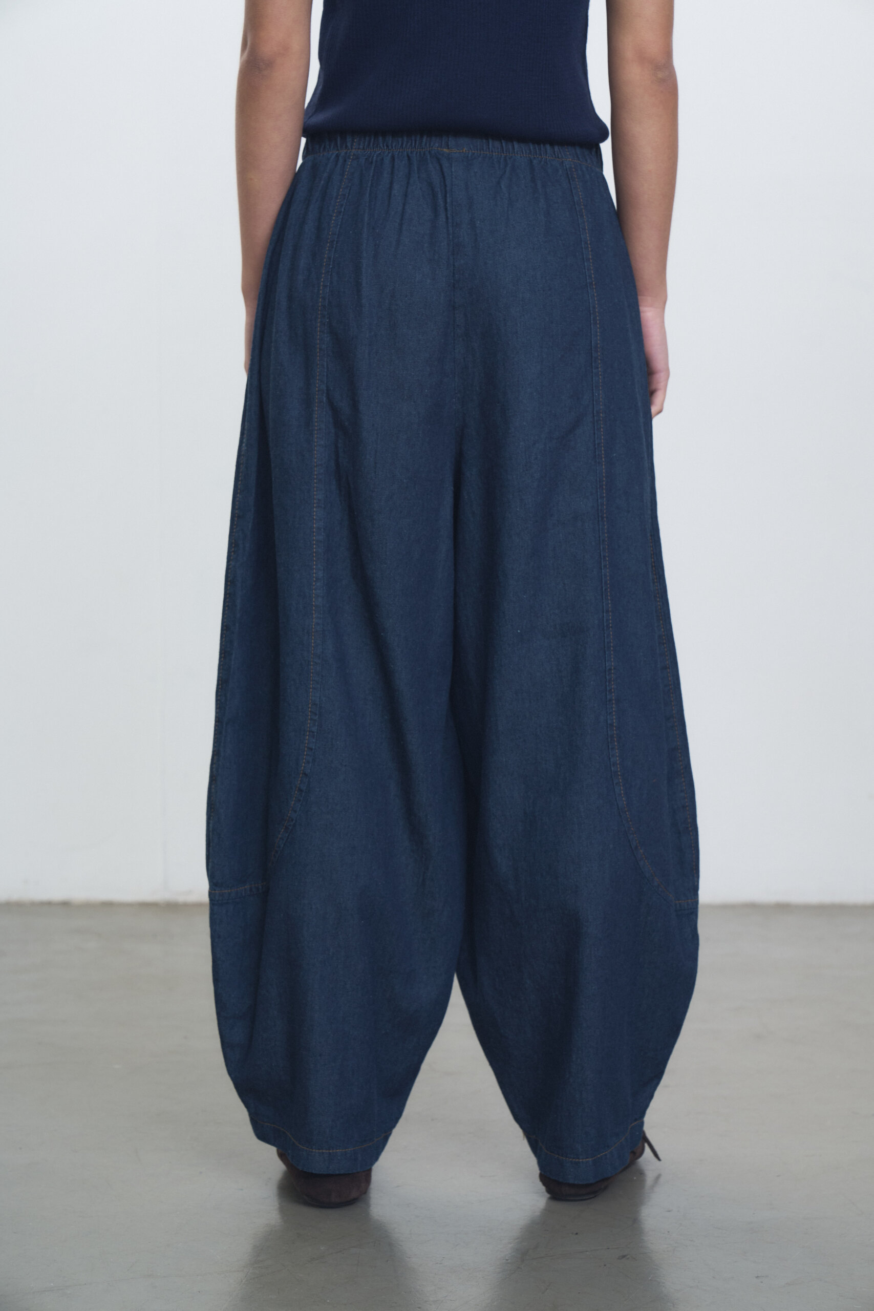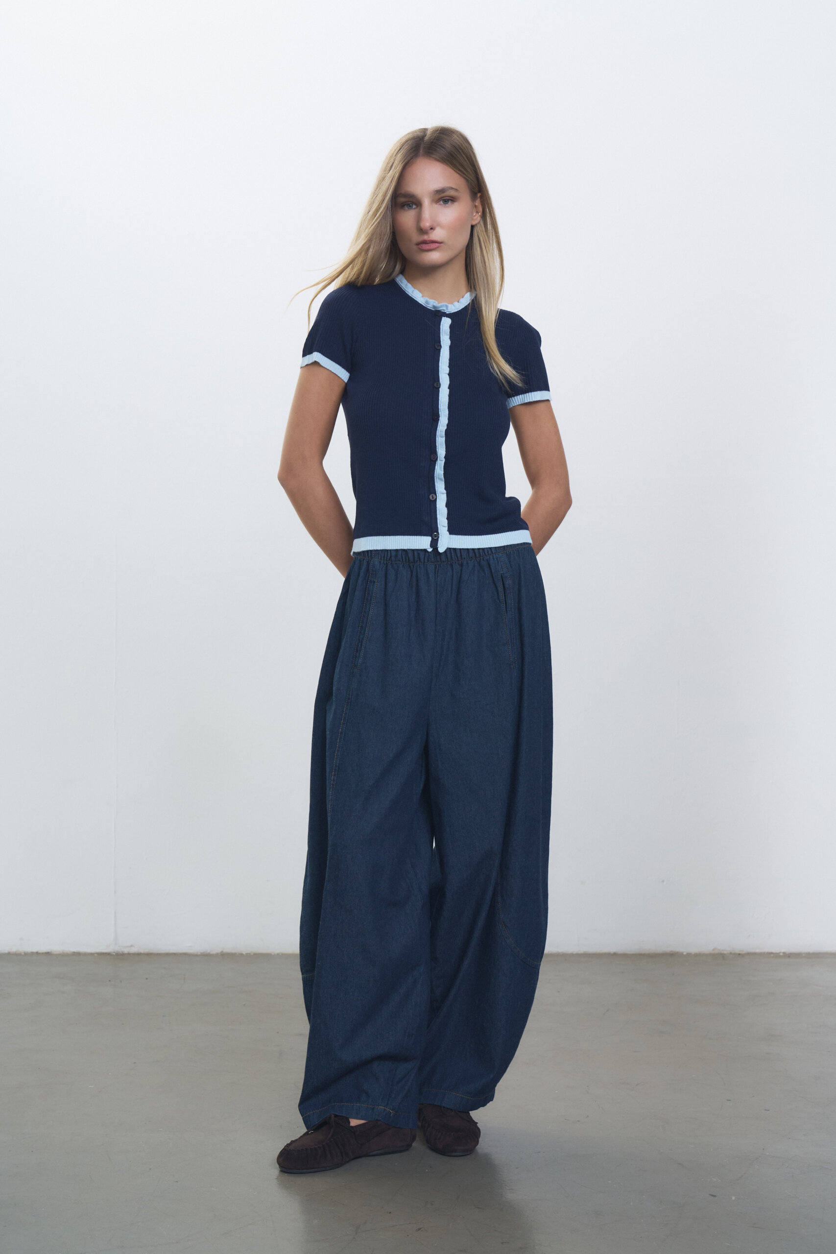 Pantalon babucha en denim camisero con recortes y cintura elastizada. Conjunto con Sweater Marfil