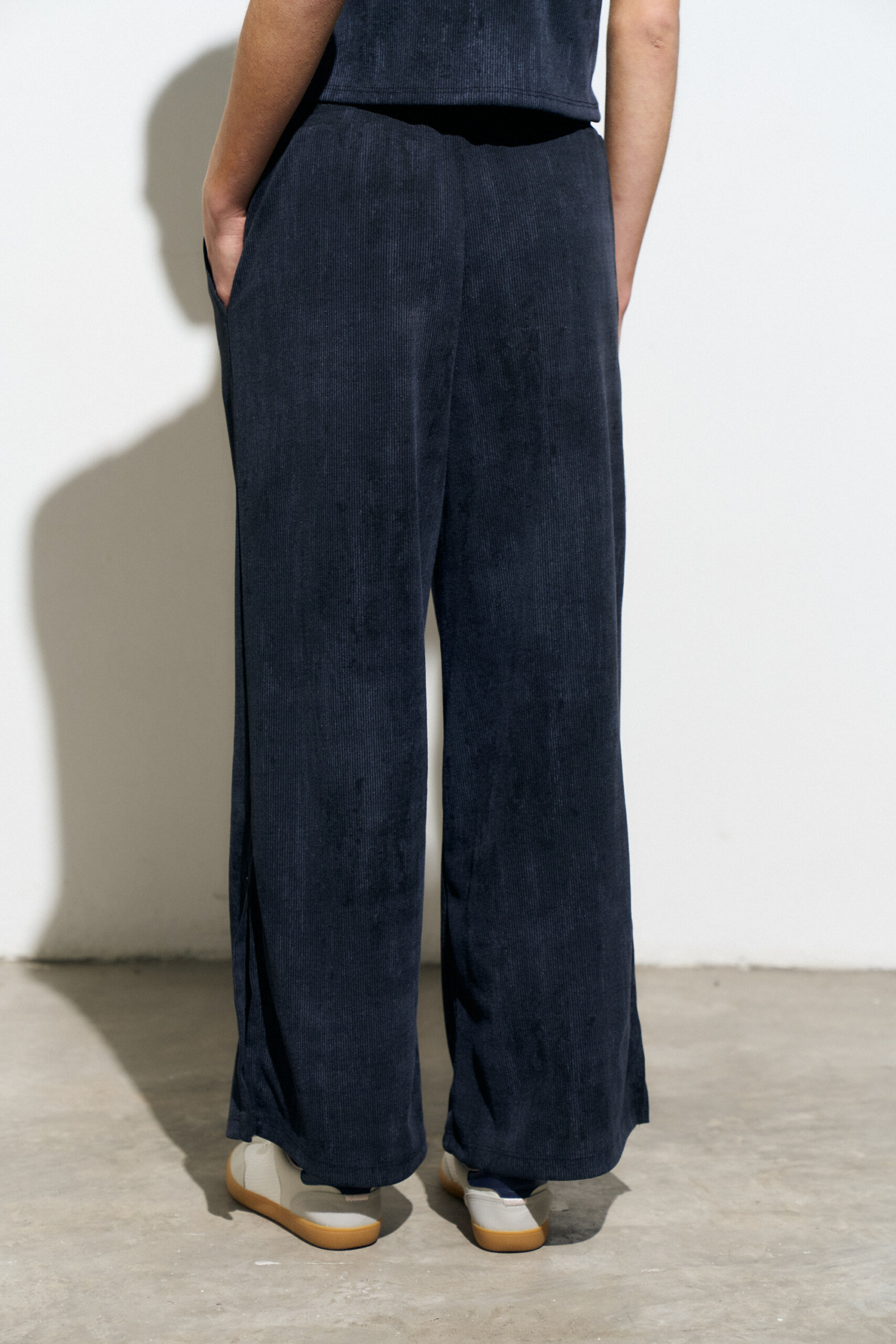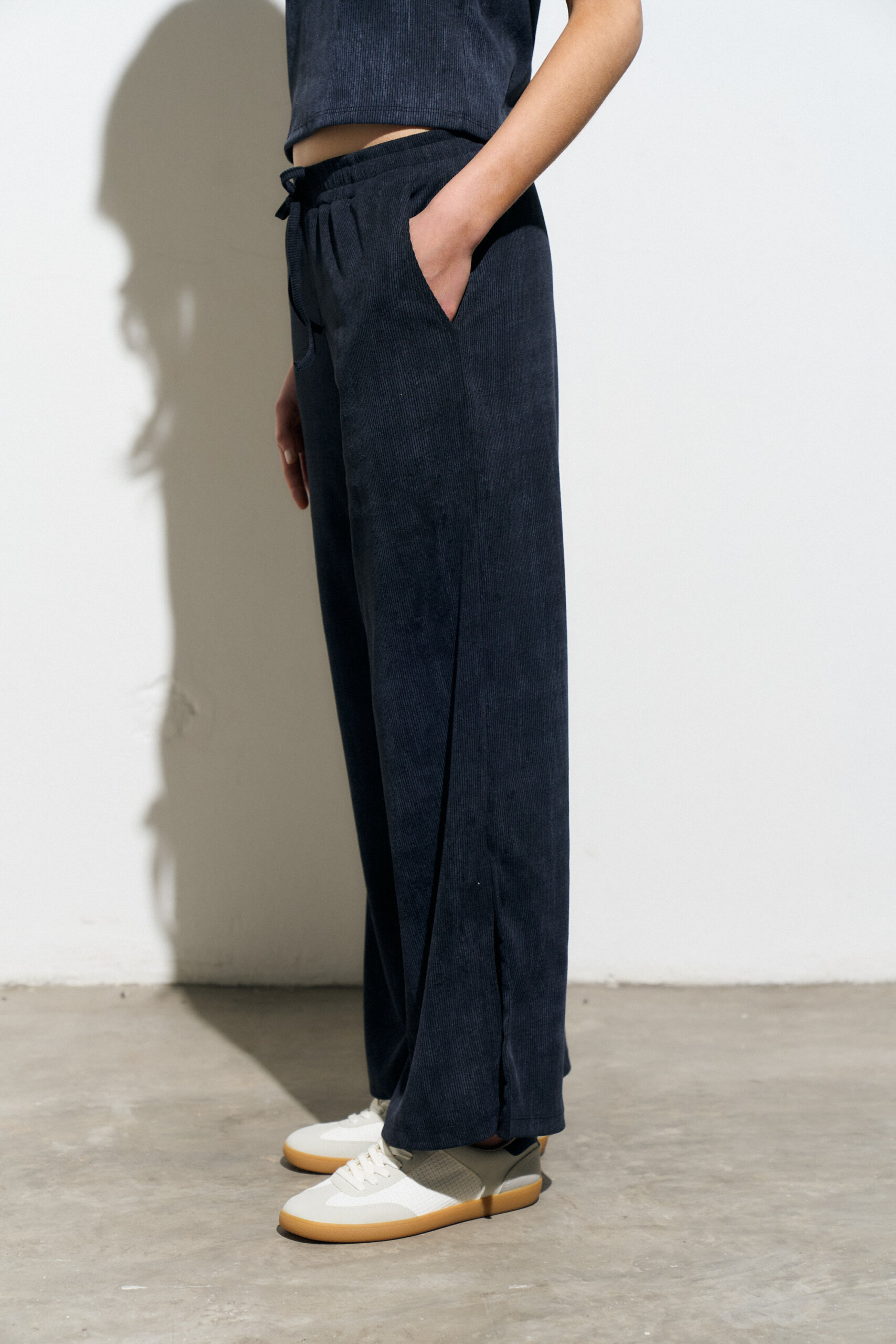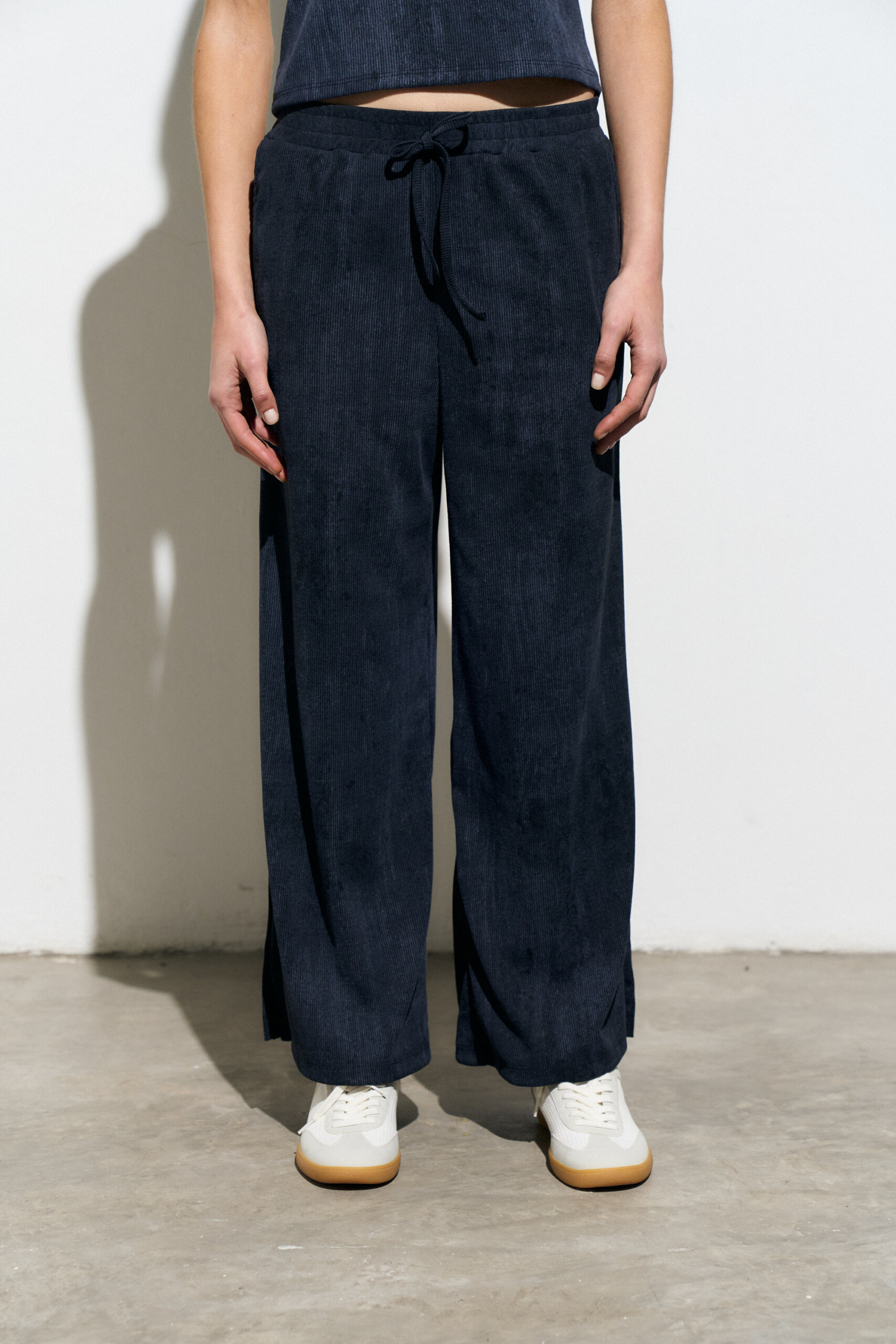 Pantalon jogger wide leg con cintura elastizada, bolsillos laterales y lazo. Confeccionado en morley efecto vintage.