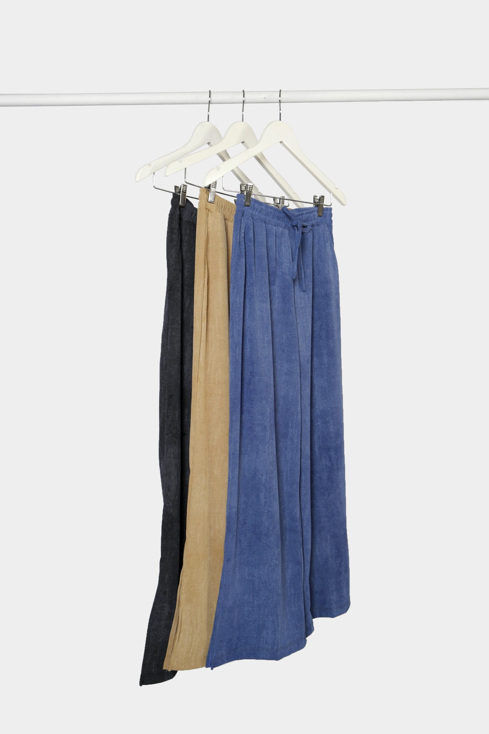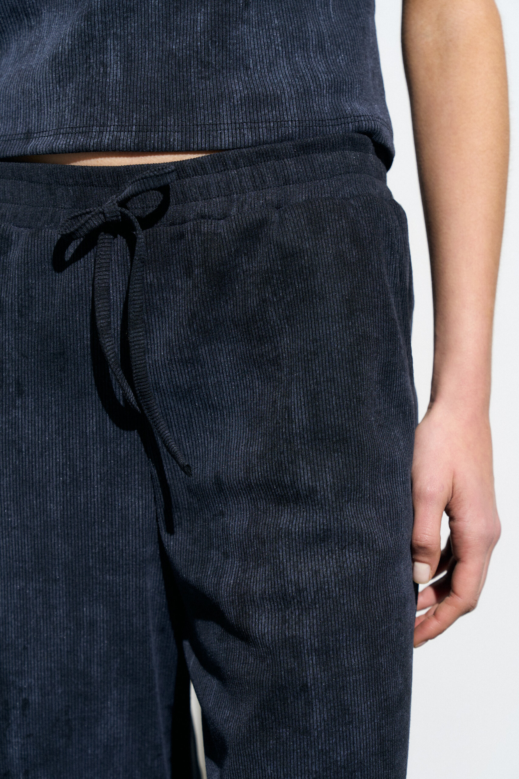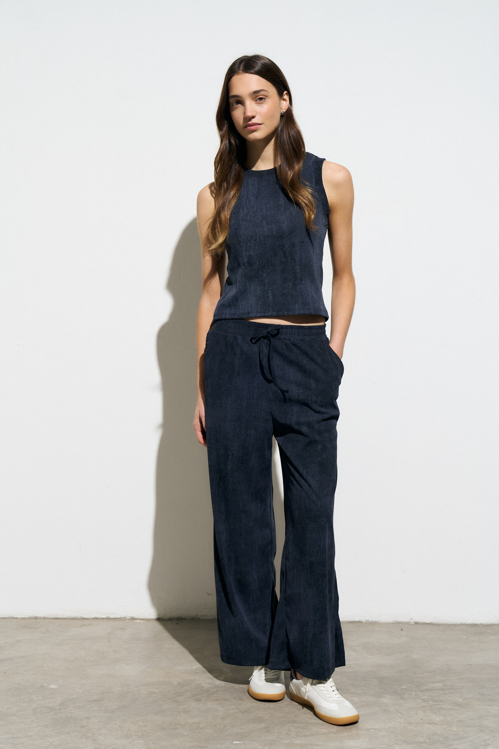 Pantalon jogger wide leg con cintura elastizada, bolsillos laterales y lazo. Confeccionado en morley efecto vintage.
