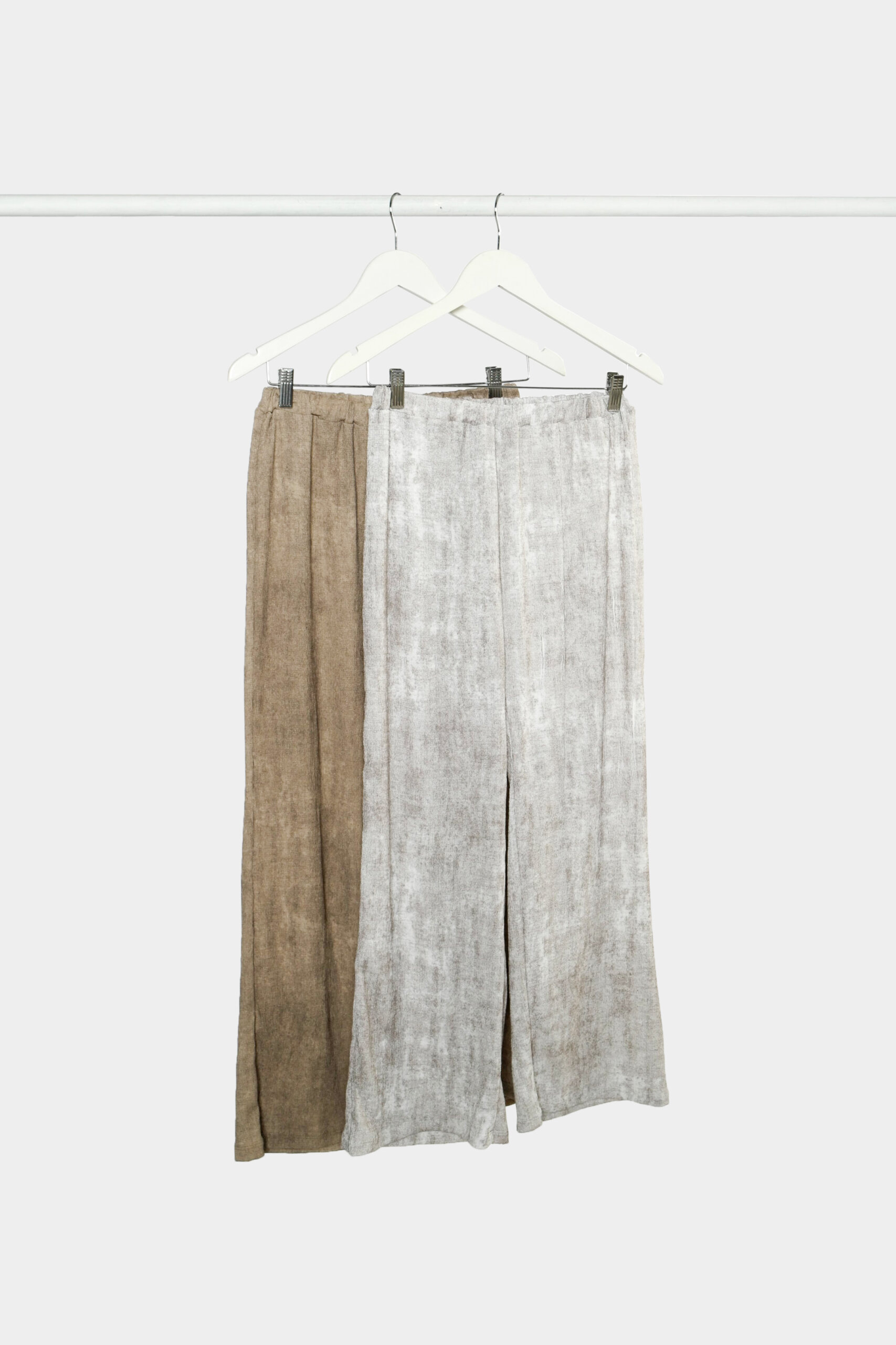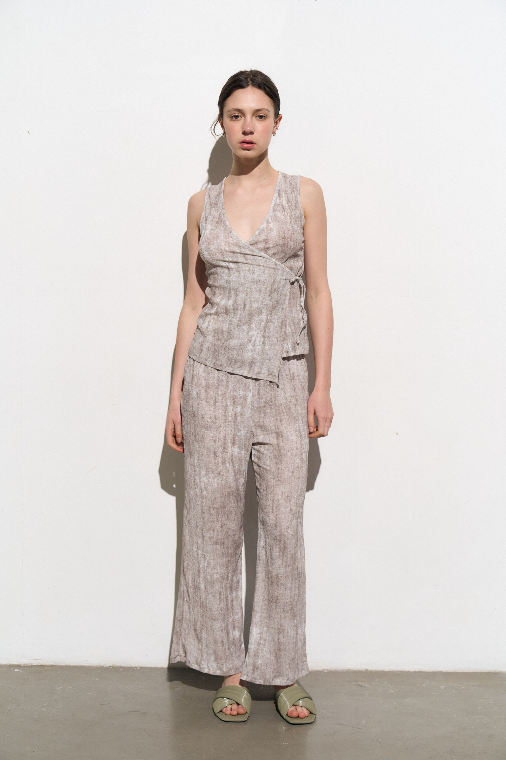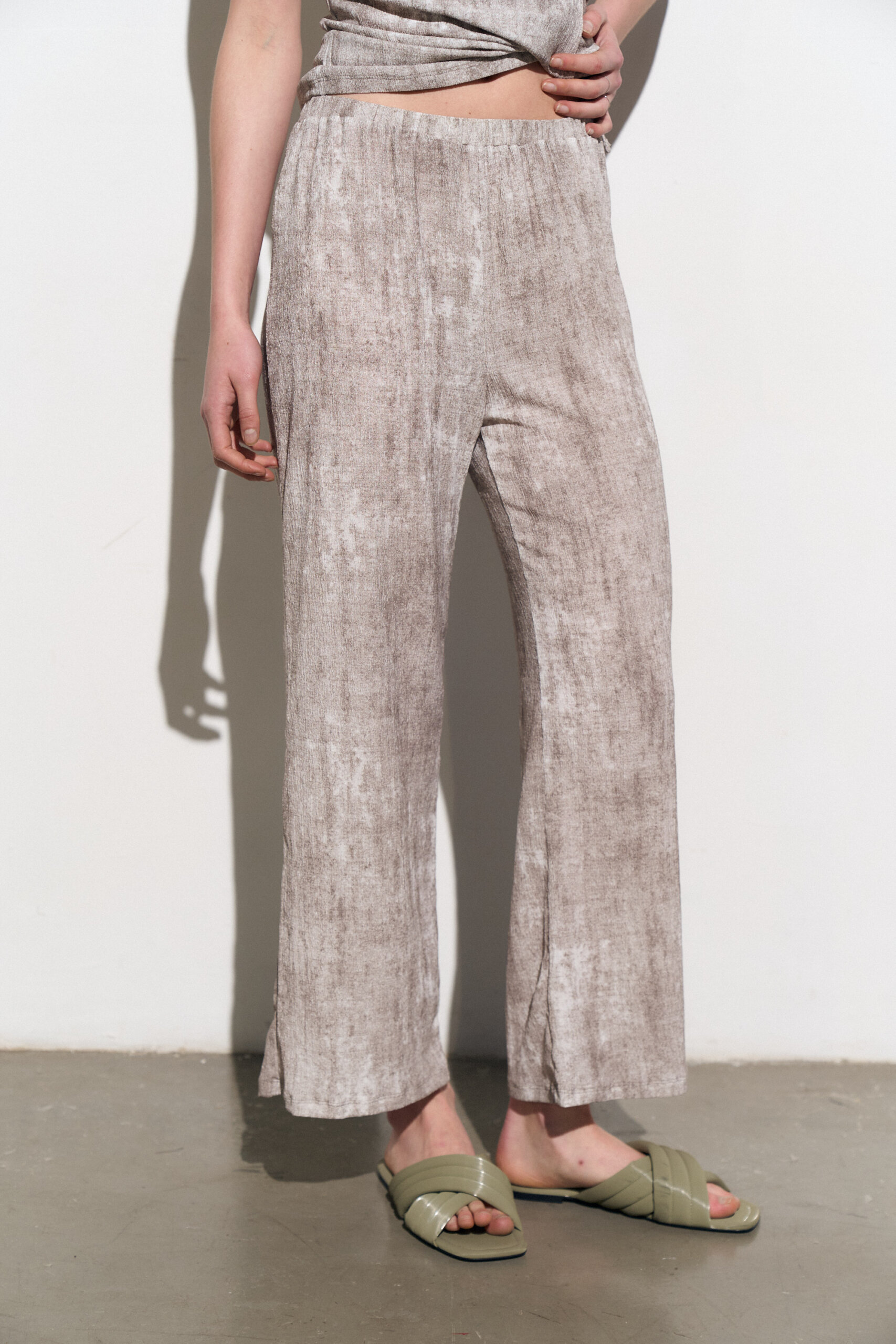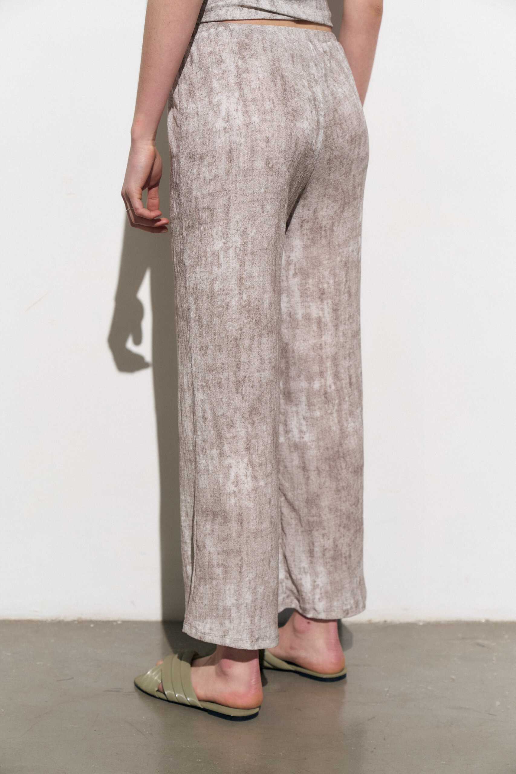 Pantalon de pierna recta con cintura elastizada confeccionado en crepe de punto texturado print efecto vintage.
