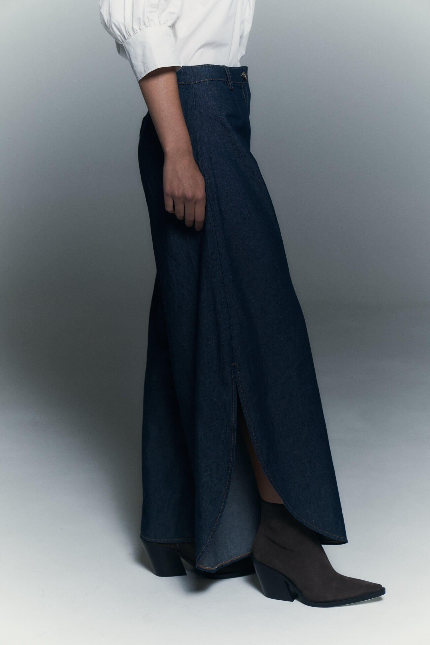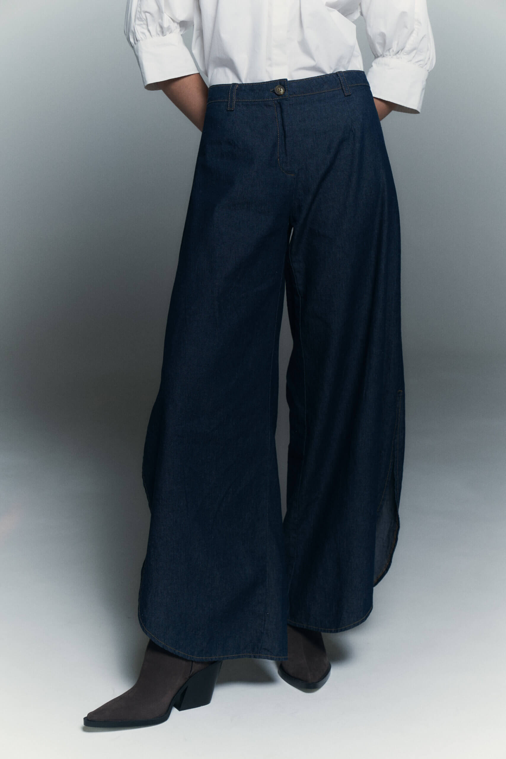 Pantalón super wide en denim camisero con pinzas y ruedo curvo.