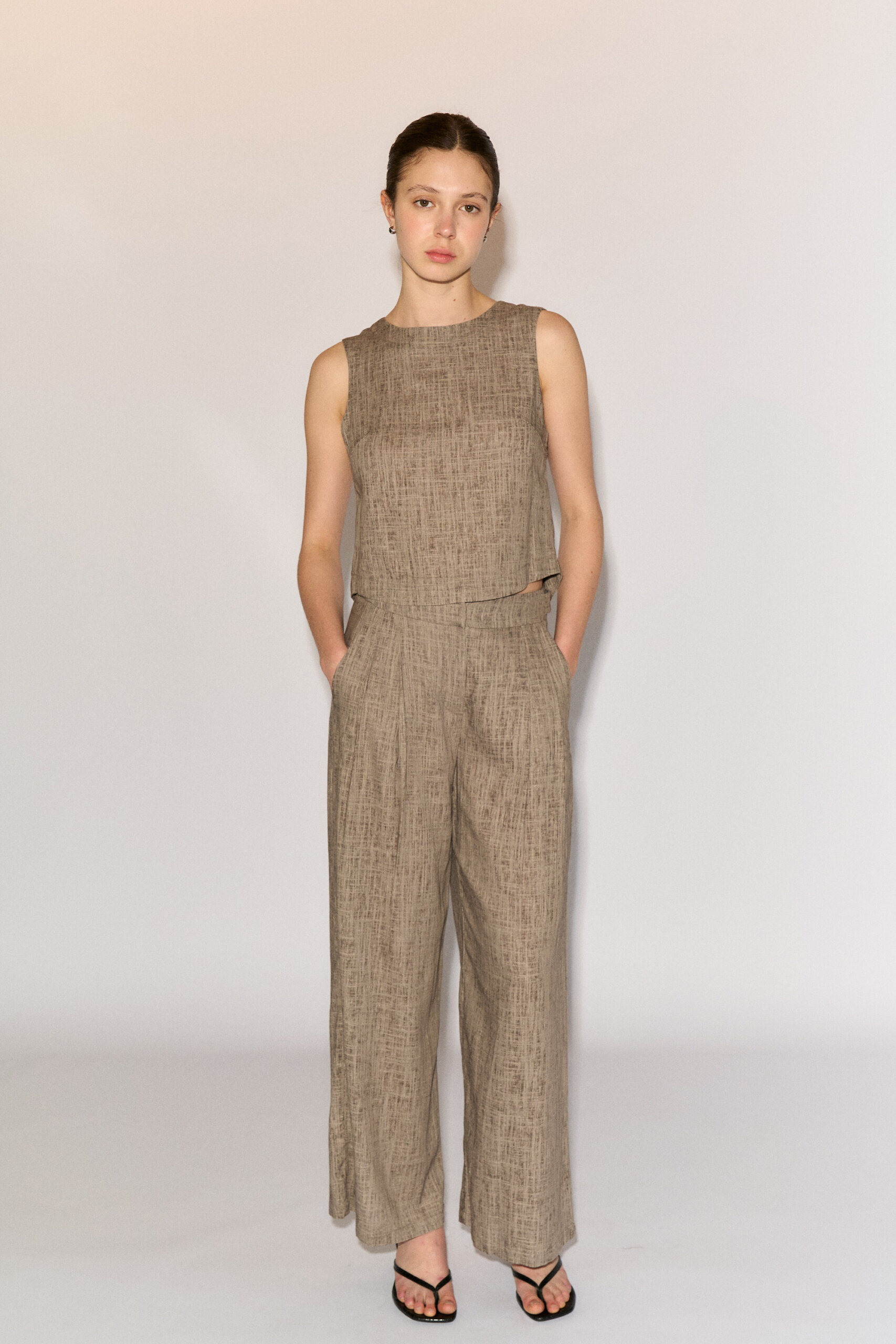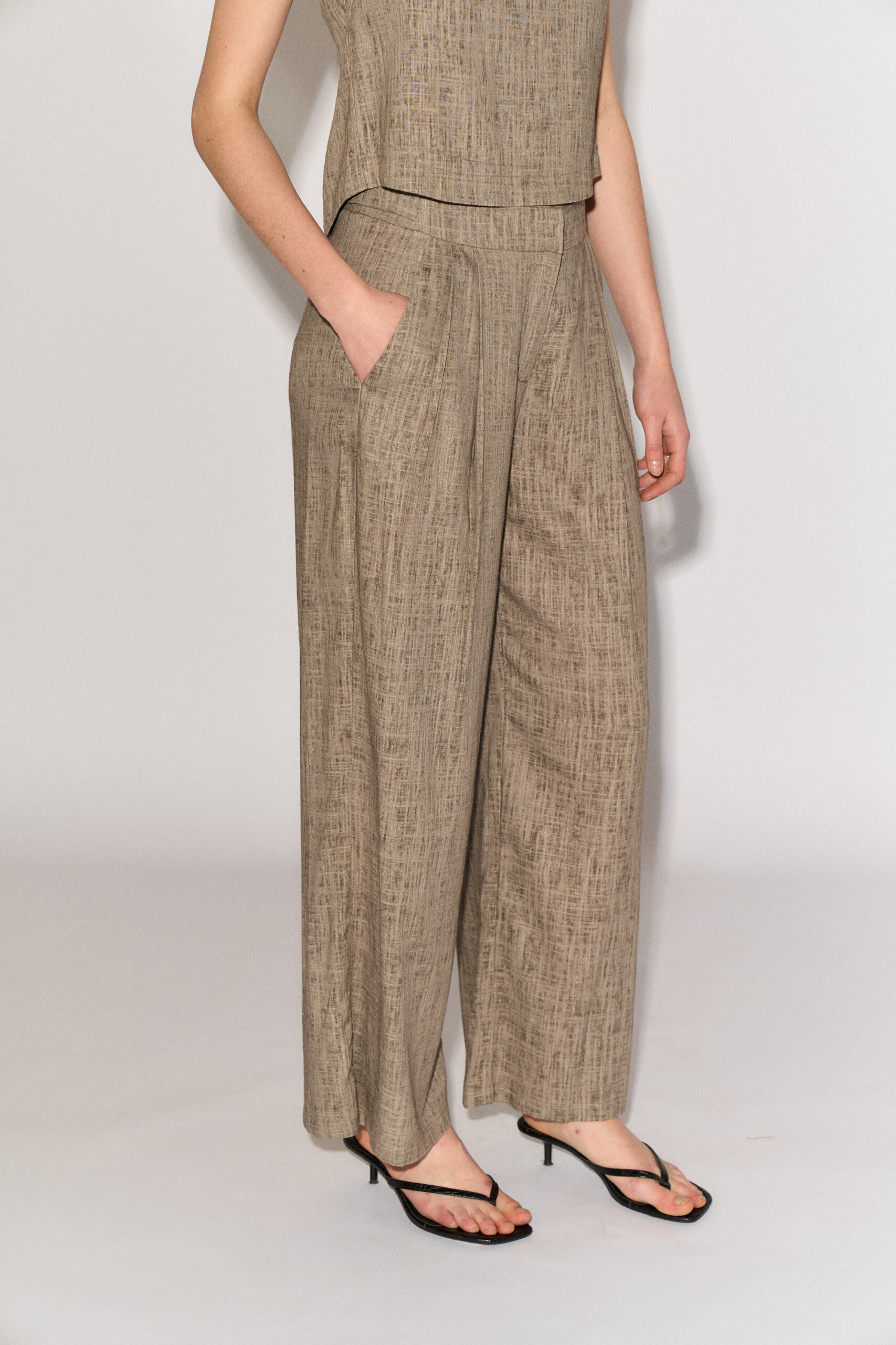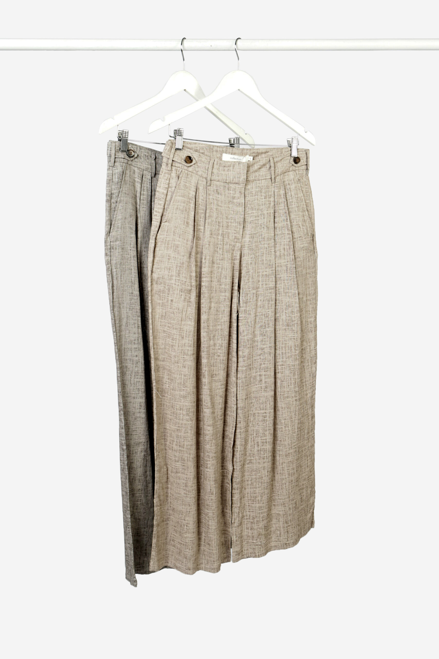 Pantalón de lino con pinzas frontales y bolsillos laterales.