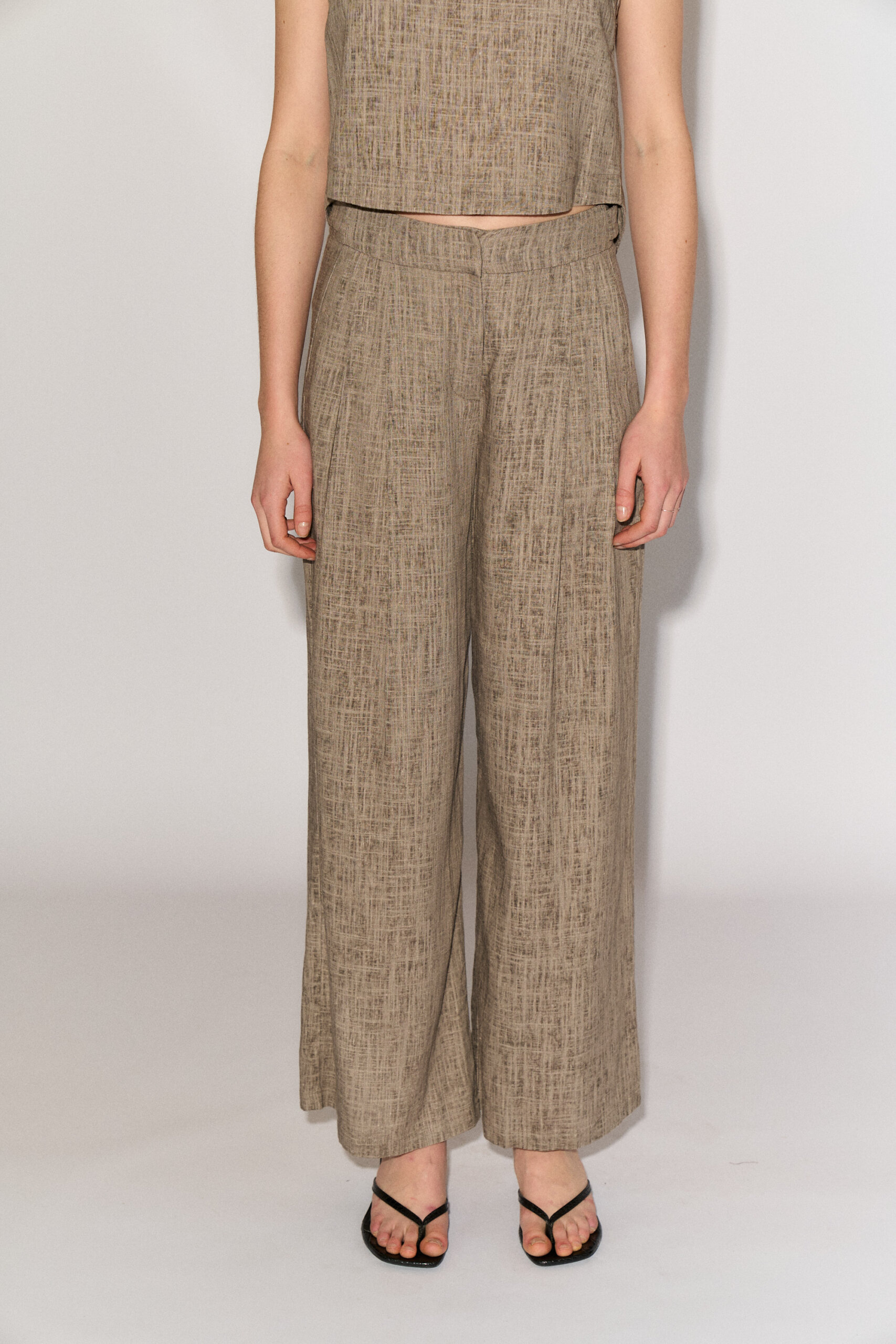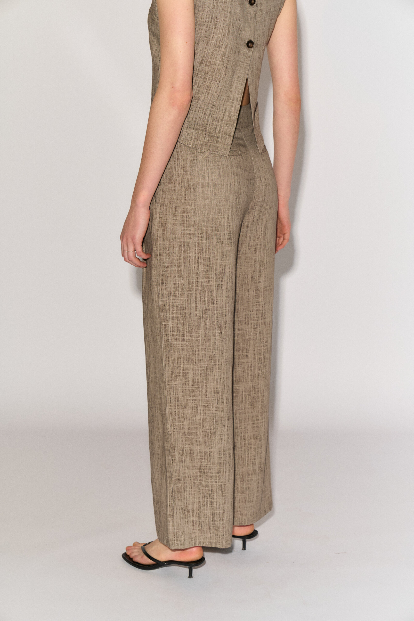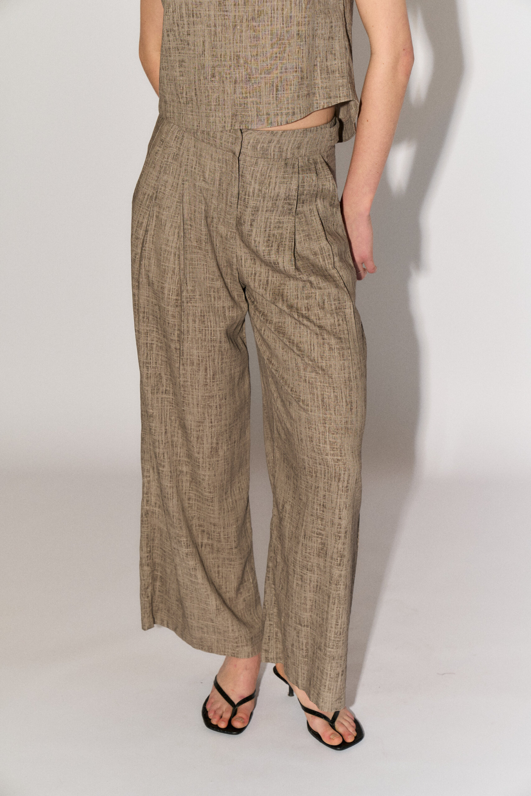 Pantalón de lino con pinzas frontales y bolsillos laterales.