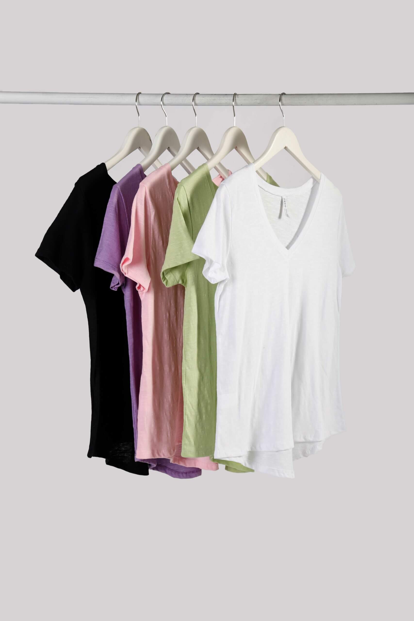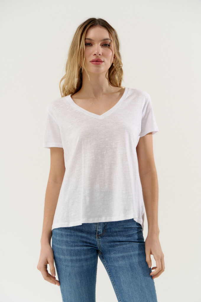 Remera básica de algodón manga corta, con escote en V y ruedo irregular en espalda.