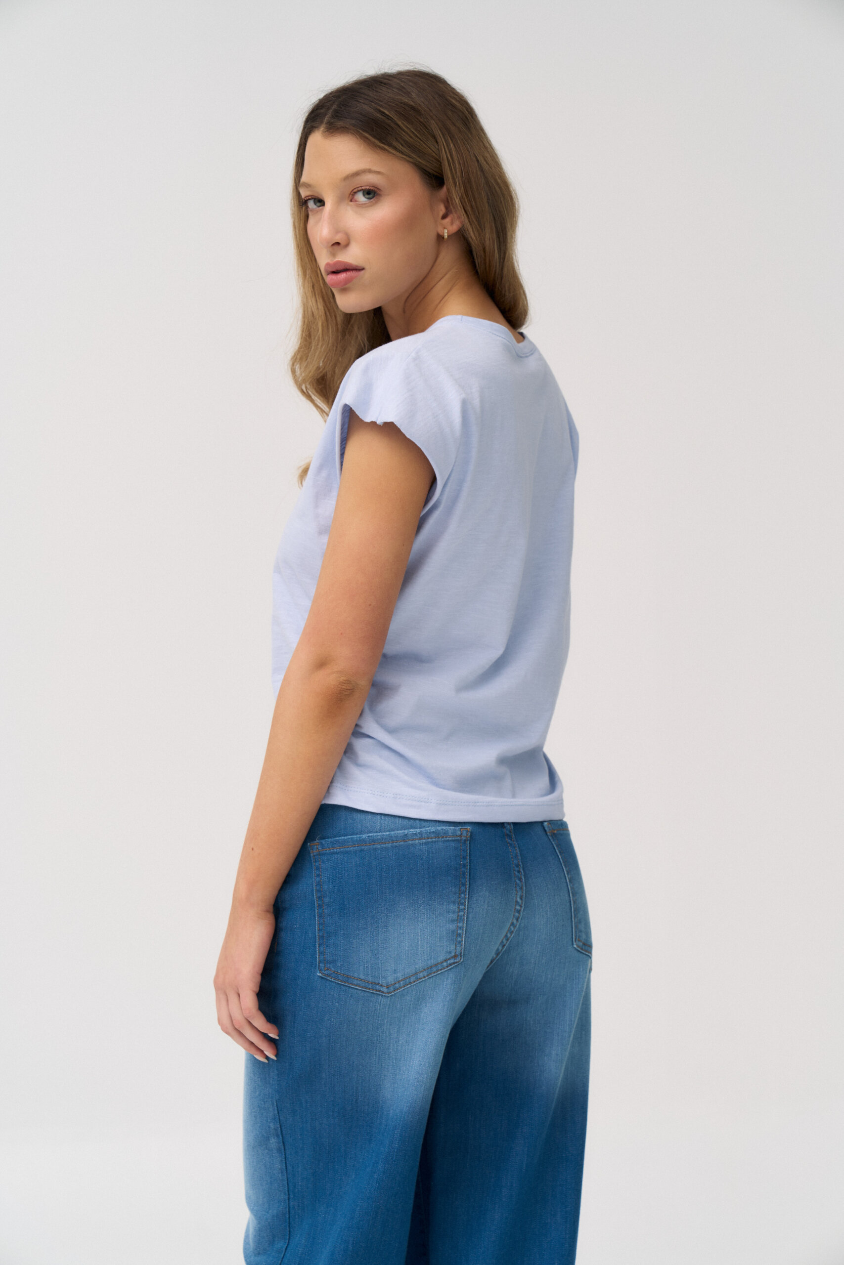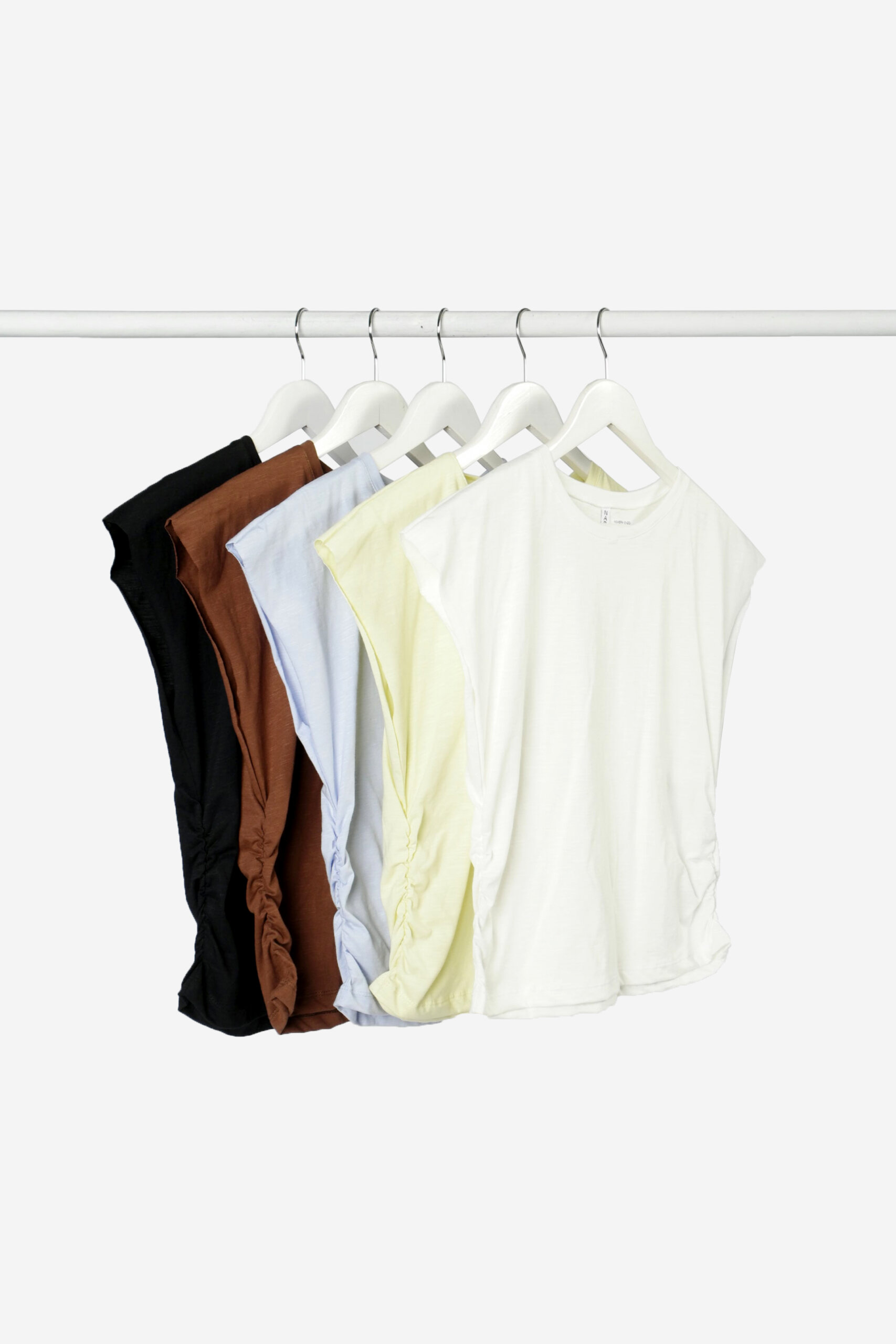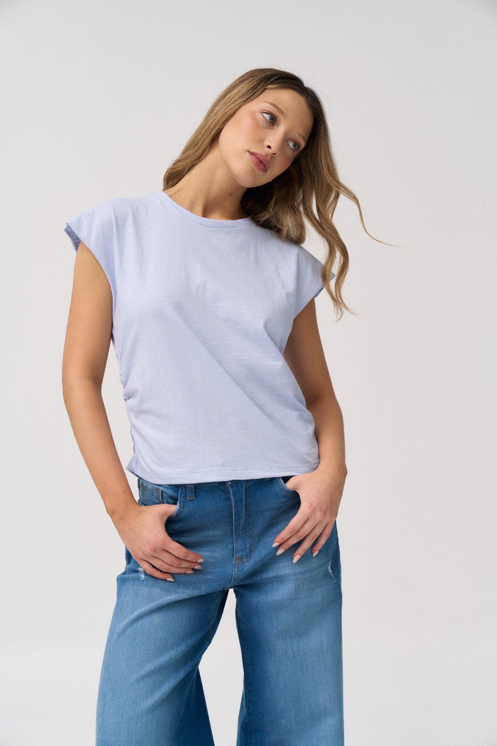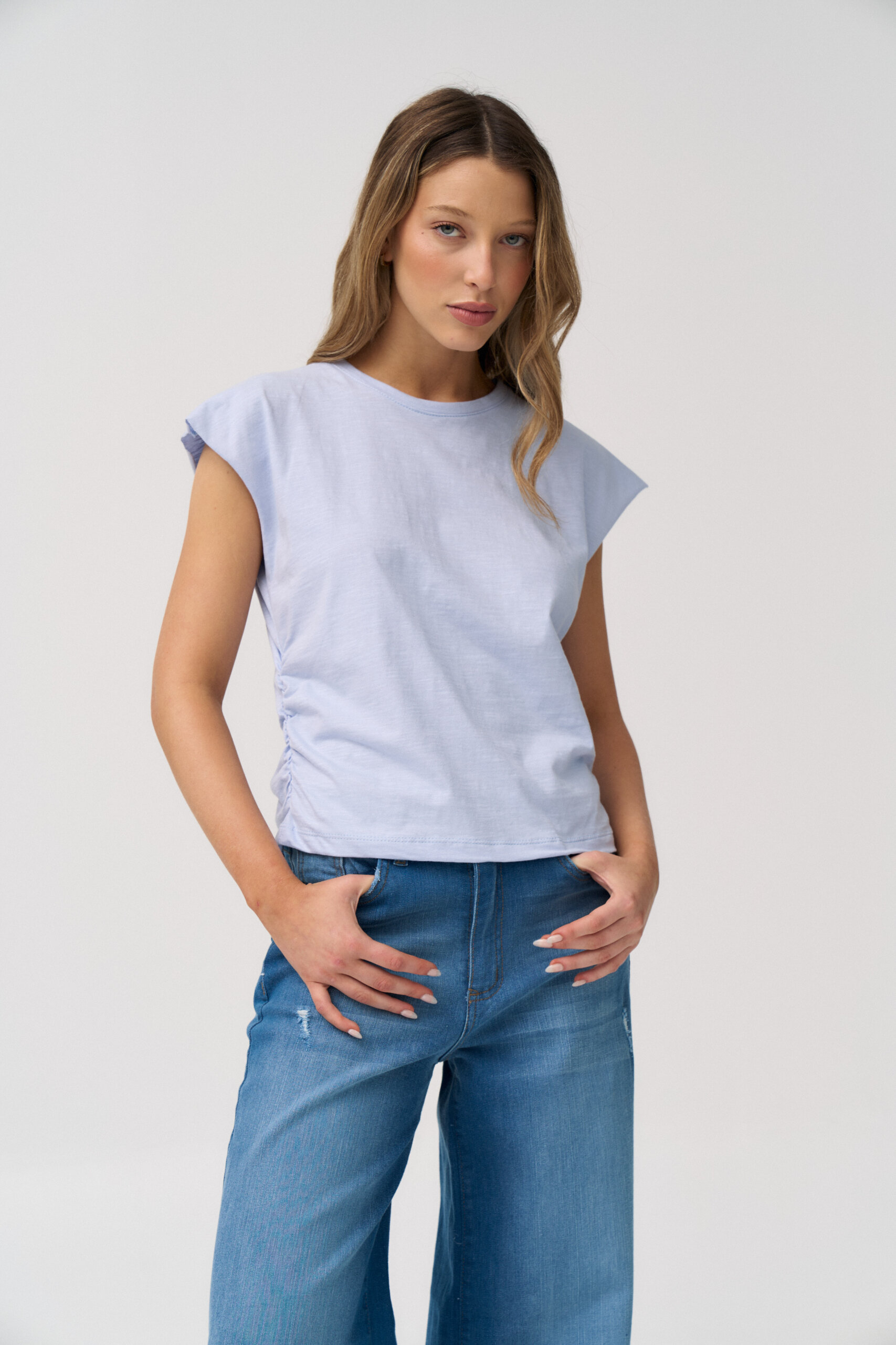 Remera sin mangas de jersey flame con frunces laterales y terminaciones al corte.