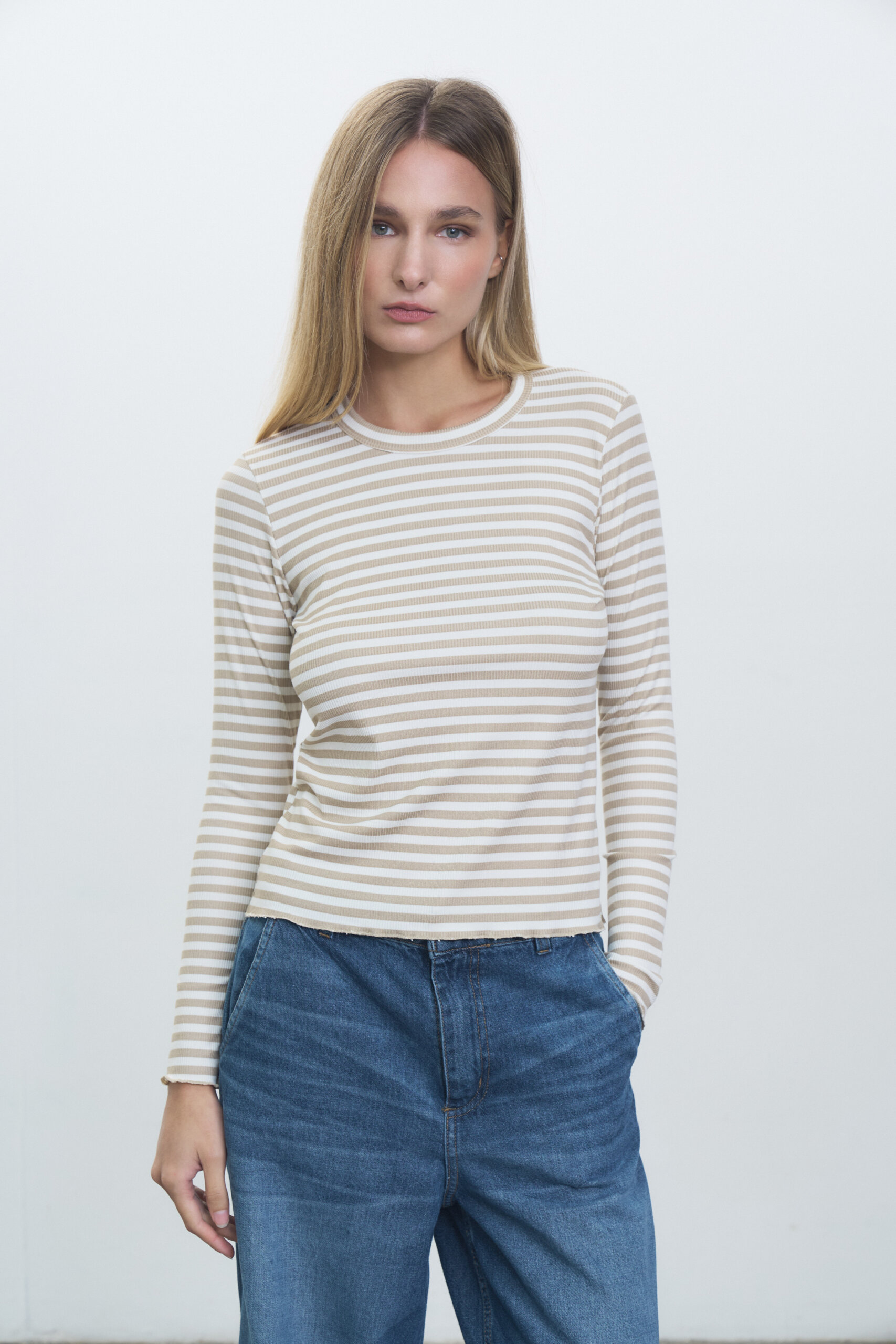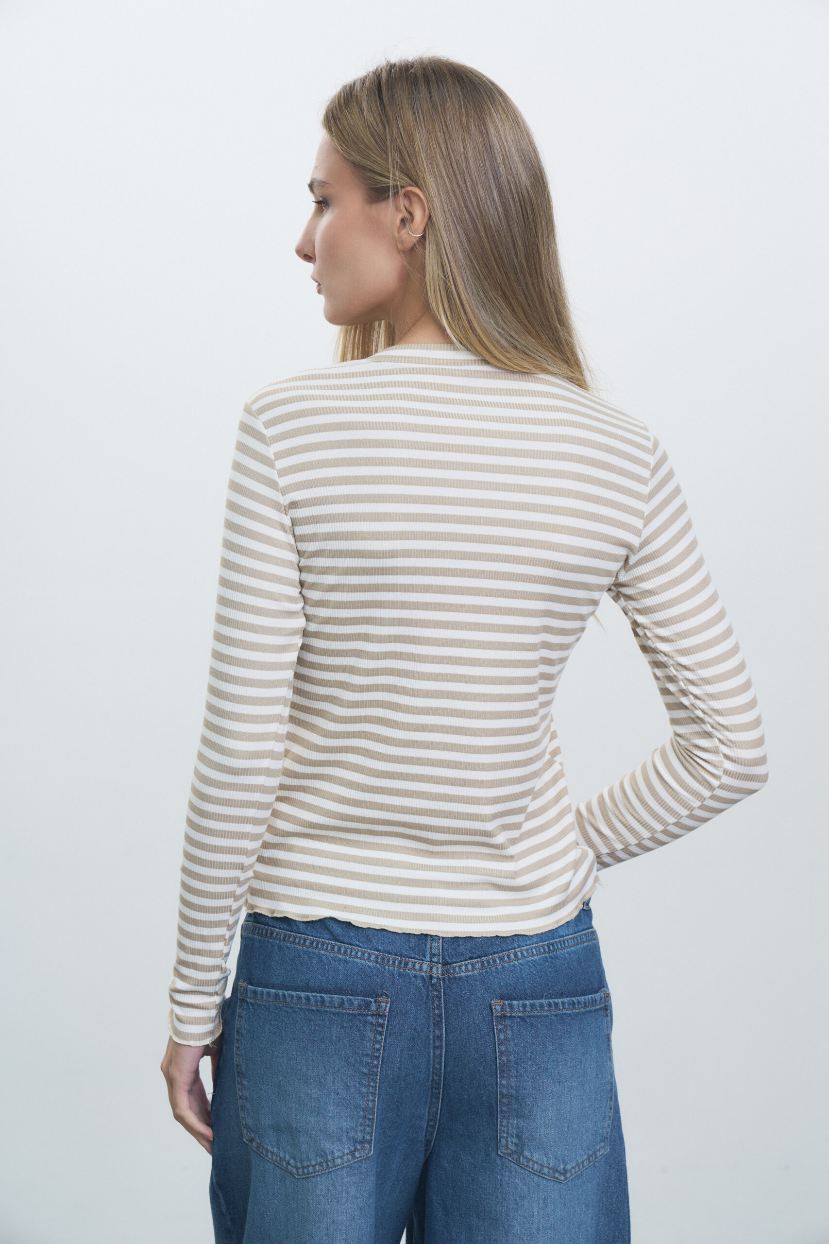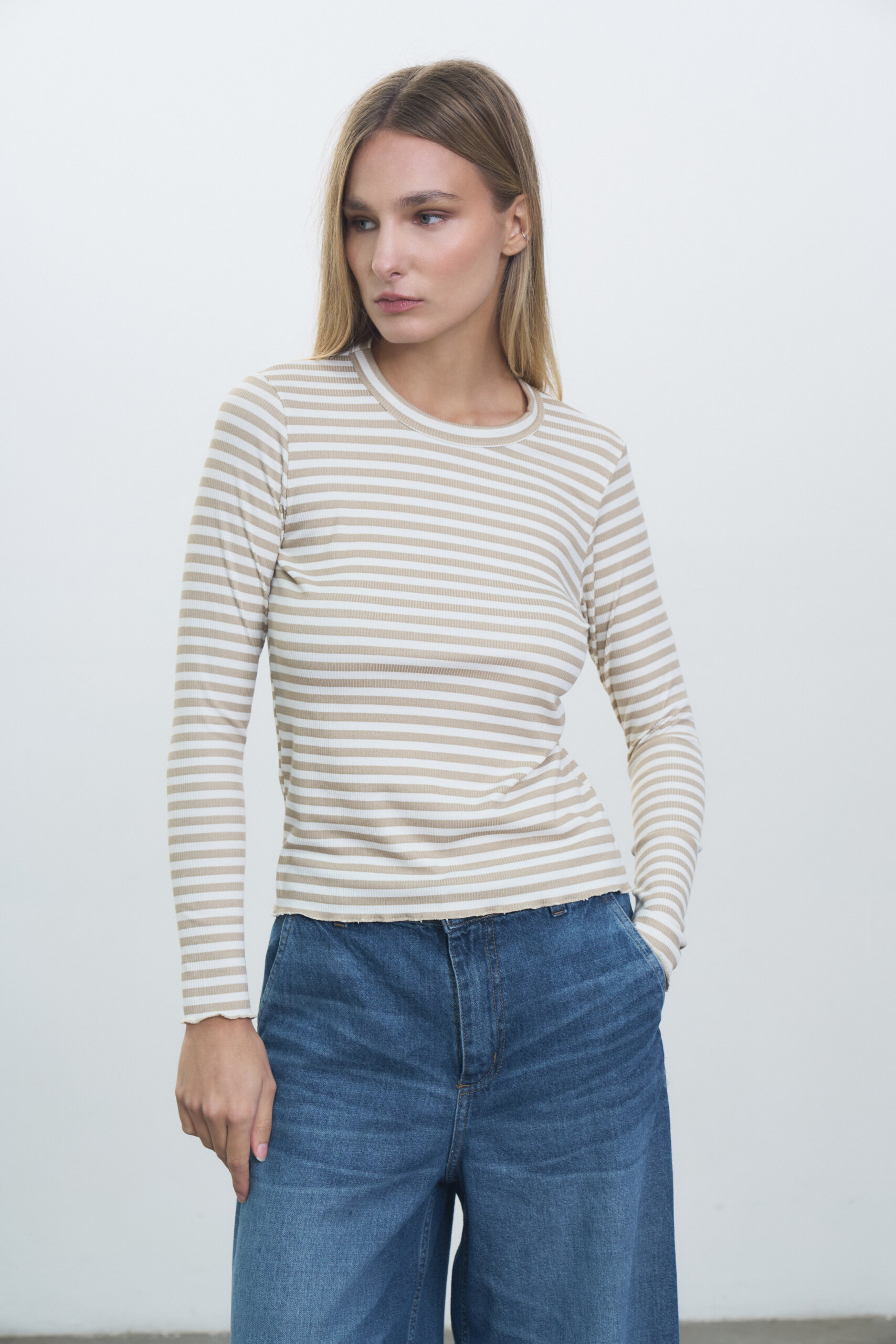 Remera manga larga en ribb rayado, escote redondo y terminaciones de roulotte en puños y ruedo.