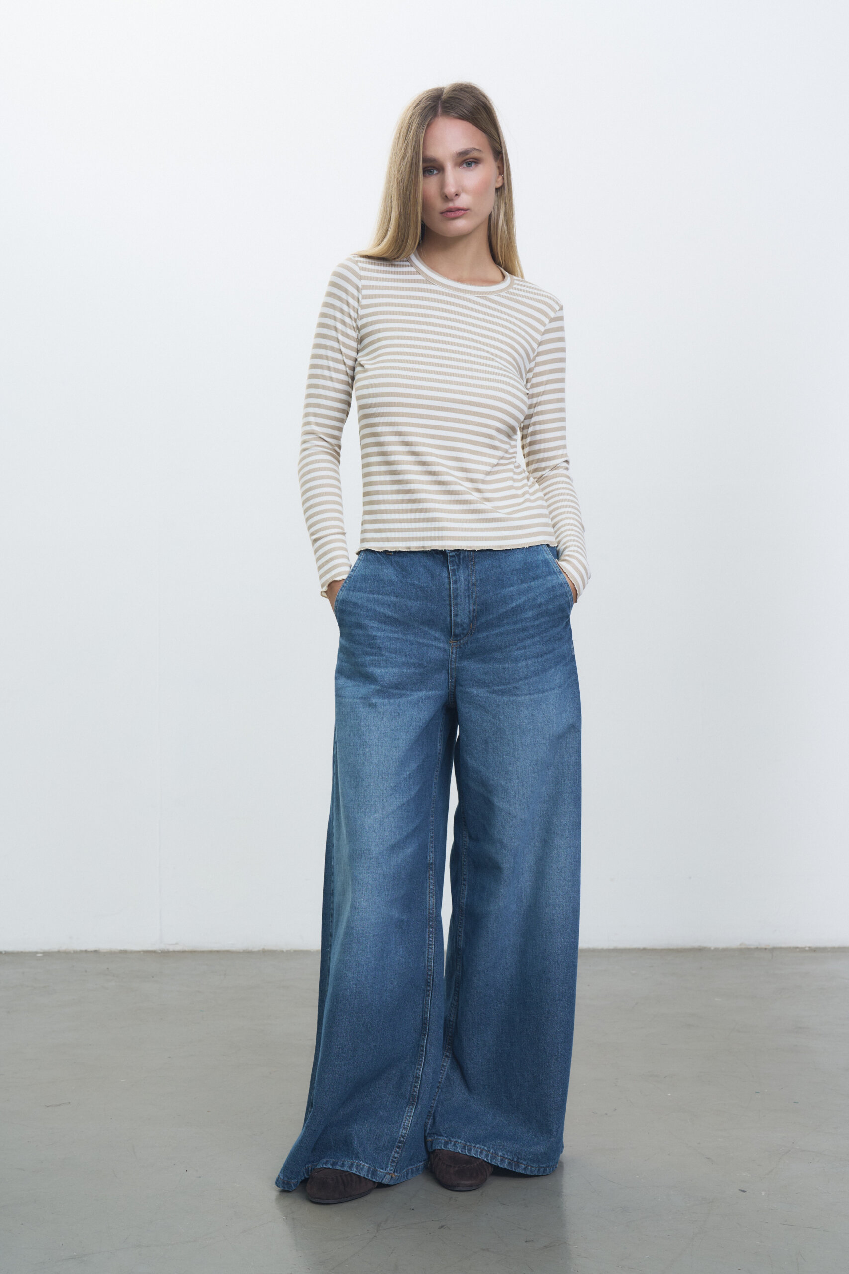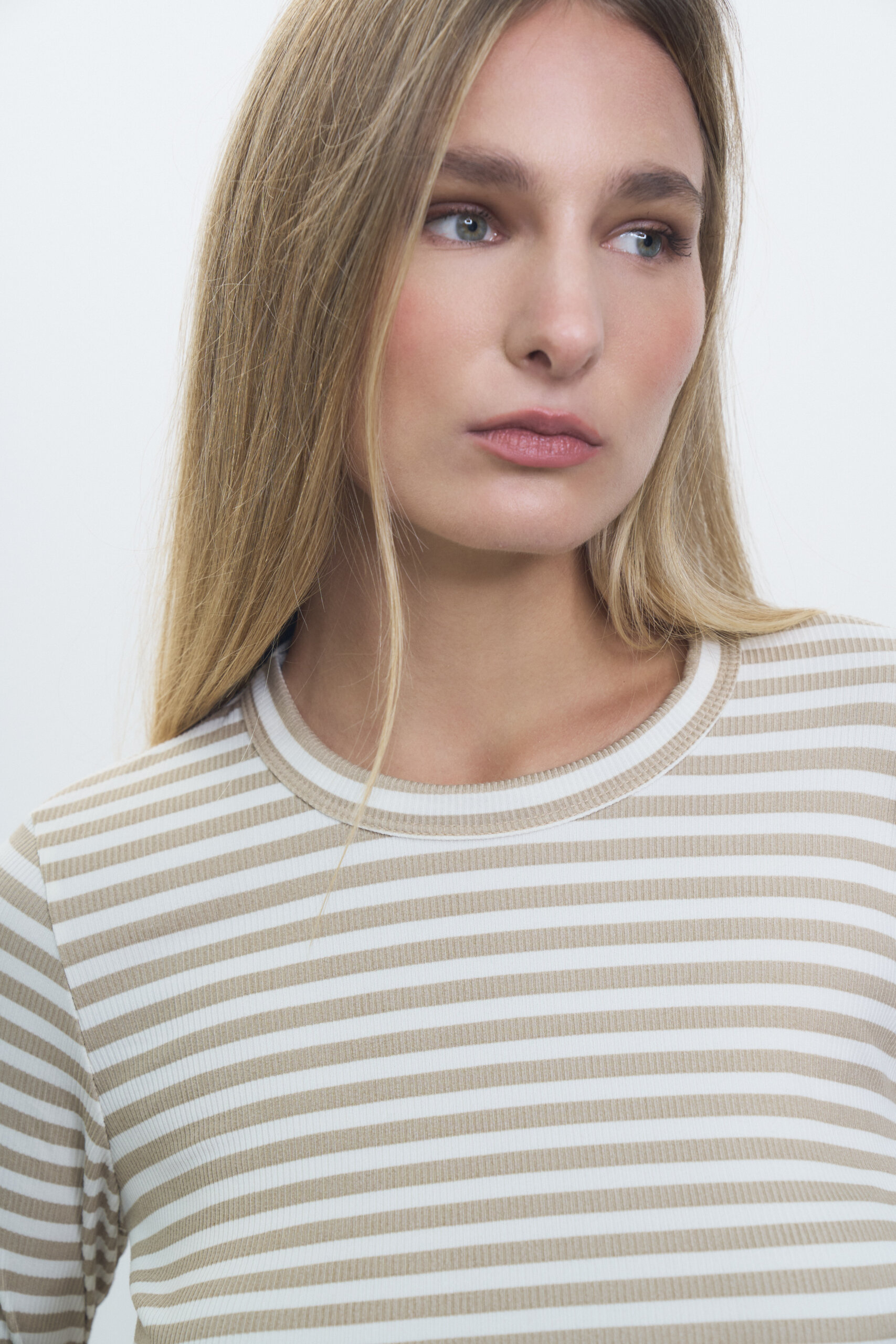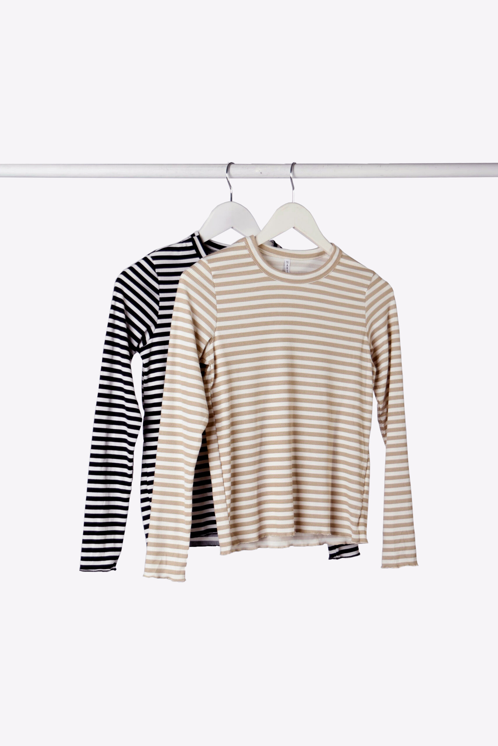 Remera manga larga en ribb rayado, escote redondo y terminaciones de roulotte en puños y ruedo.