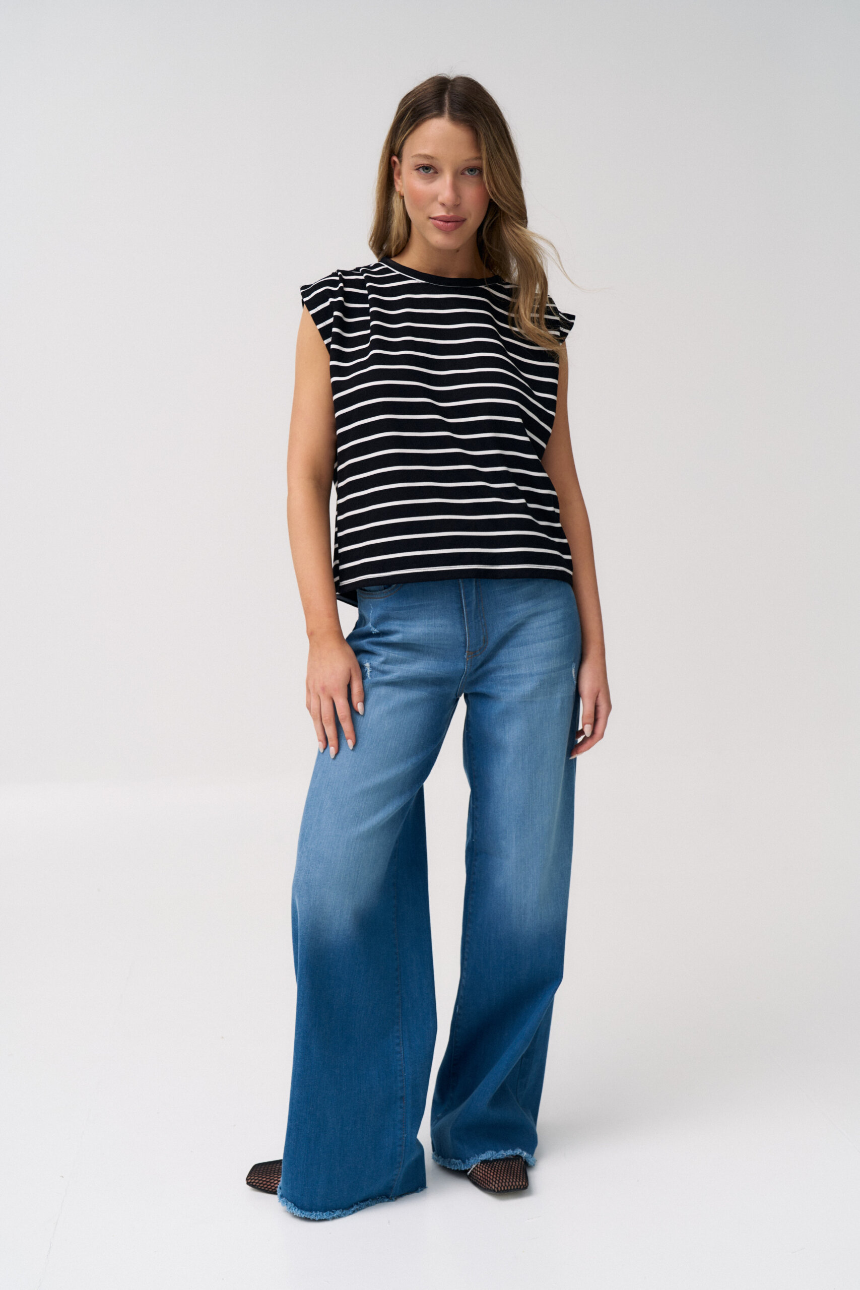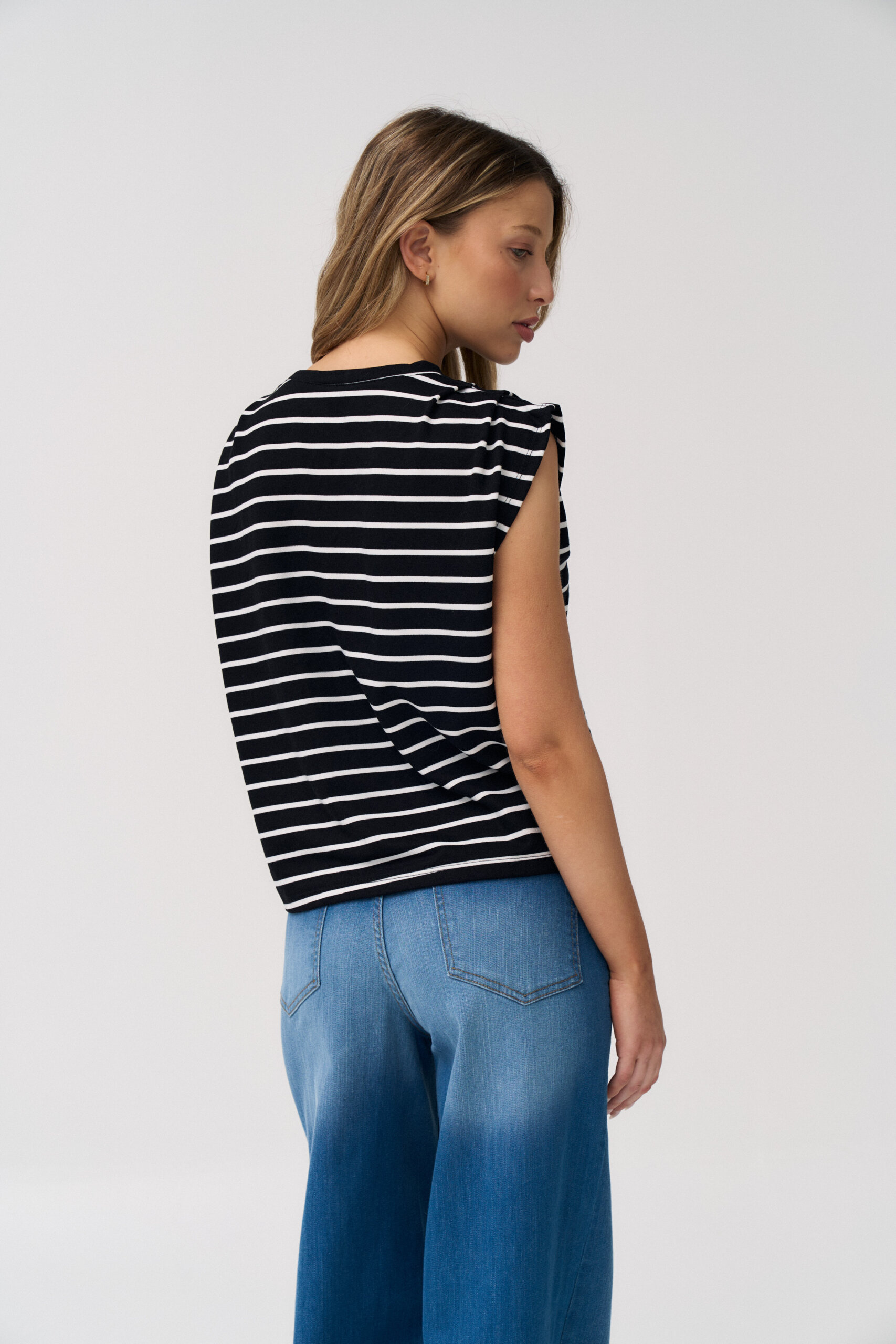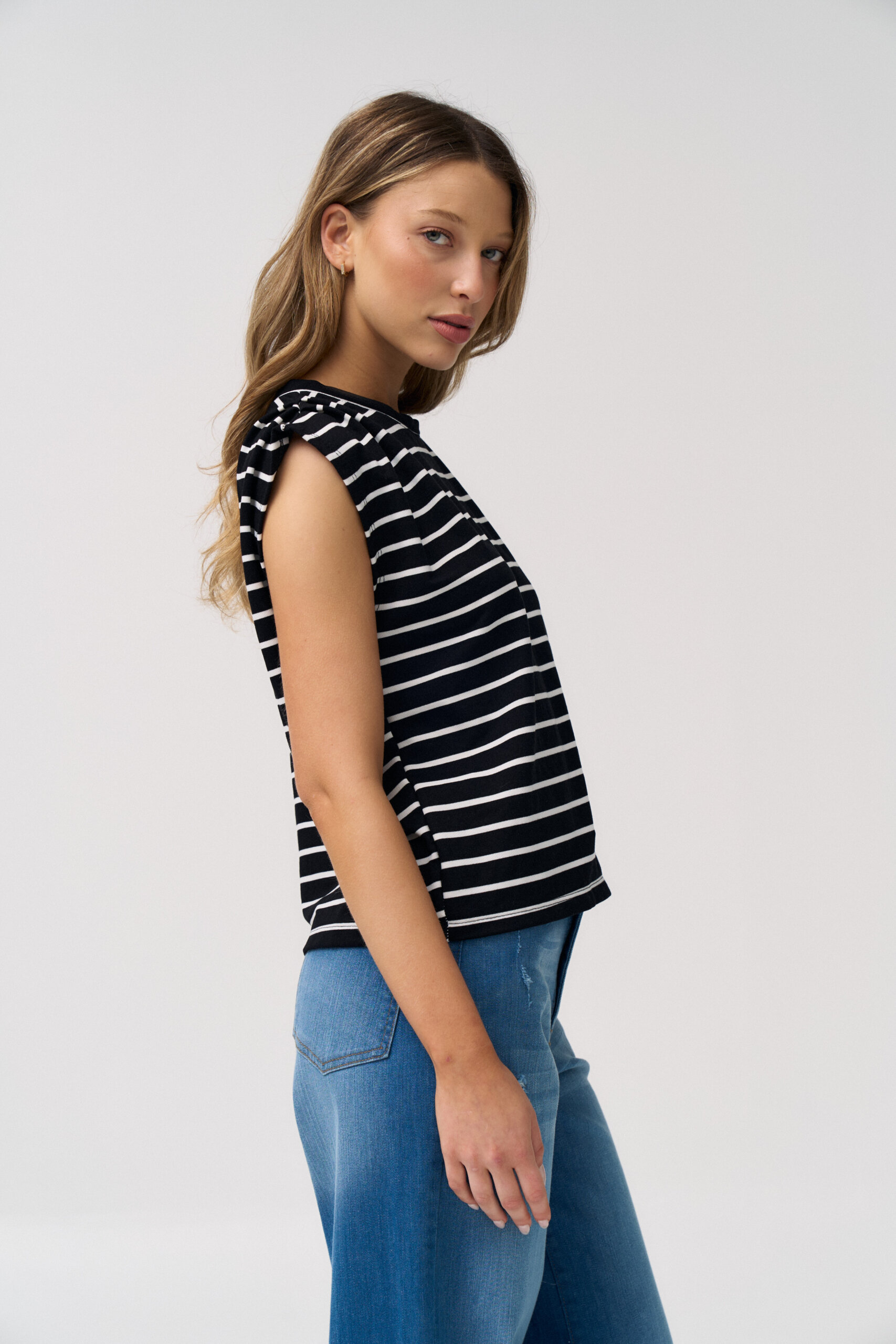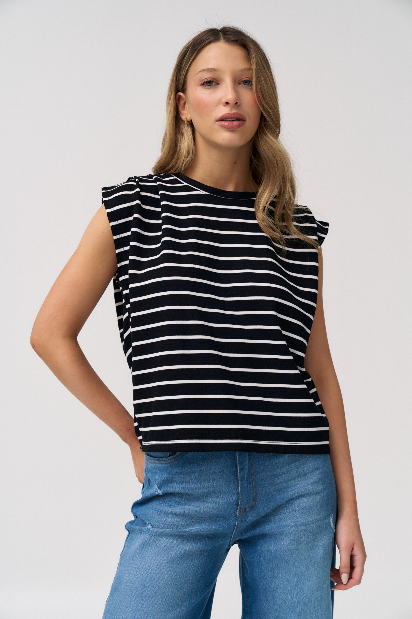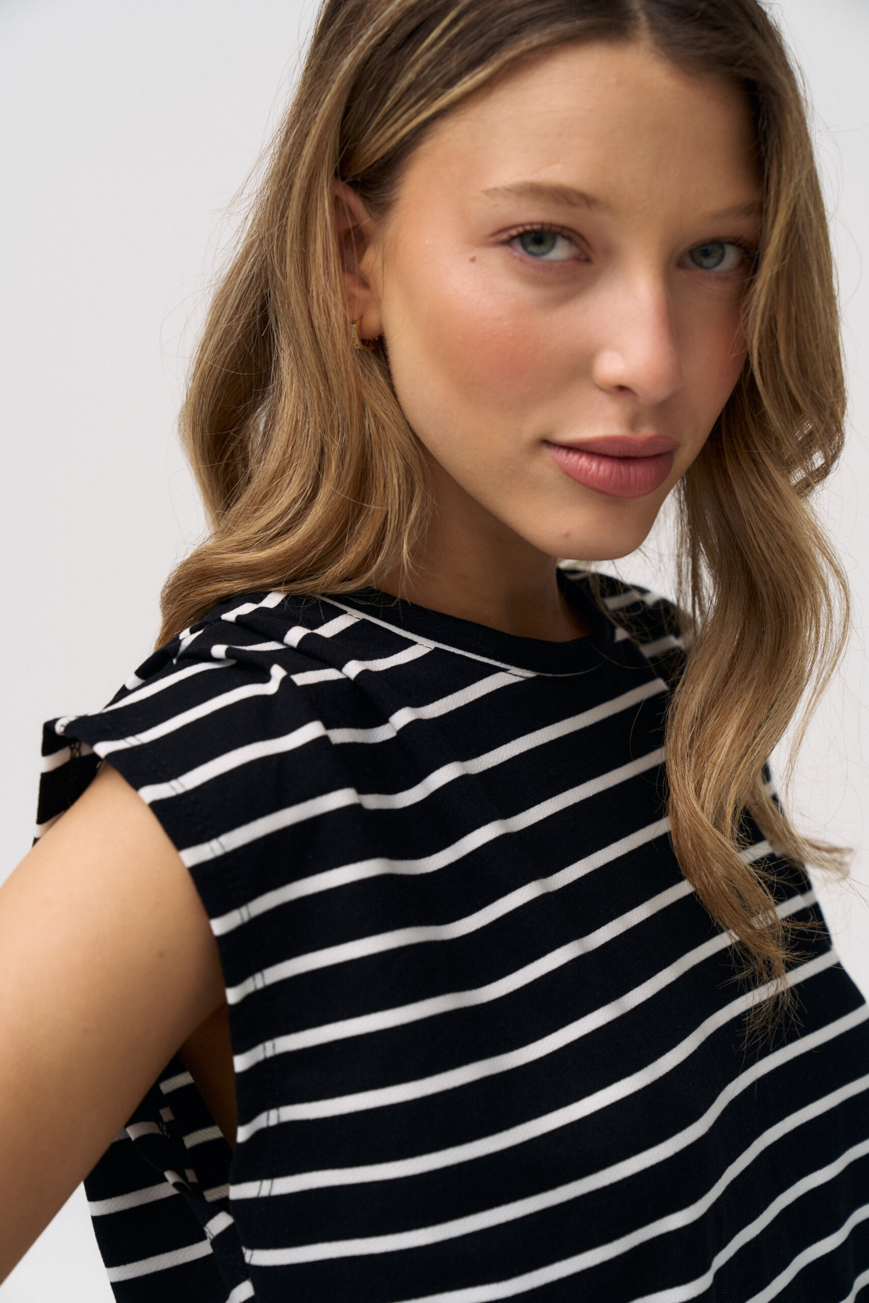 Remera en jersey rayado con detalle de tablas en los hombros.