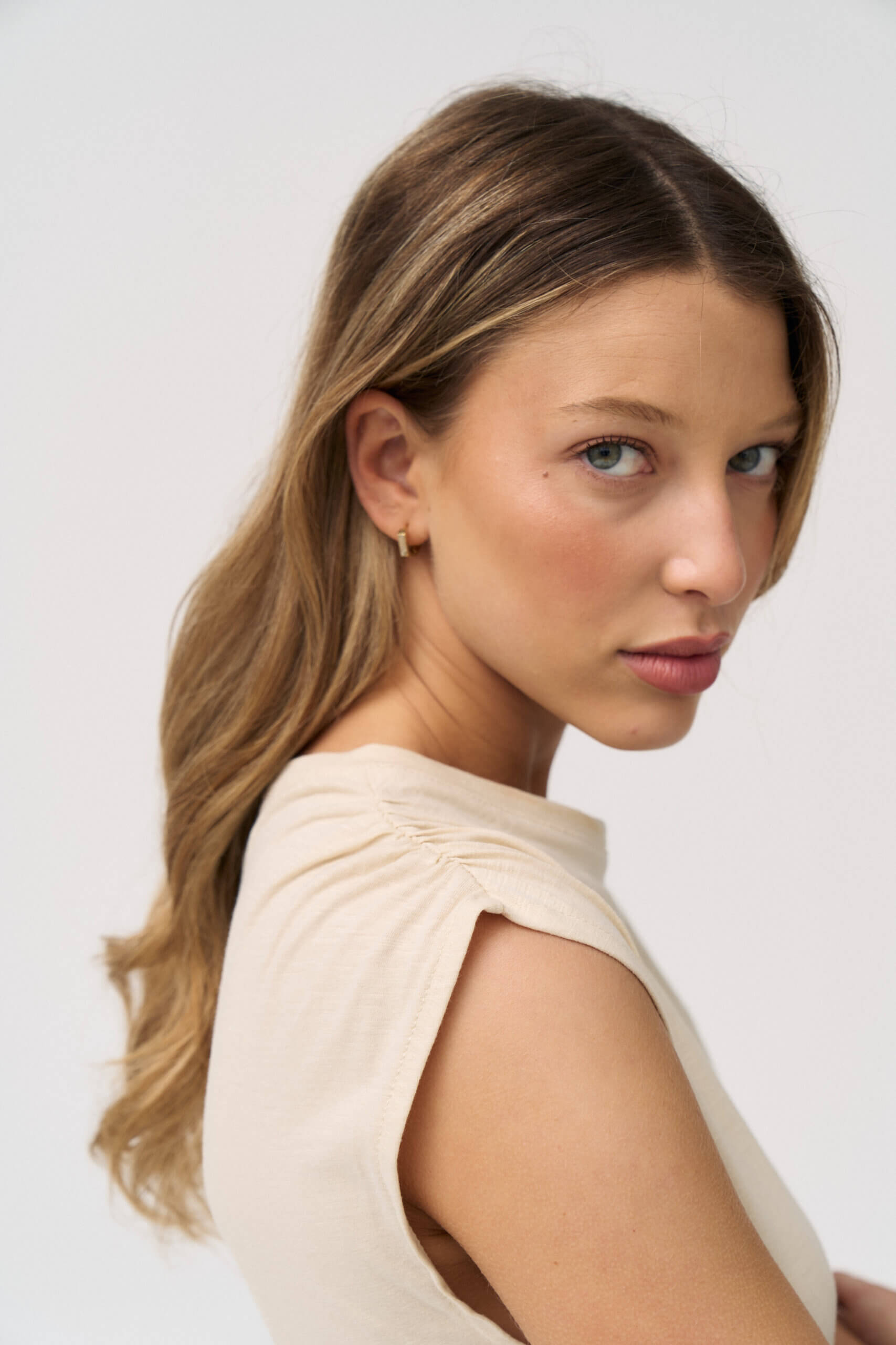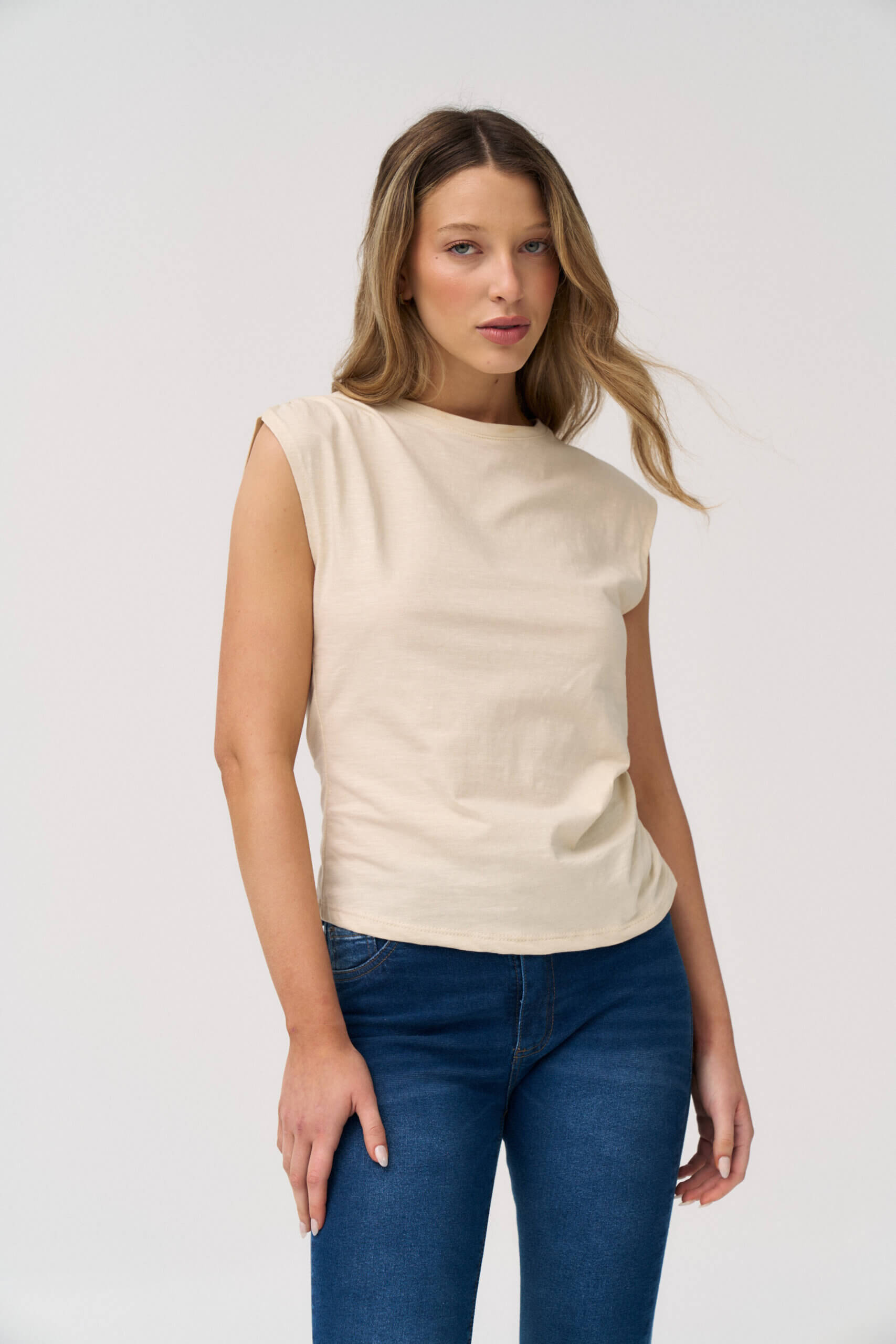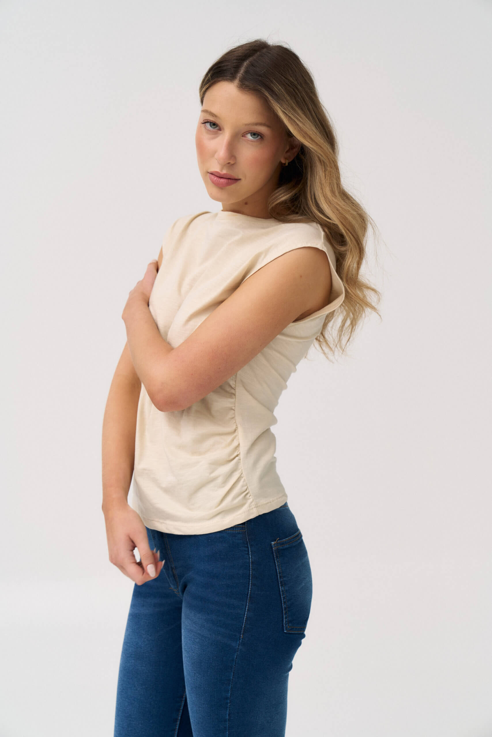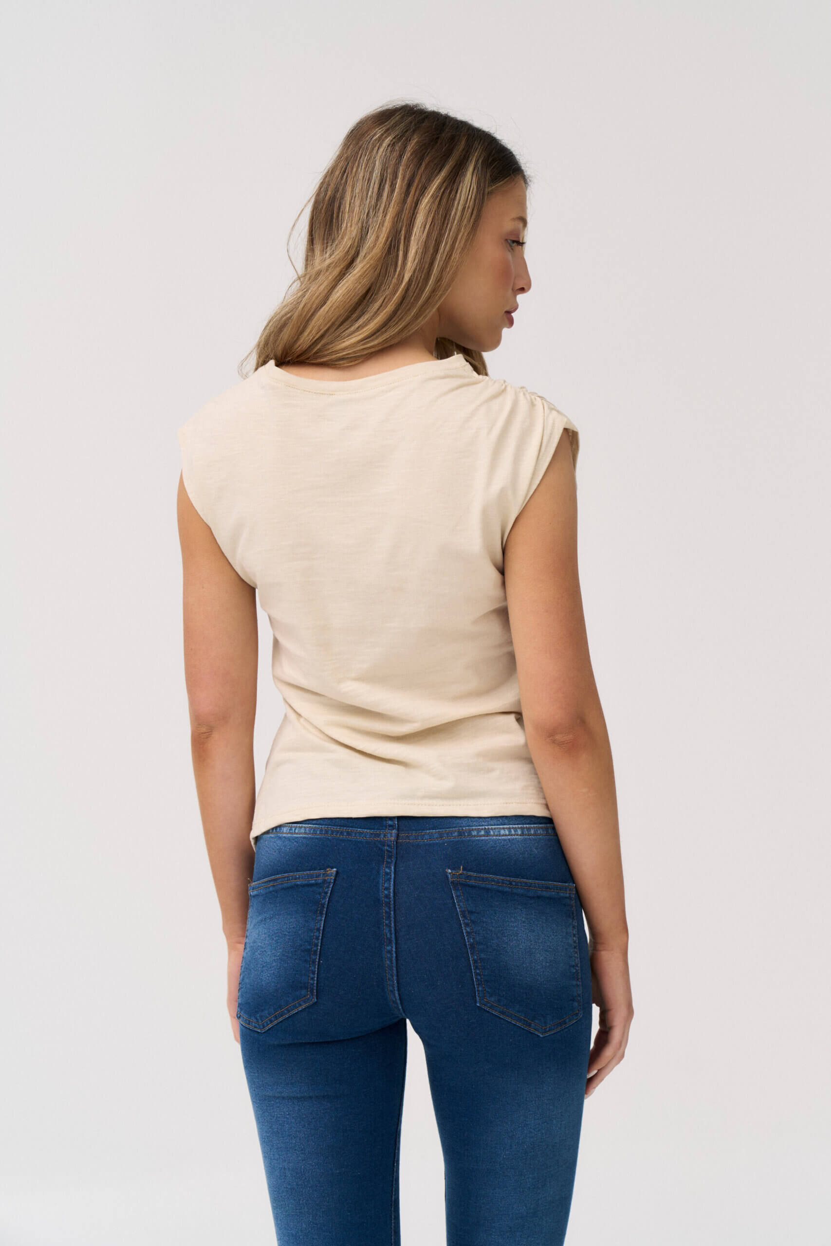 Remera asimetica sin manga, hombro y lateral fruncido en jersey flamé.