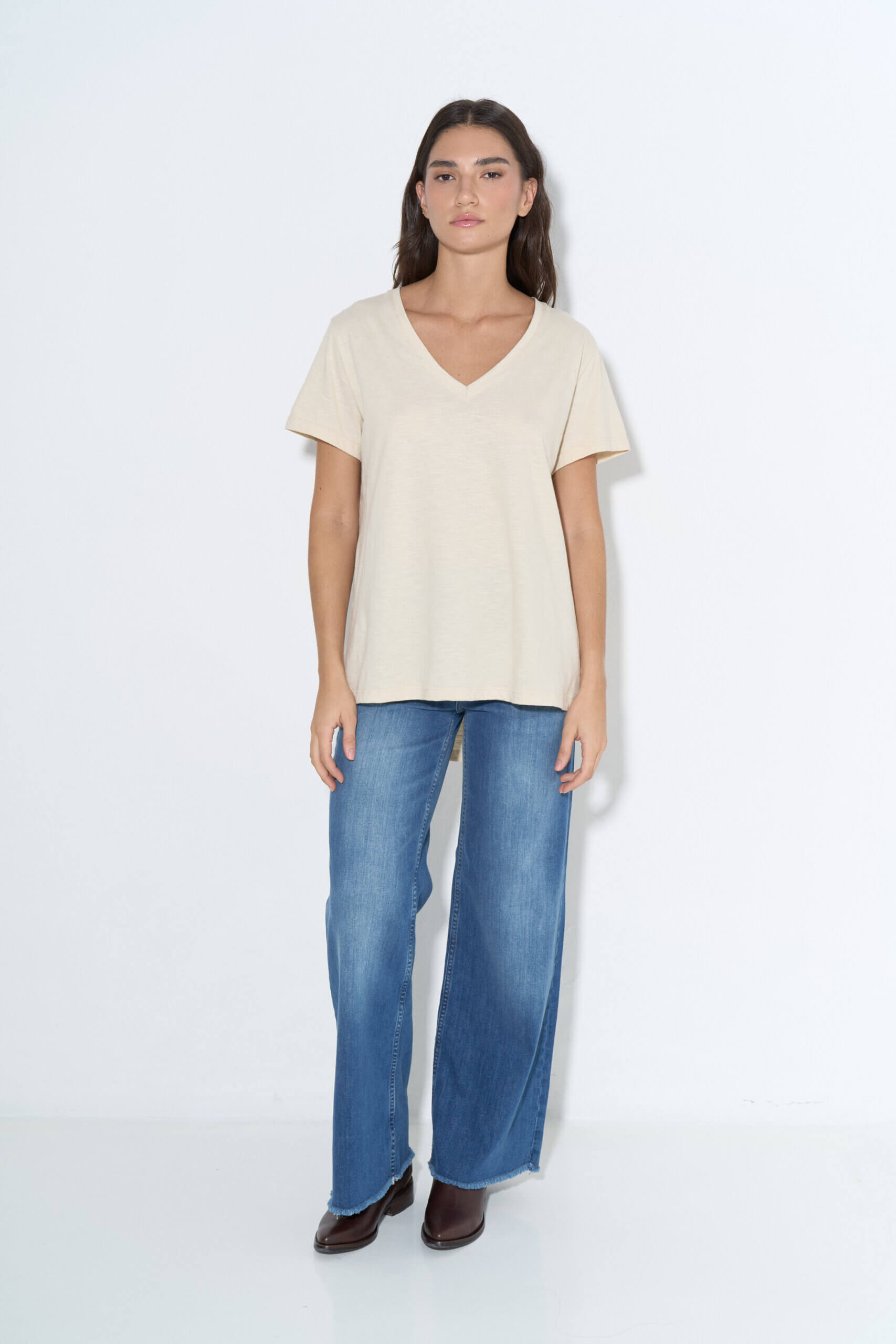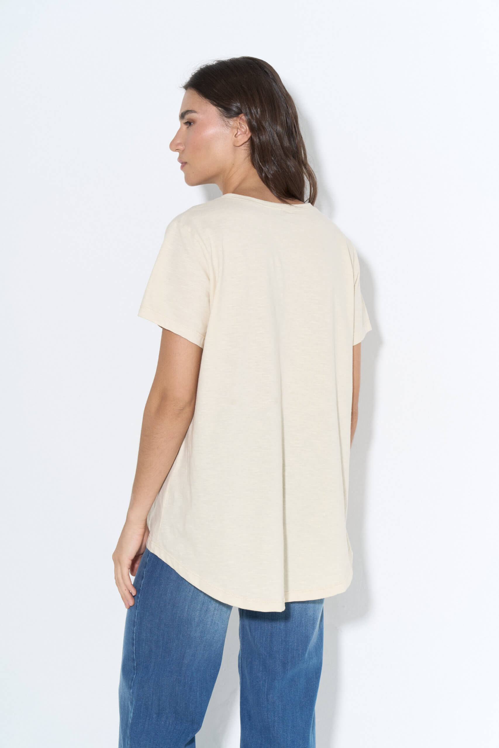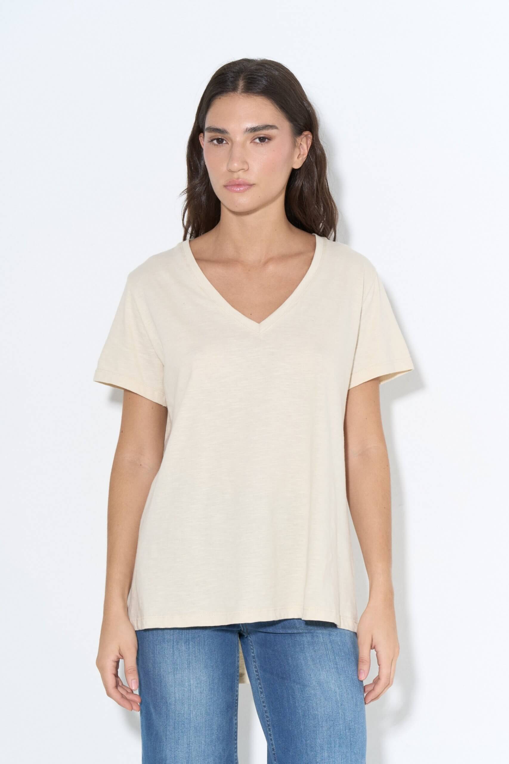 Remera plus size de jersey flamé, con escote en “V”, mangas cortas y ruedo curvo en la espalda.