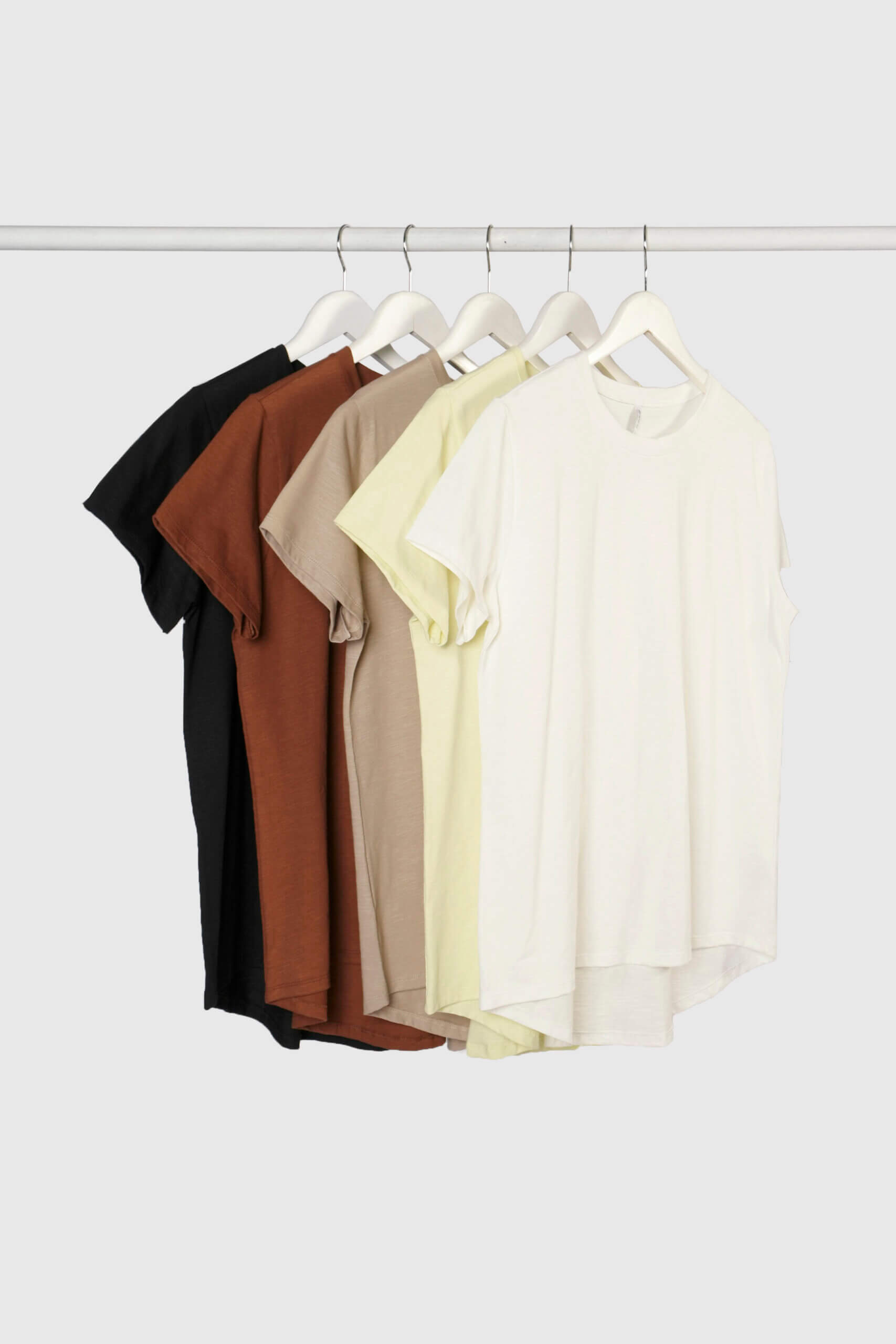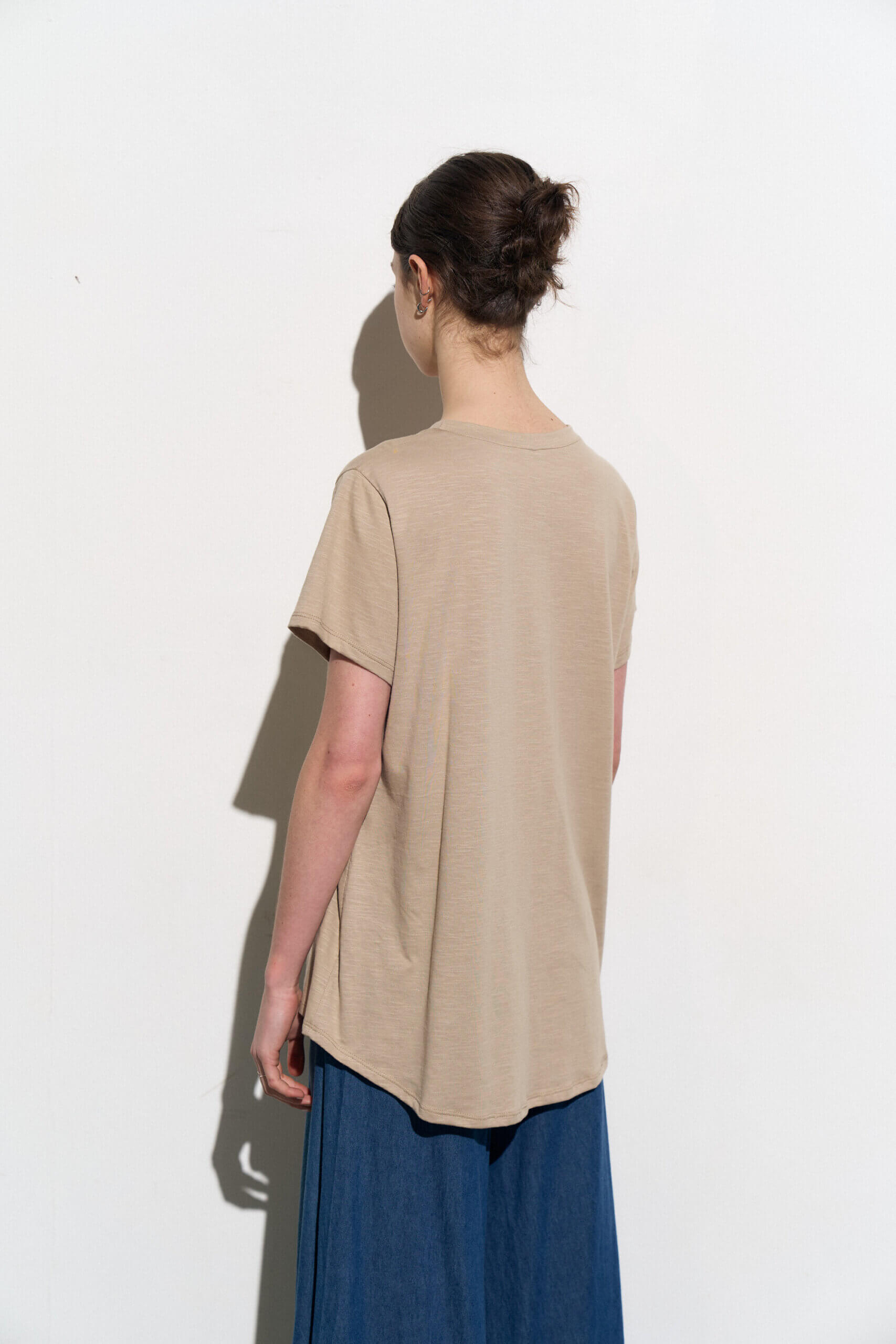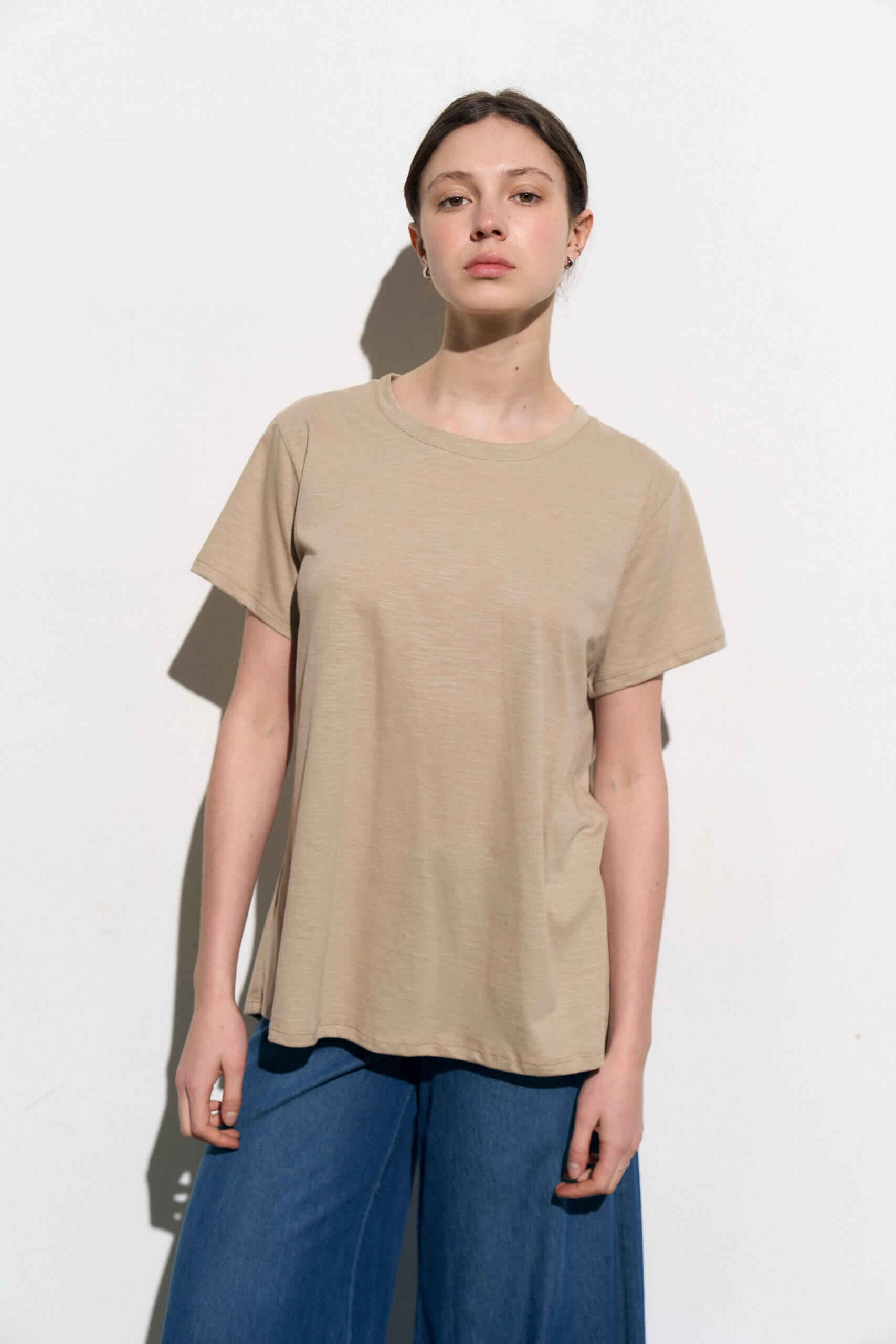 Remera plus size de jersey flamé, con escote redondo, mangas cortas y ruedo curvo en la espalda.