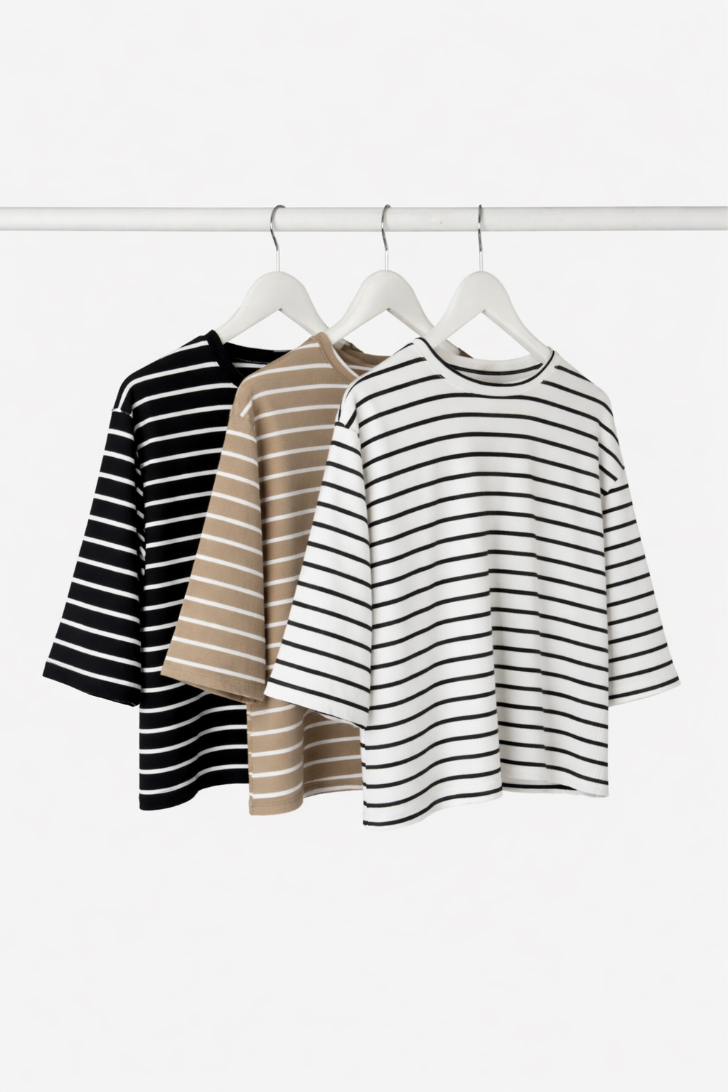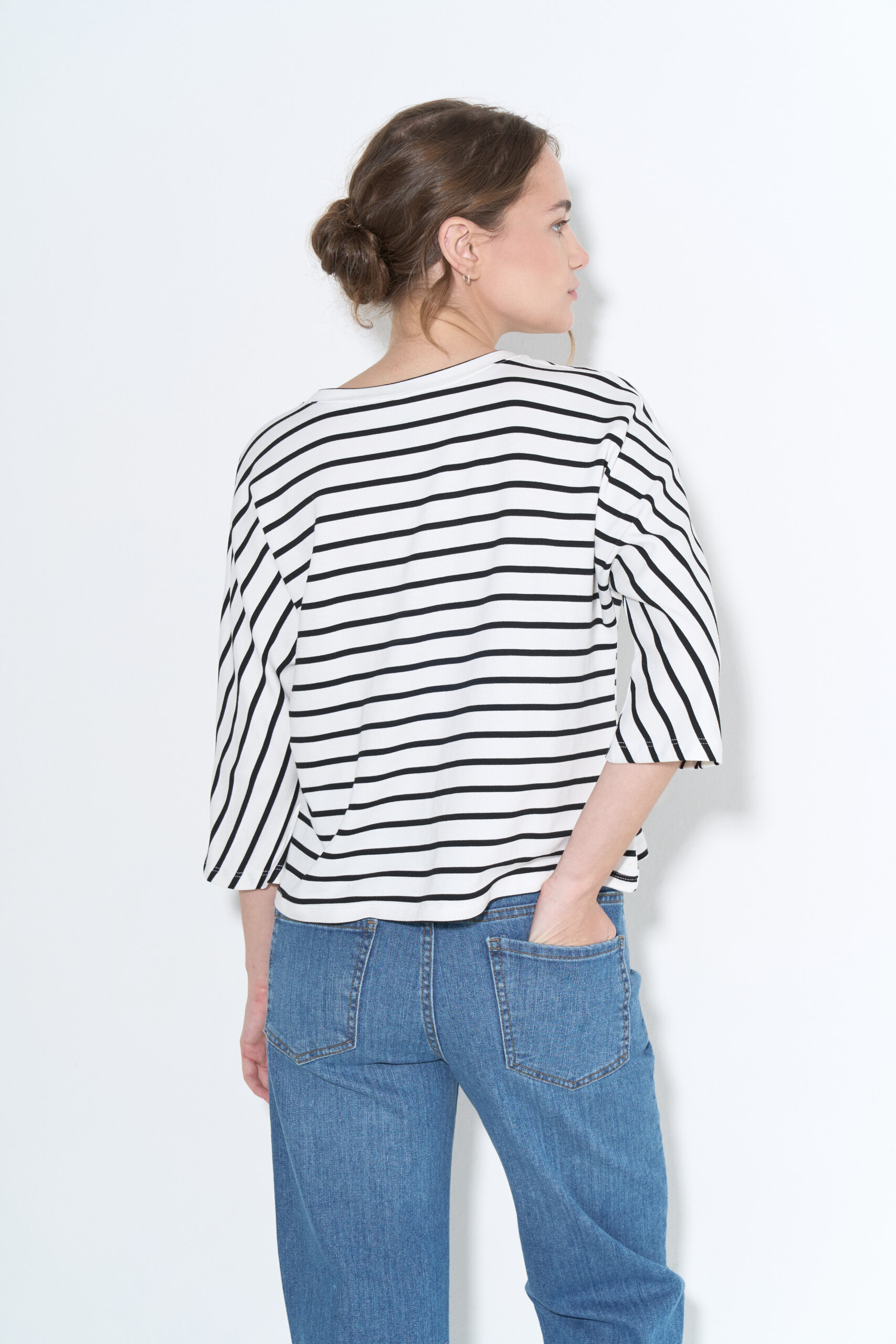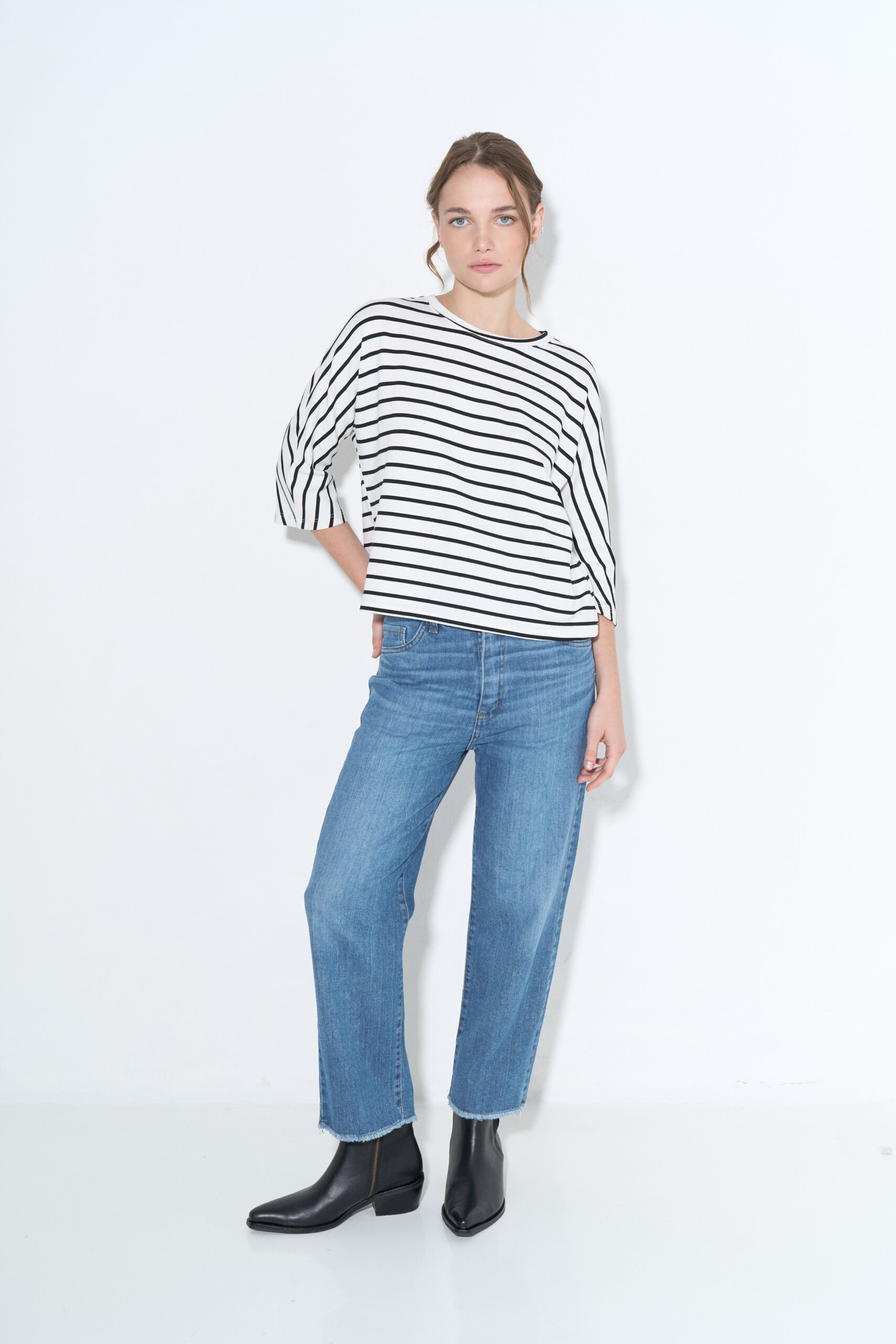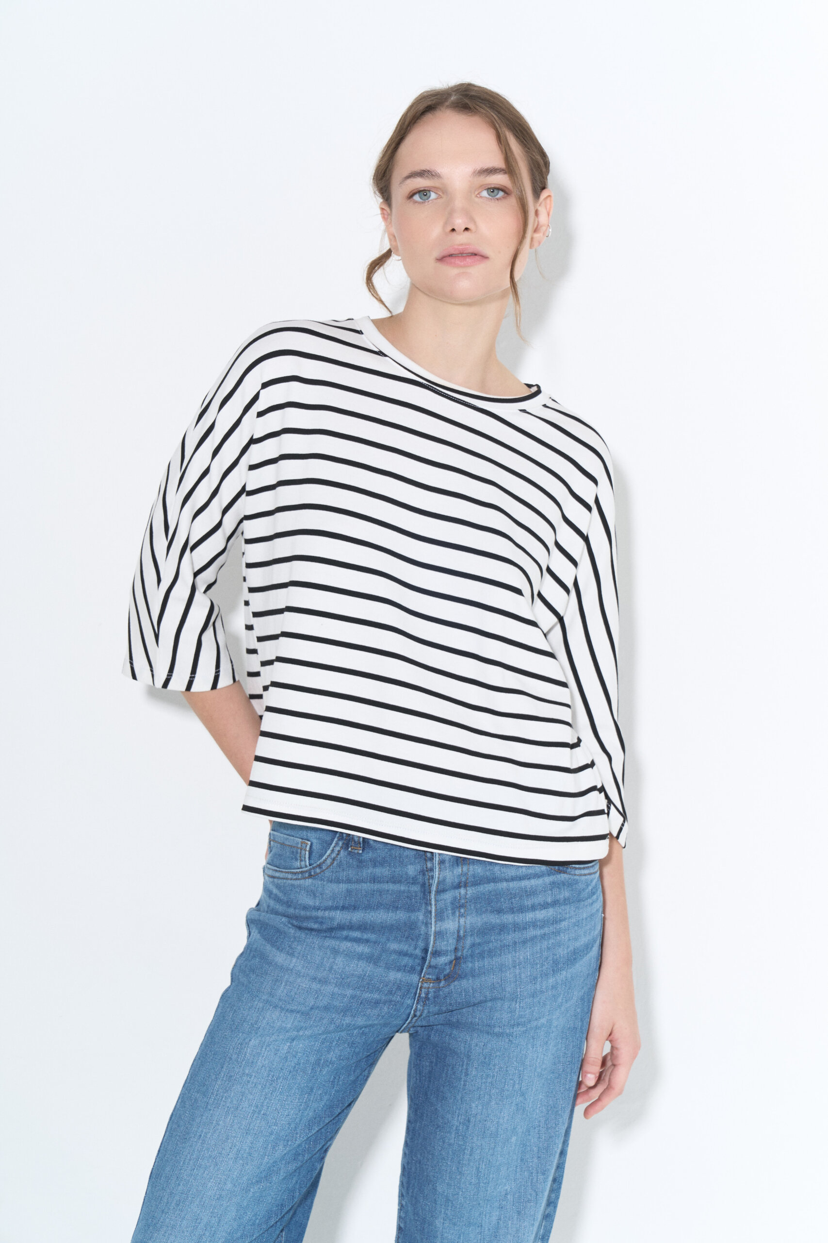 Remera amplia escote redondo manga murcielago larga en jersey rayado