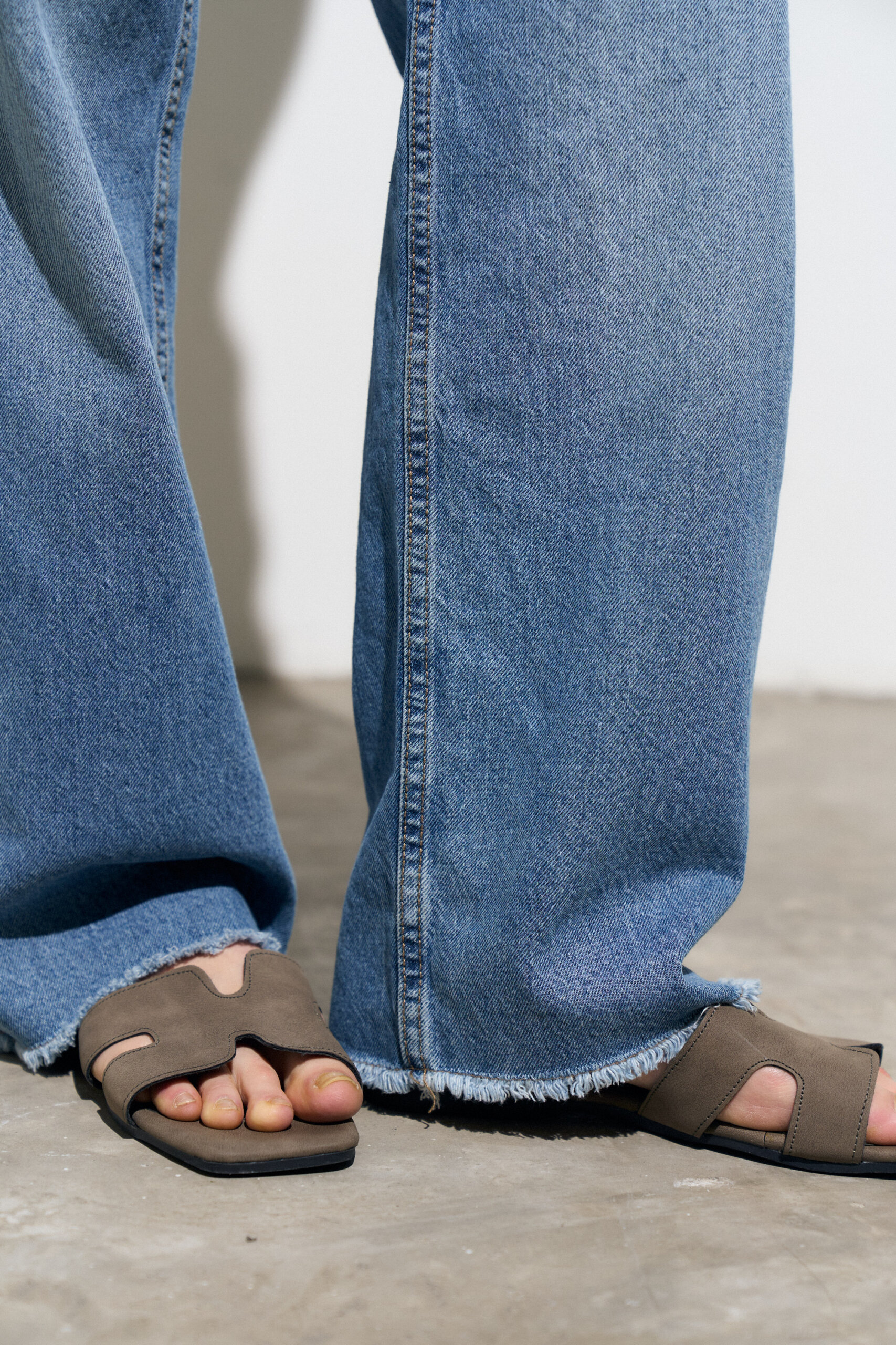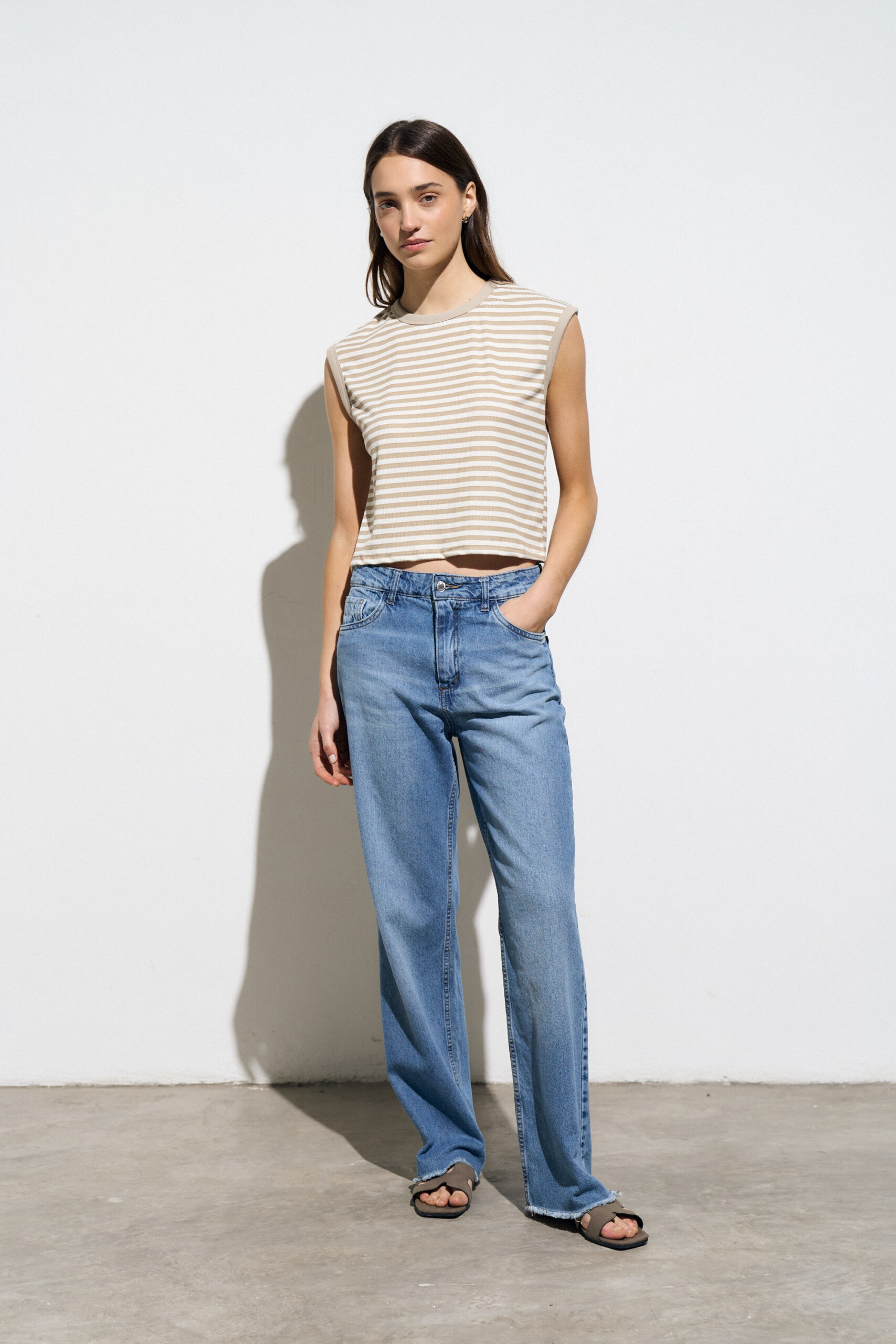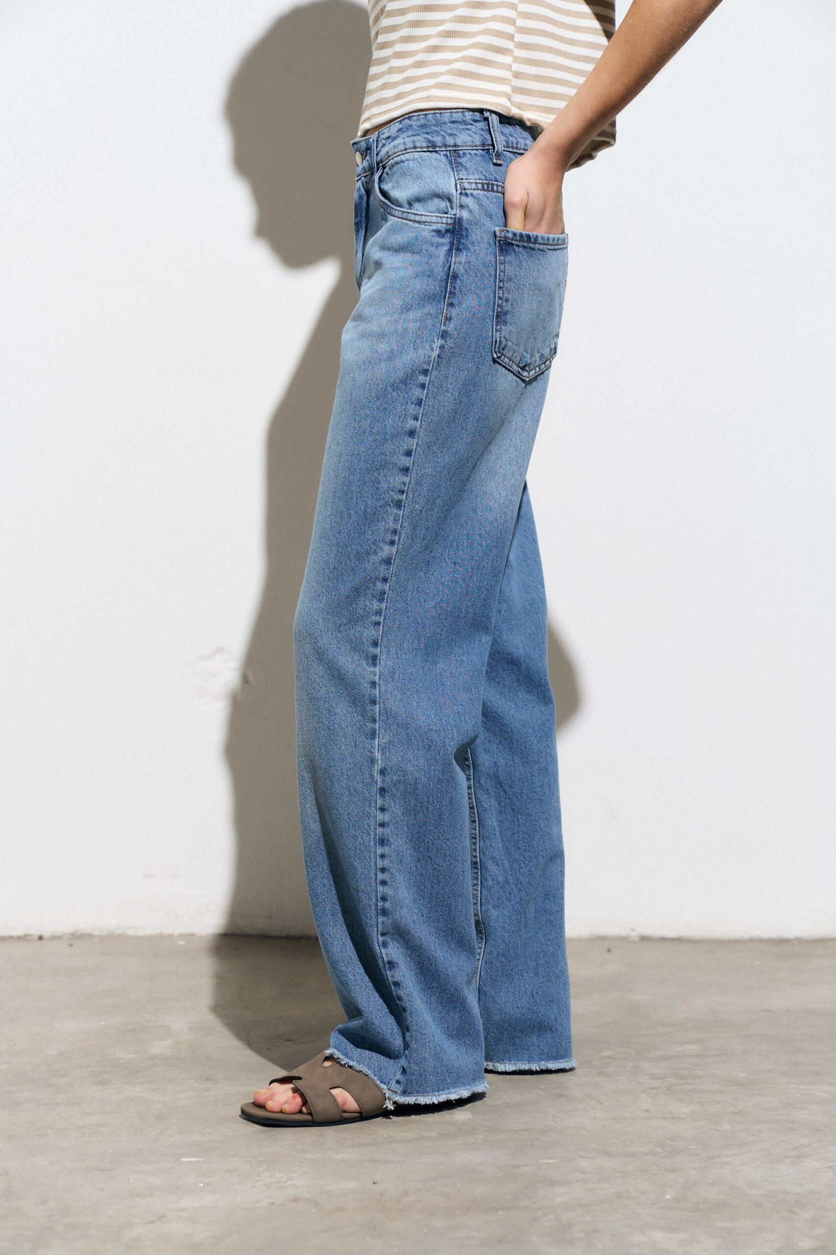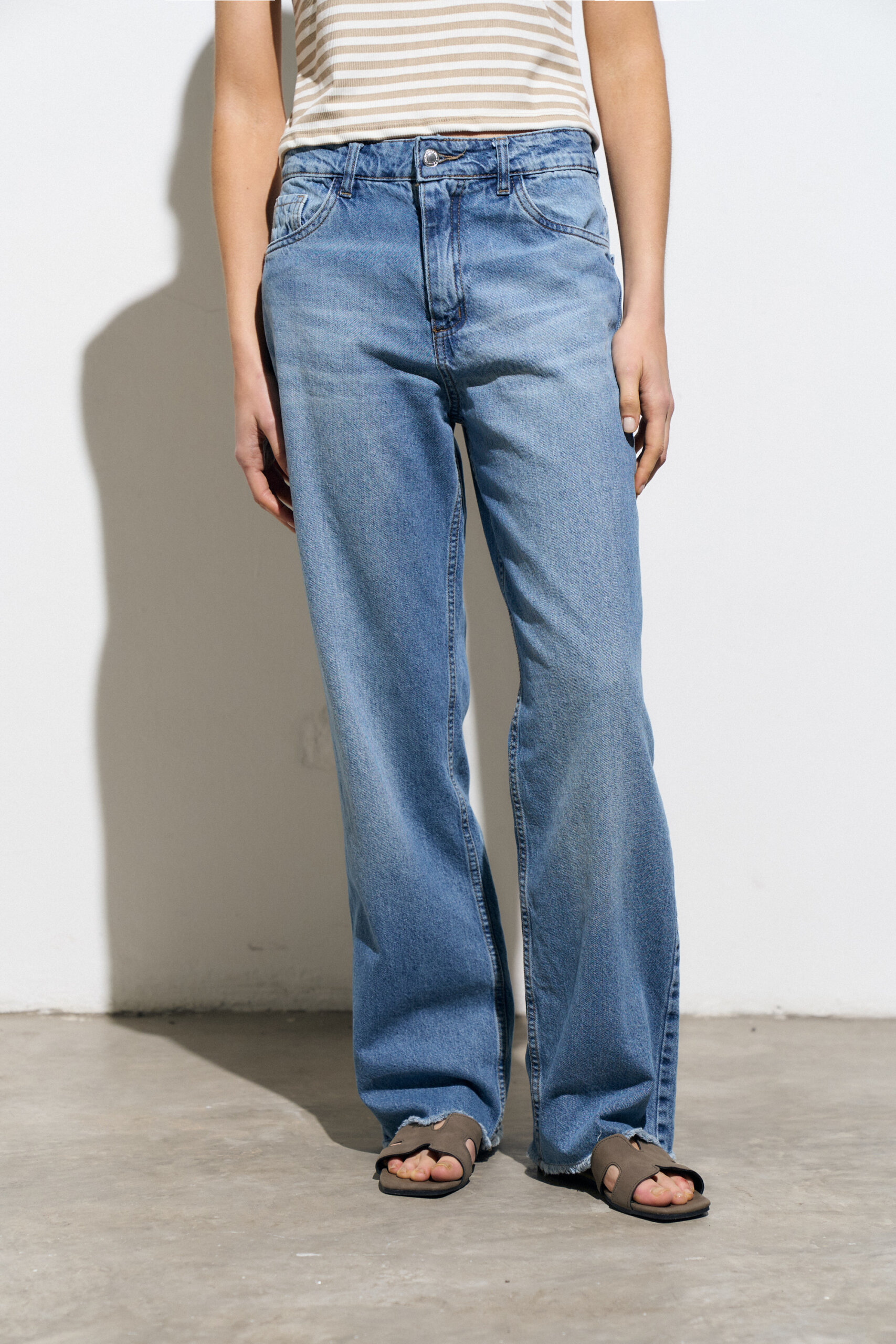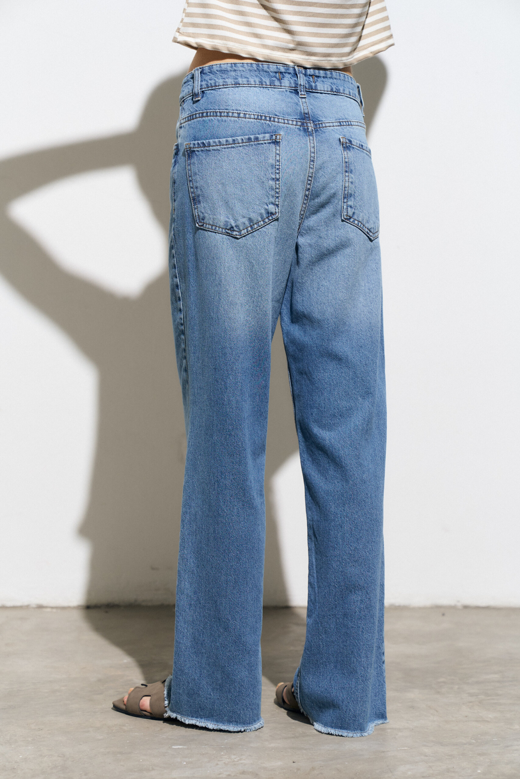 Straight leg rígido tiro medio 5 bolsillos, con ruedo al corte.