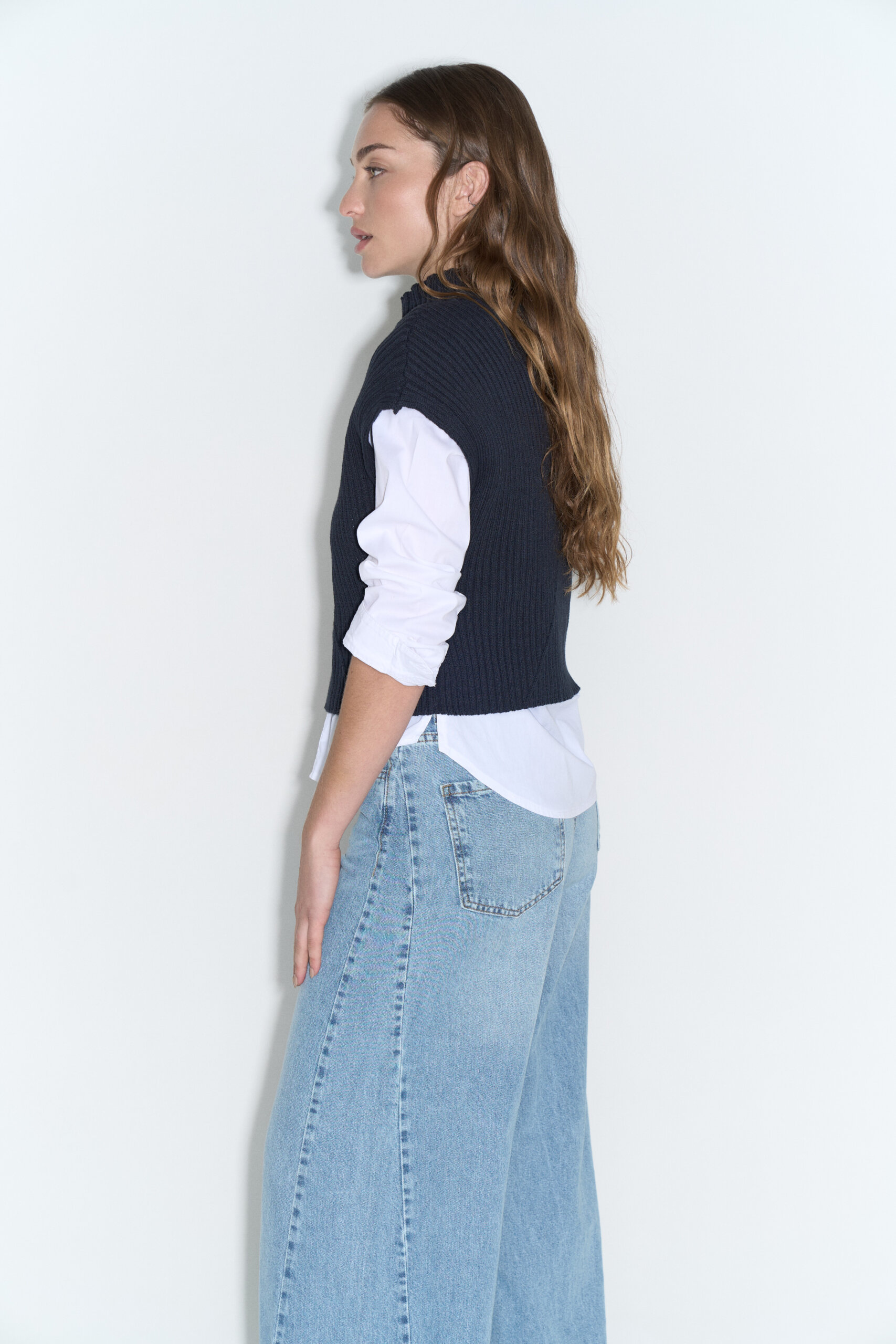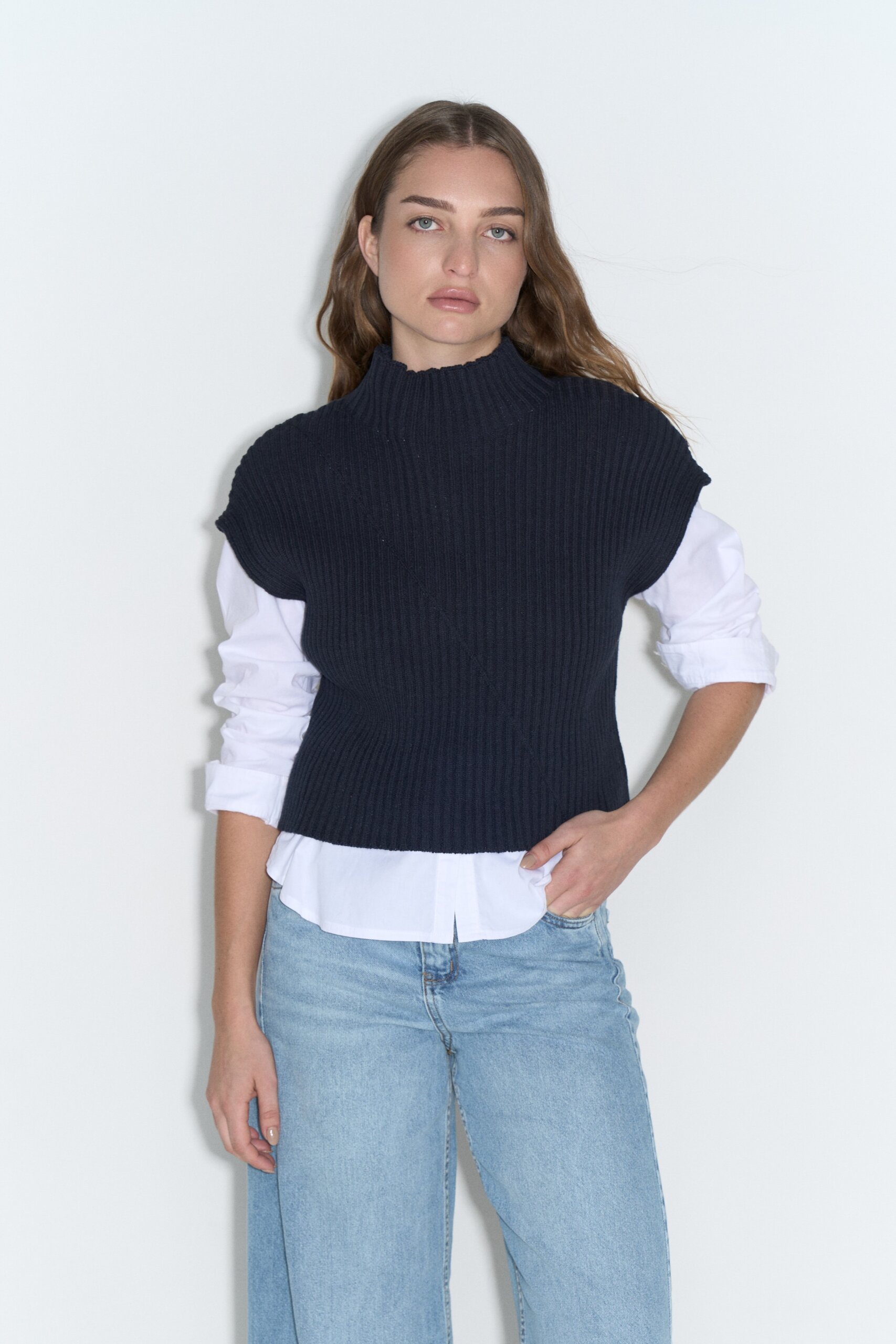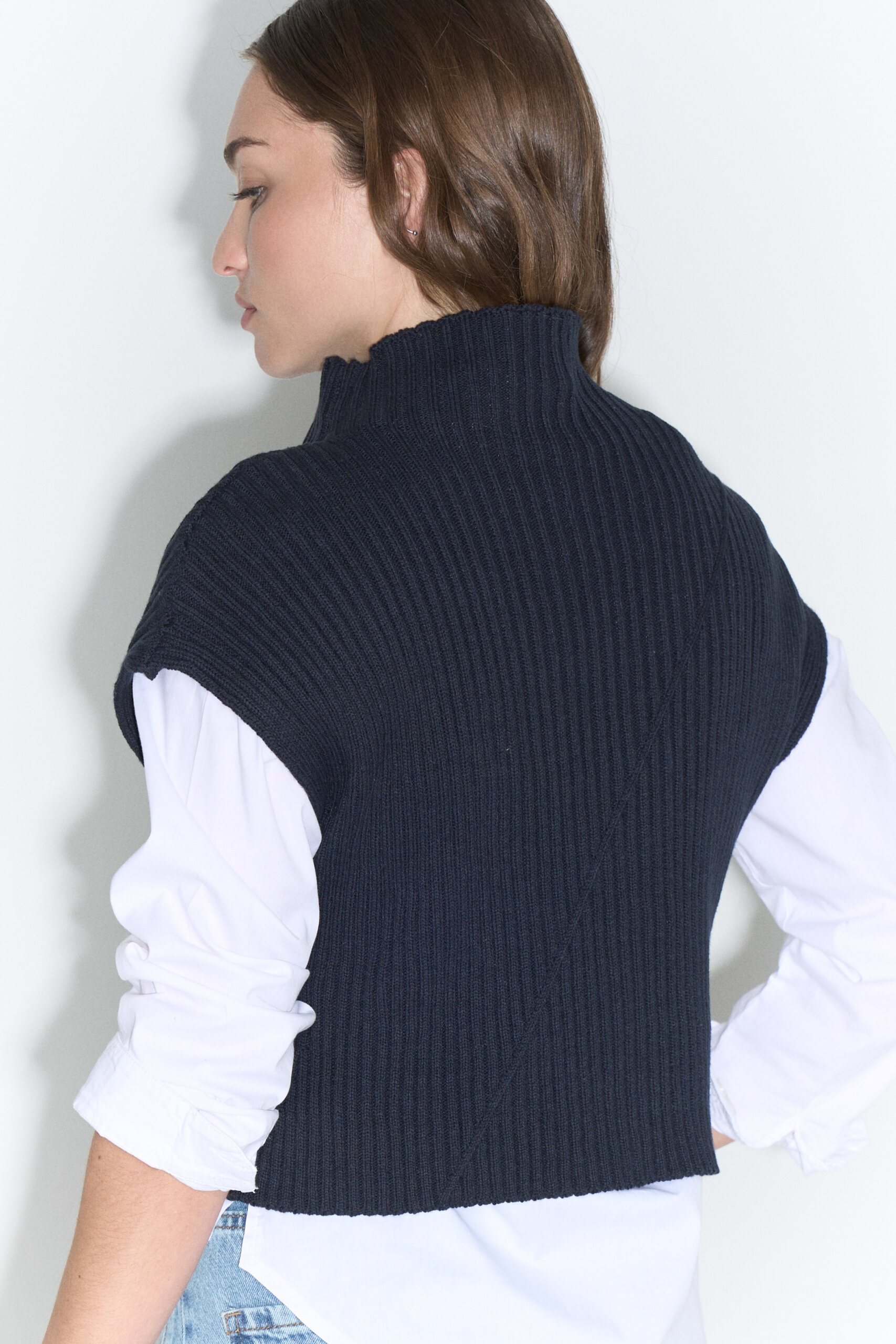 Media polera de punto ribb ancho de hilado de algodón grueso con recorte diagonal, sin mangas