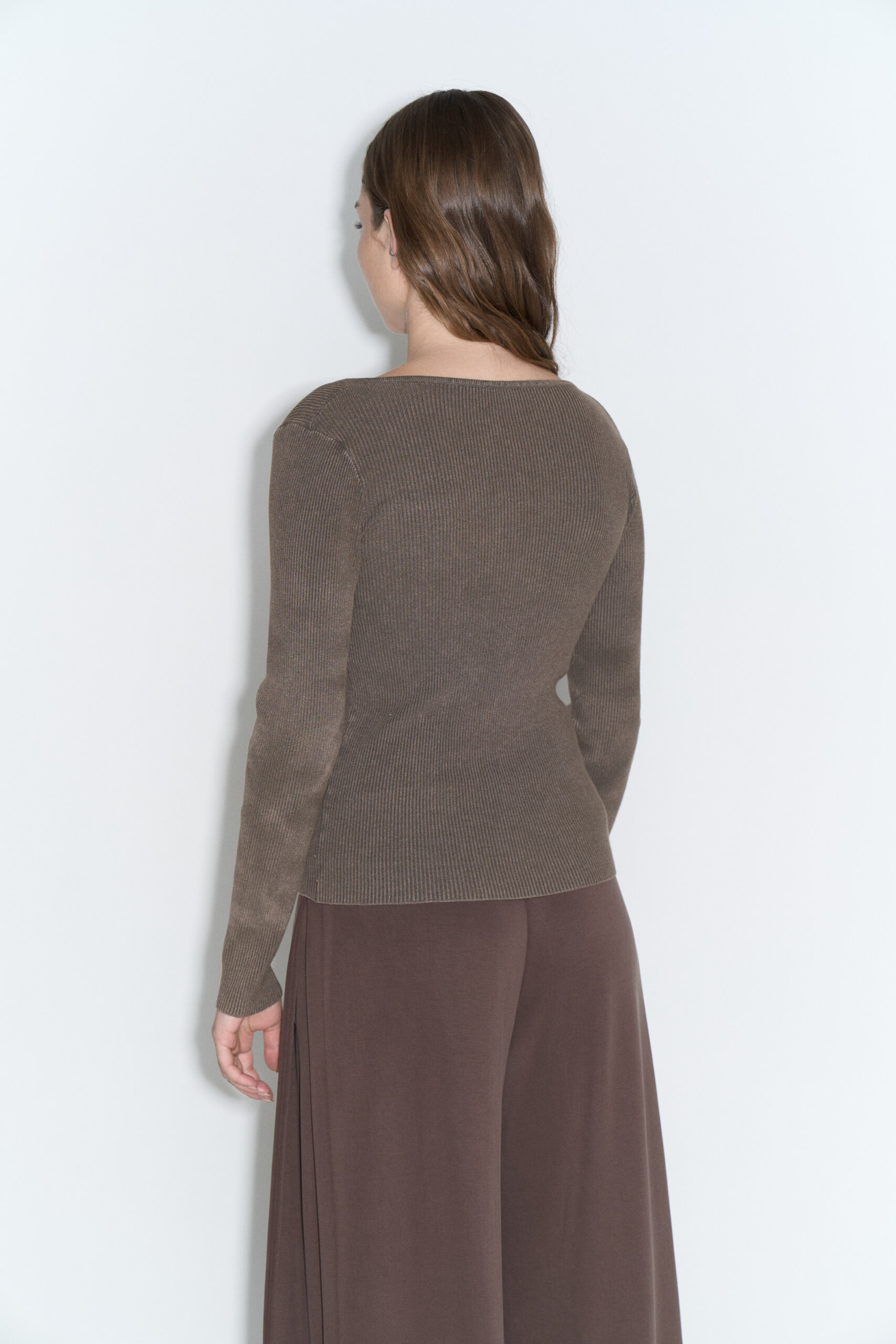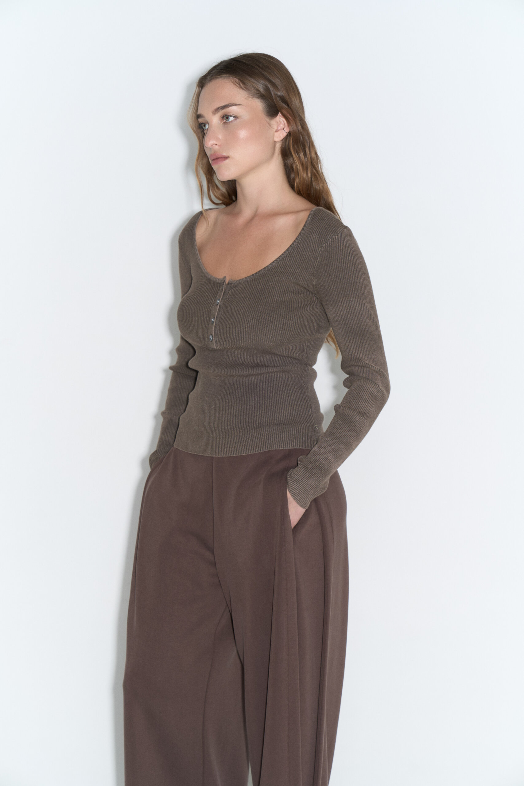 Remera tejida en punto ribb con efecto diesel y cartera 3/4 aboronada