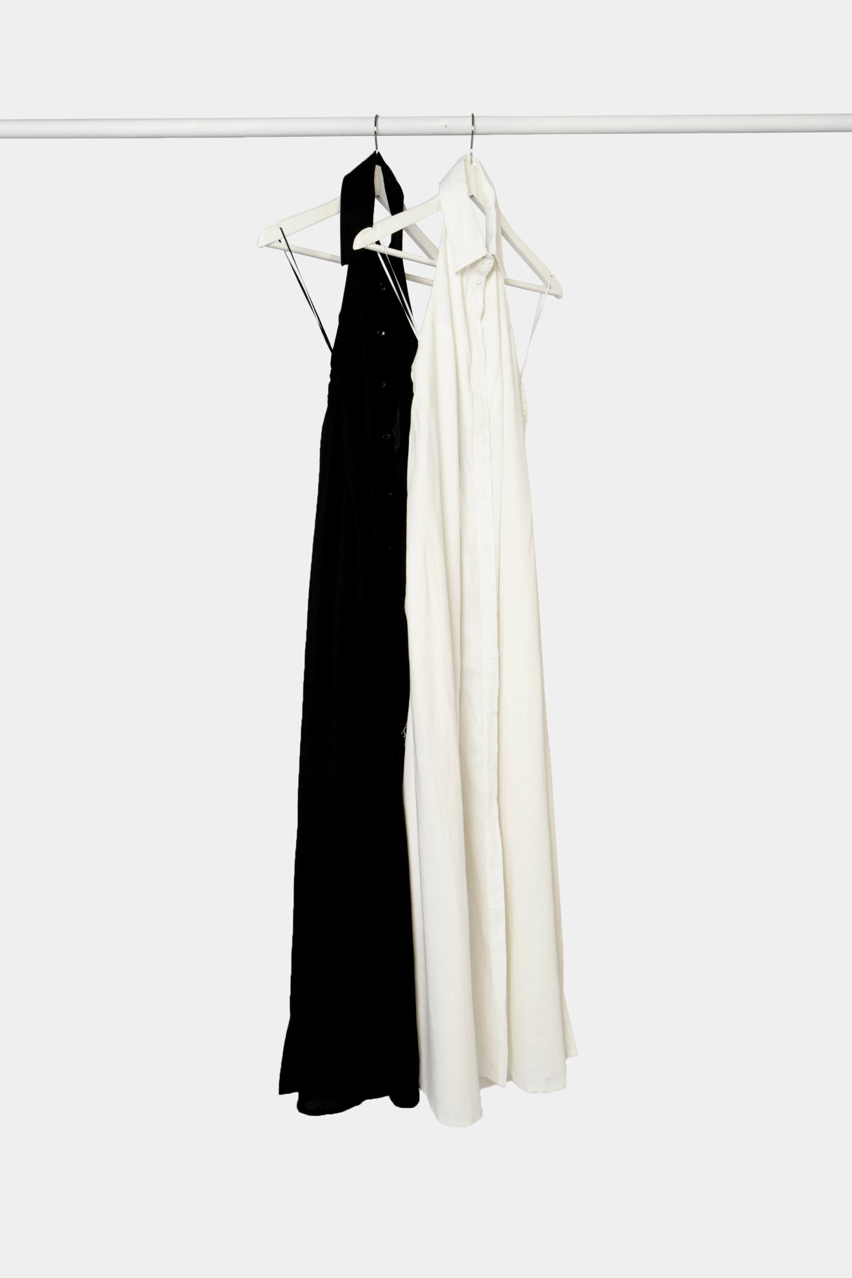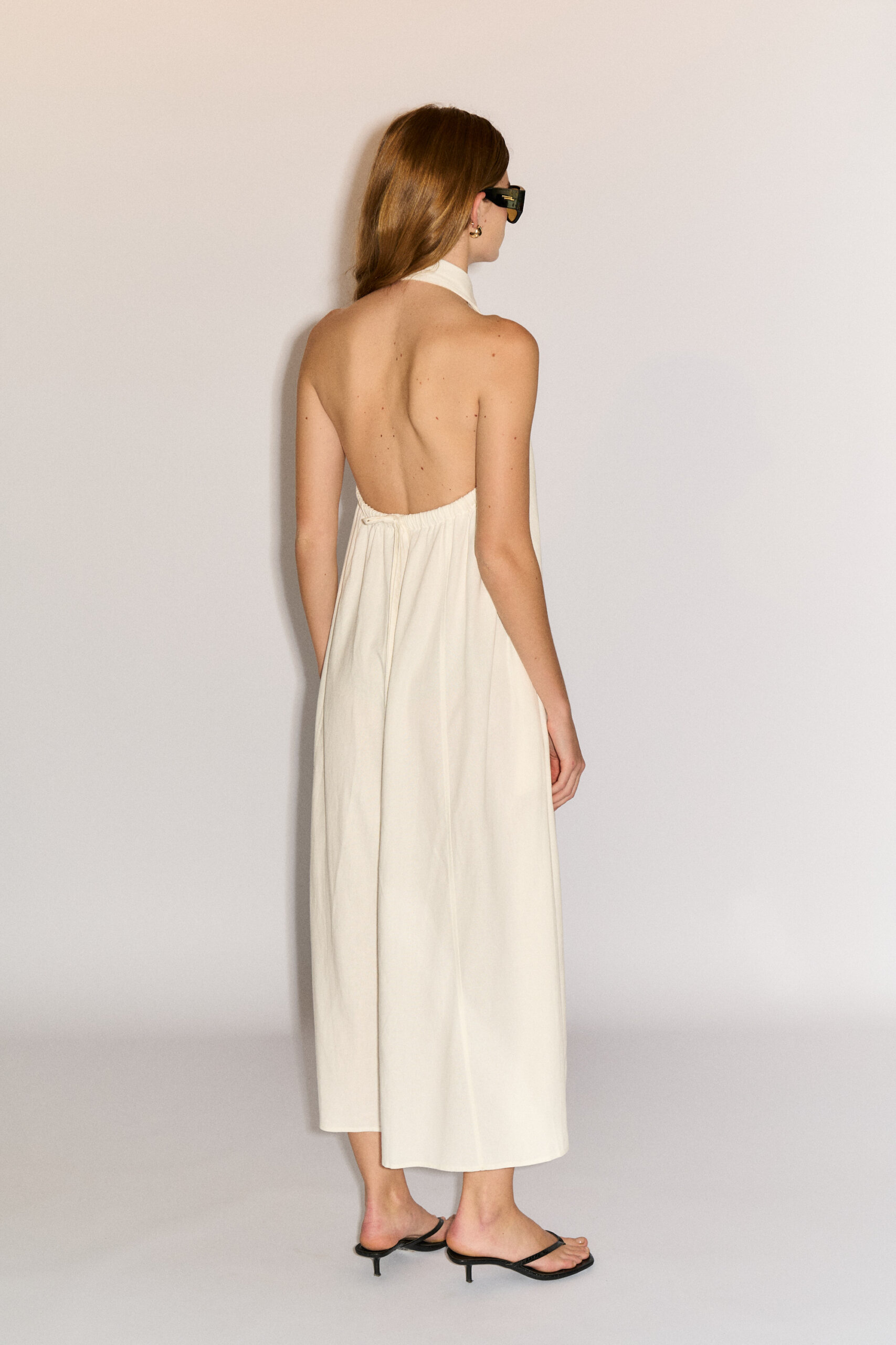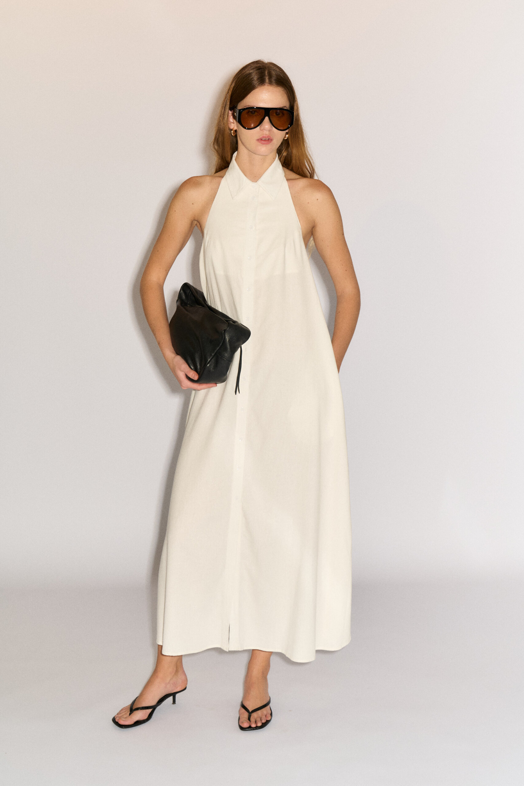 Vestido halter de lino con cuello camisero y espalda regulable.
