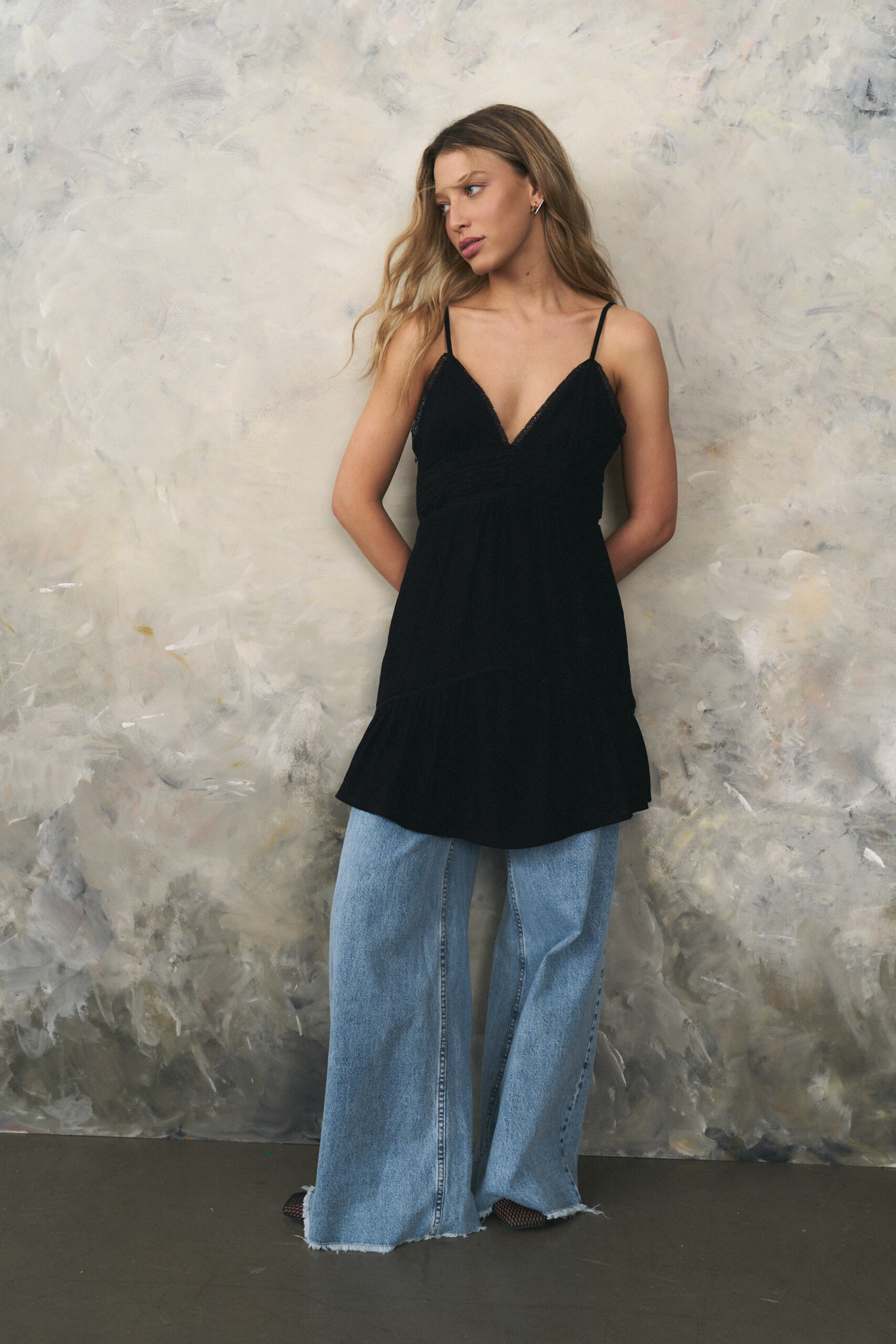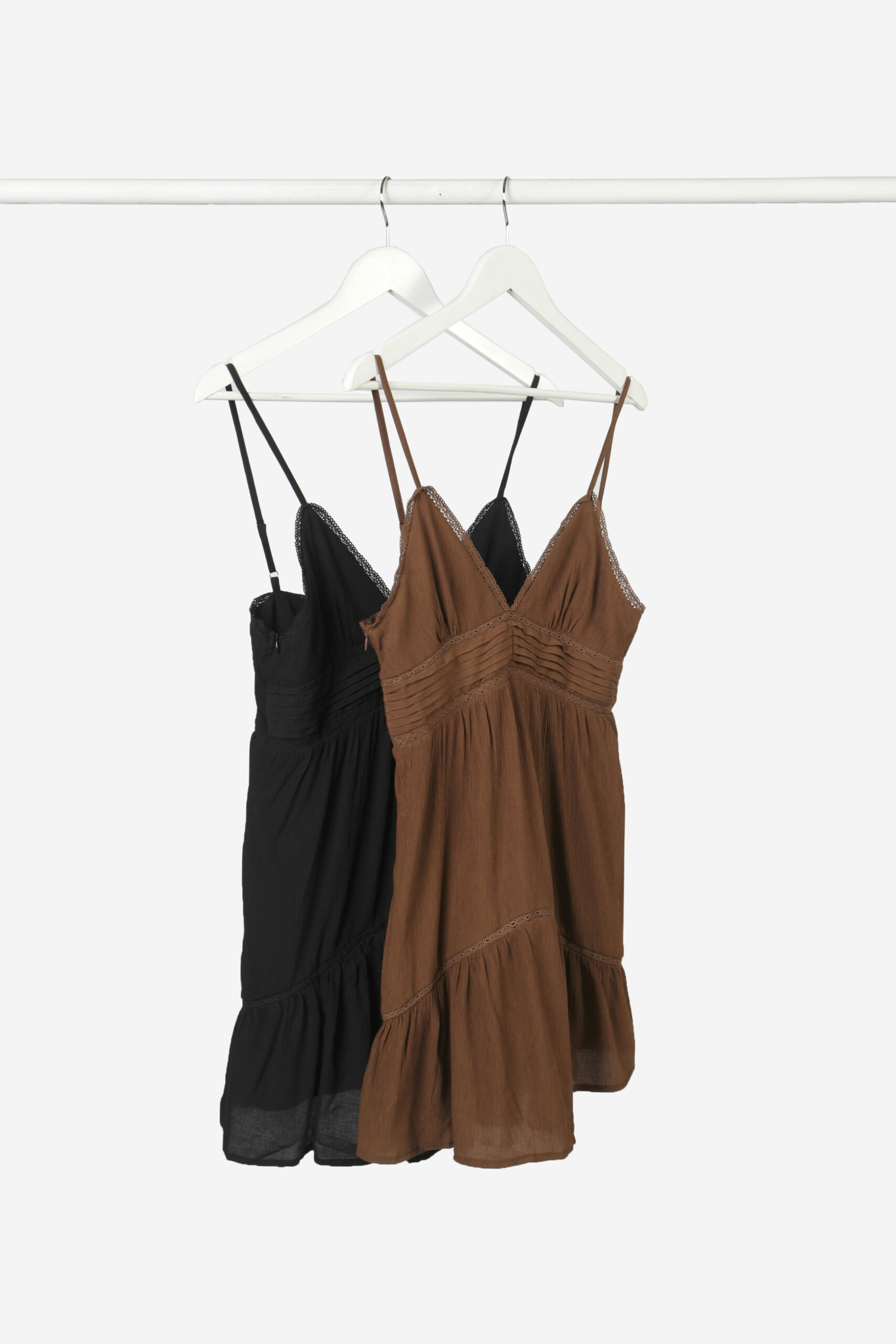 Mini vestido de satin texturado con puntillas y volado en ruedo.