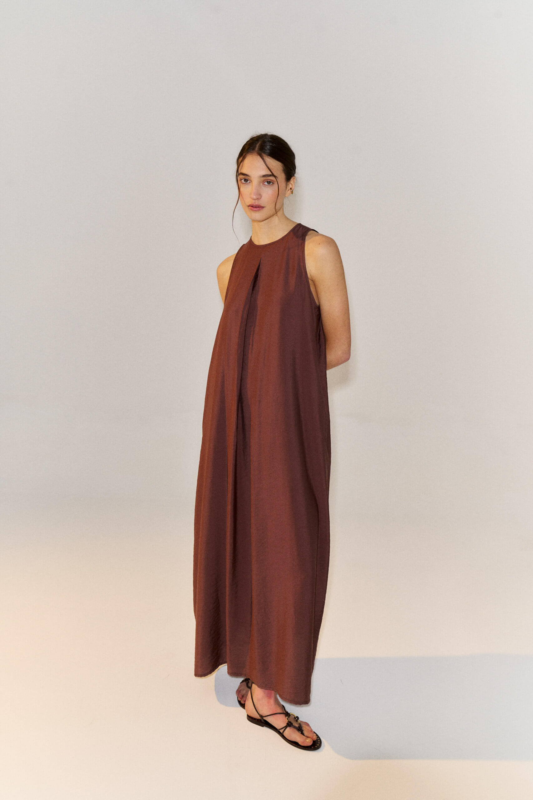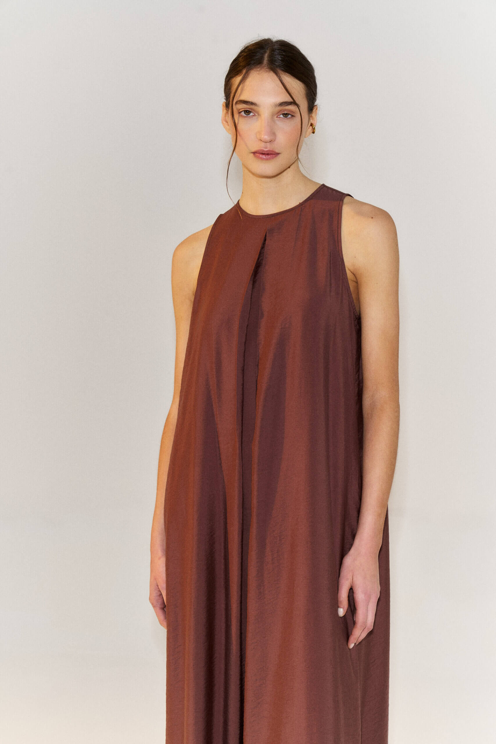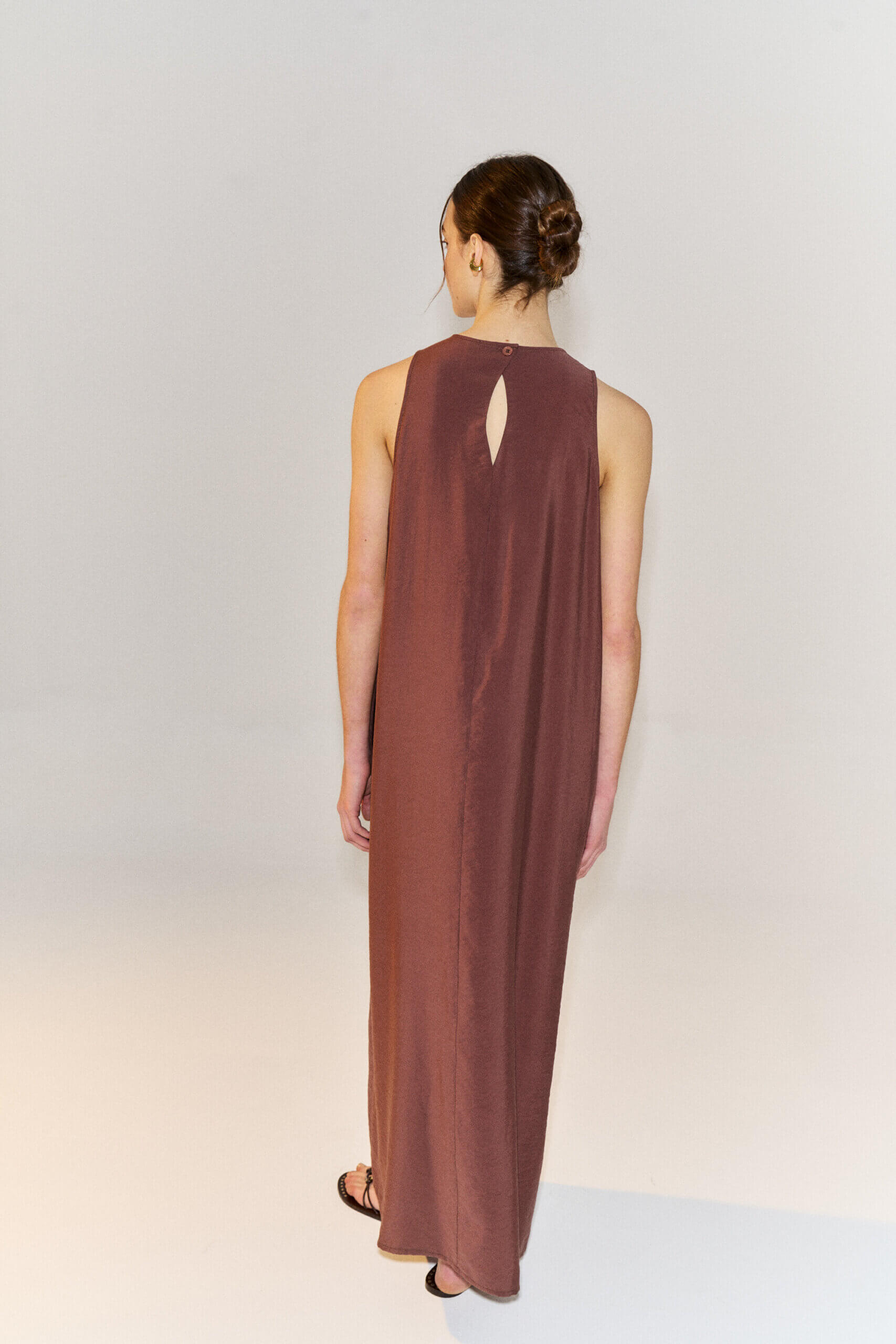 Maxi vestido midi con escote redondo y manga sisa. Cierre en espalda con boton a tono. Confeccionado en viscosa satinada.