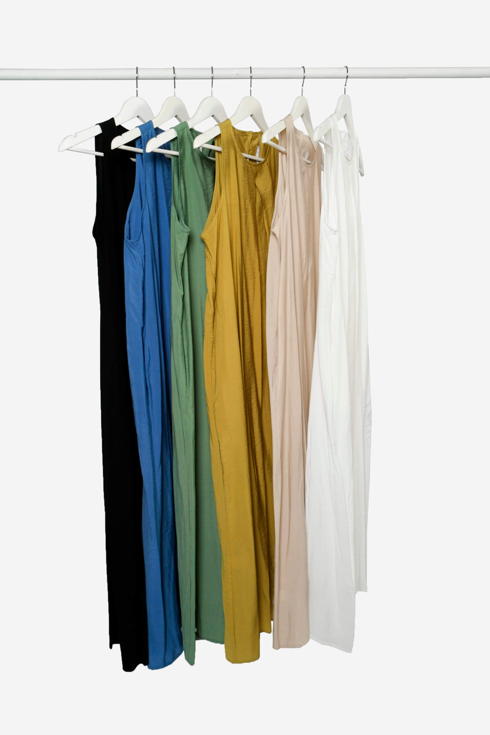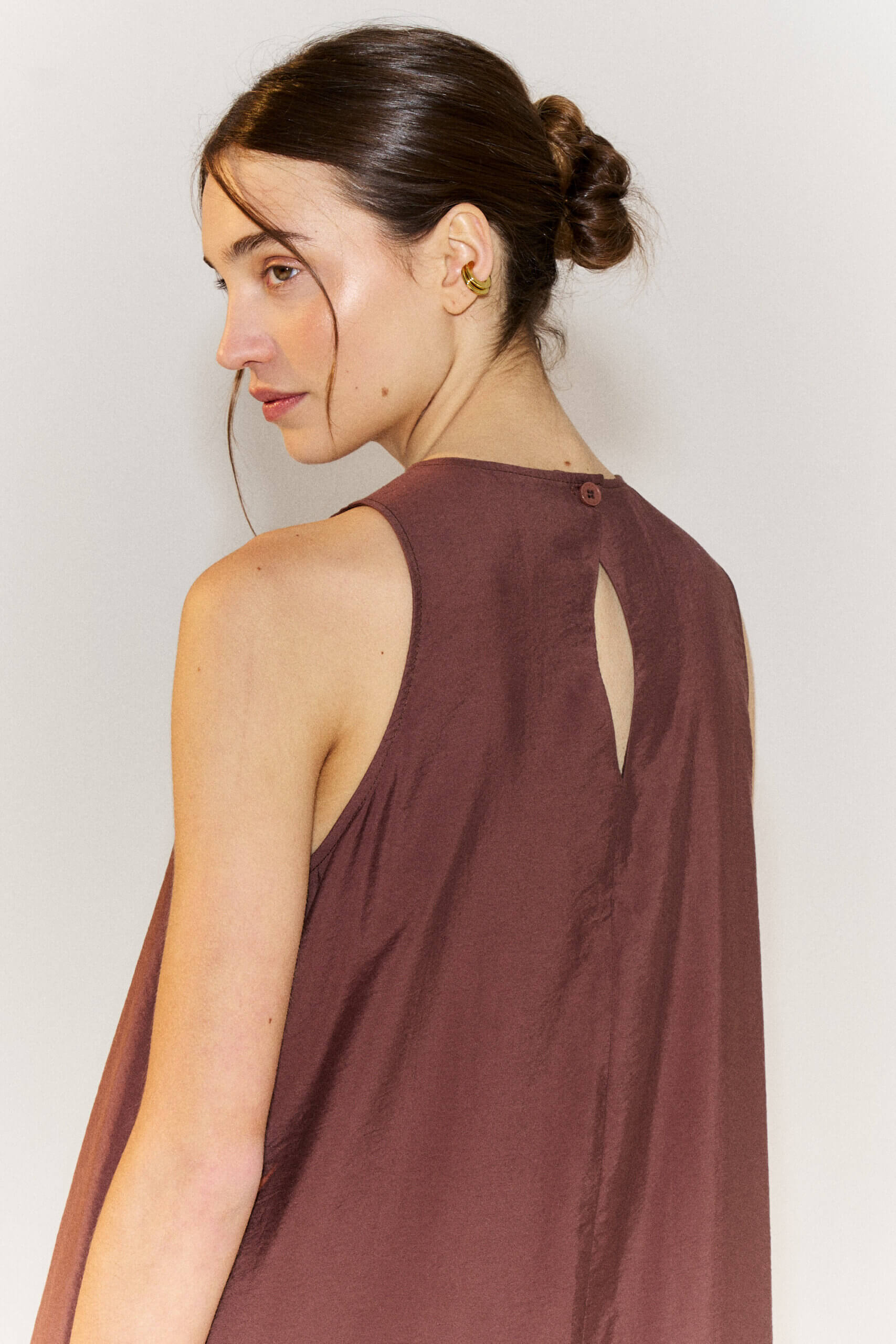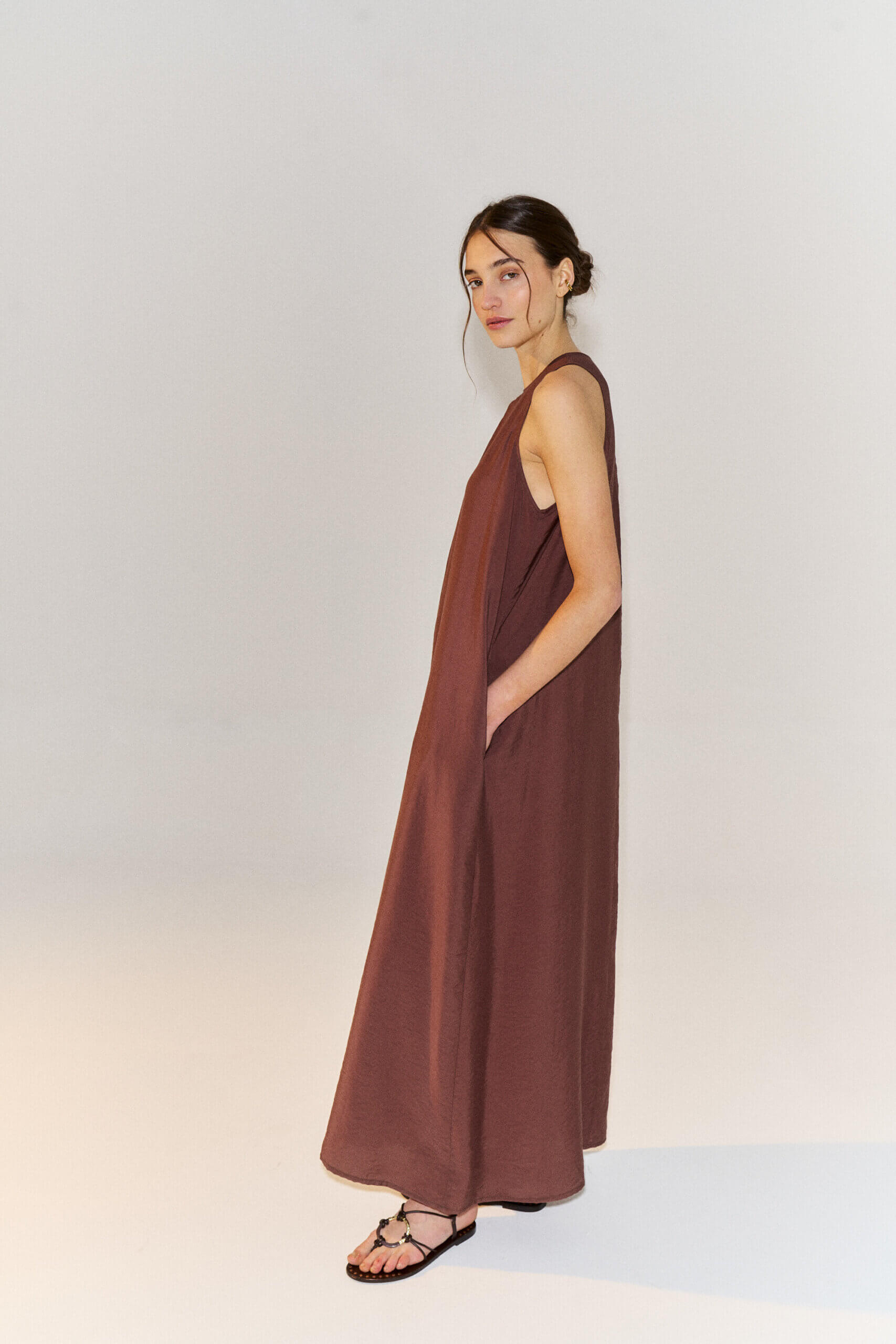 Maxi vestido midi con escote redondo y manga sisa. Cierre en espalda con boton a tono. Confeccionado en viscosa satinada.