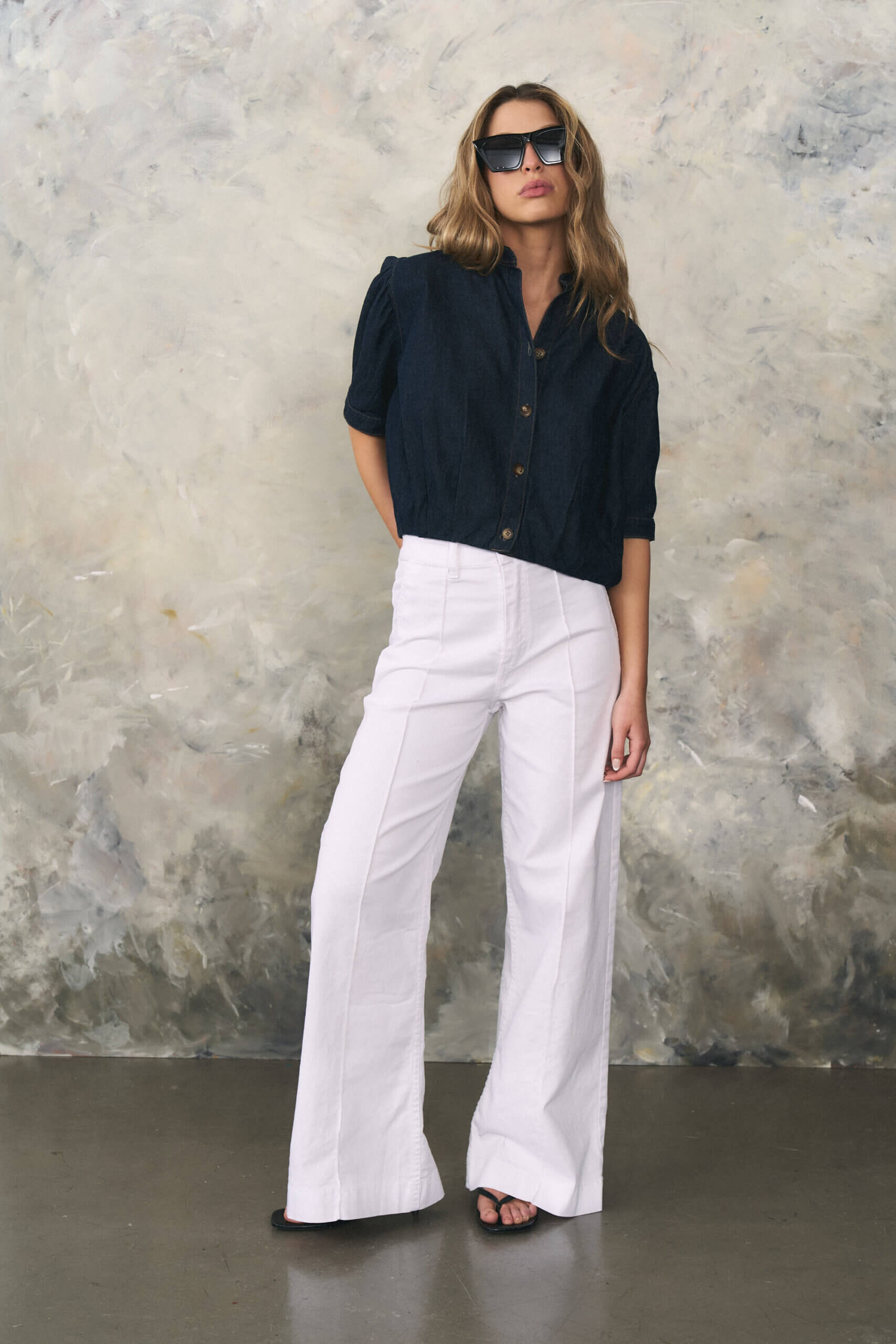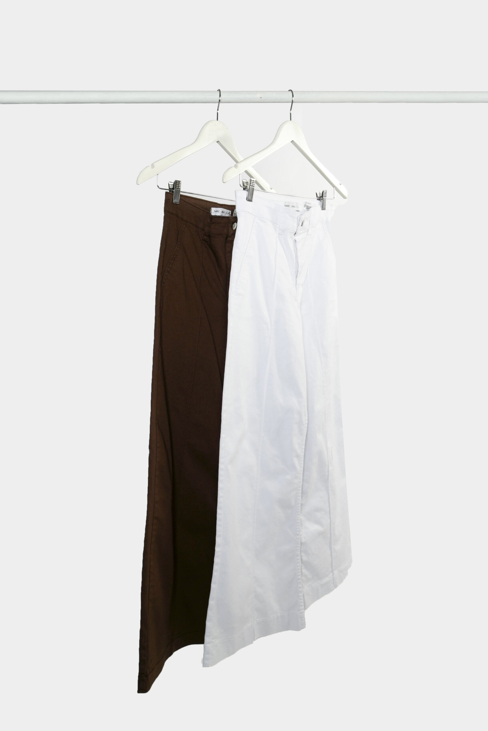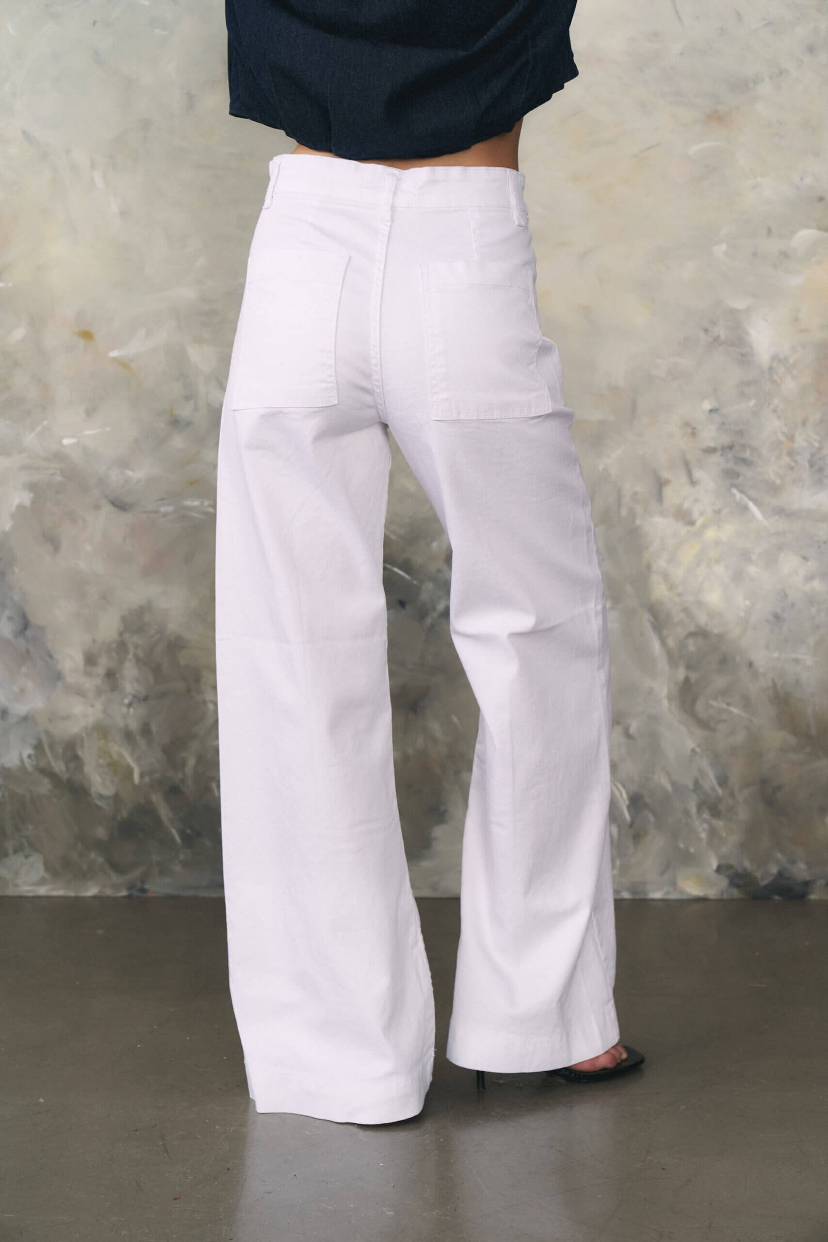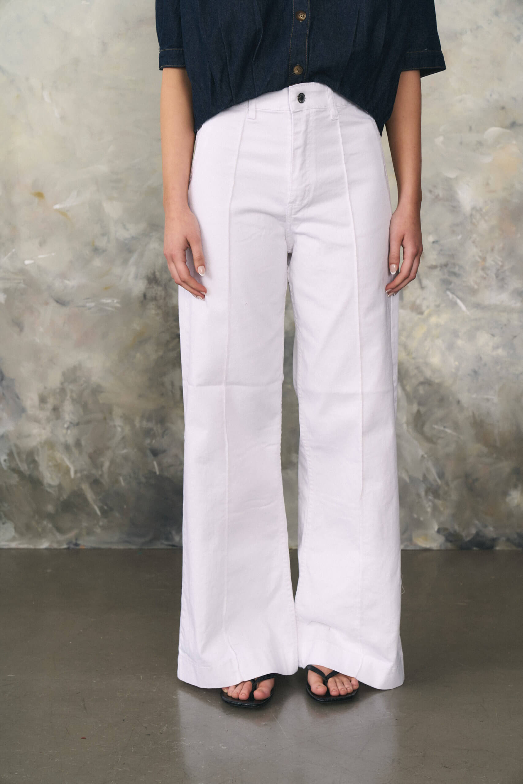 Wide leg tiro medio de gabardina elastizada con alforzas en delantero, bolsillo chino falso y ruedo ancho.