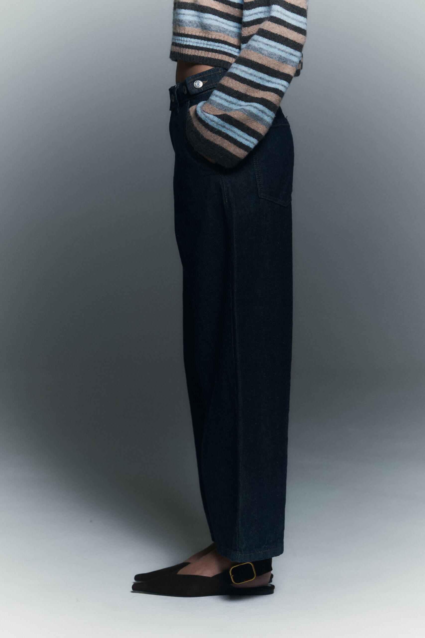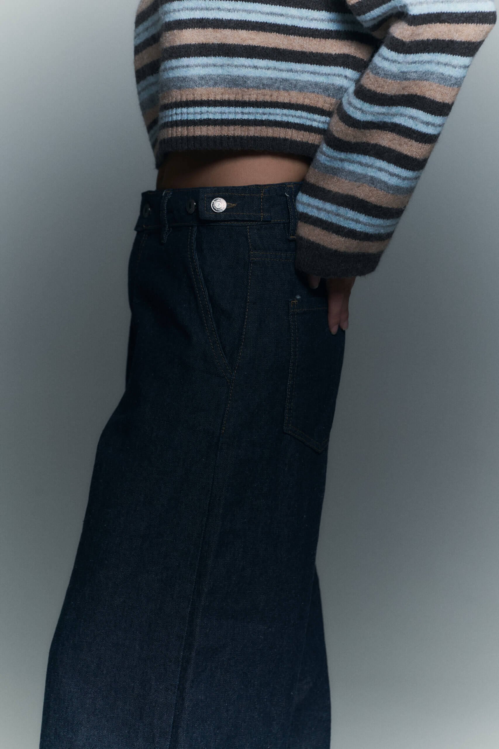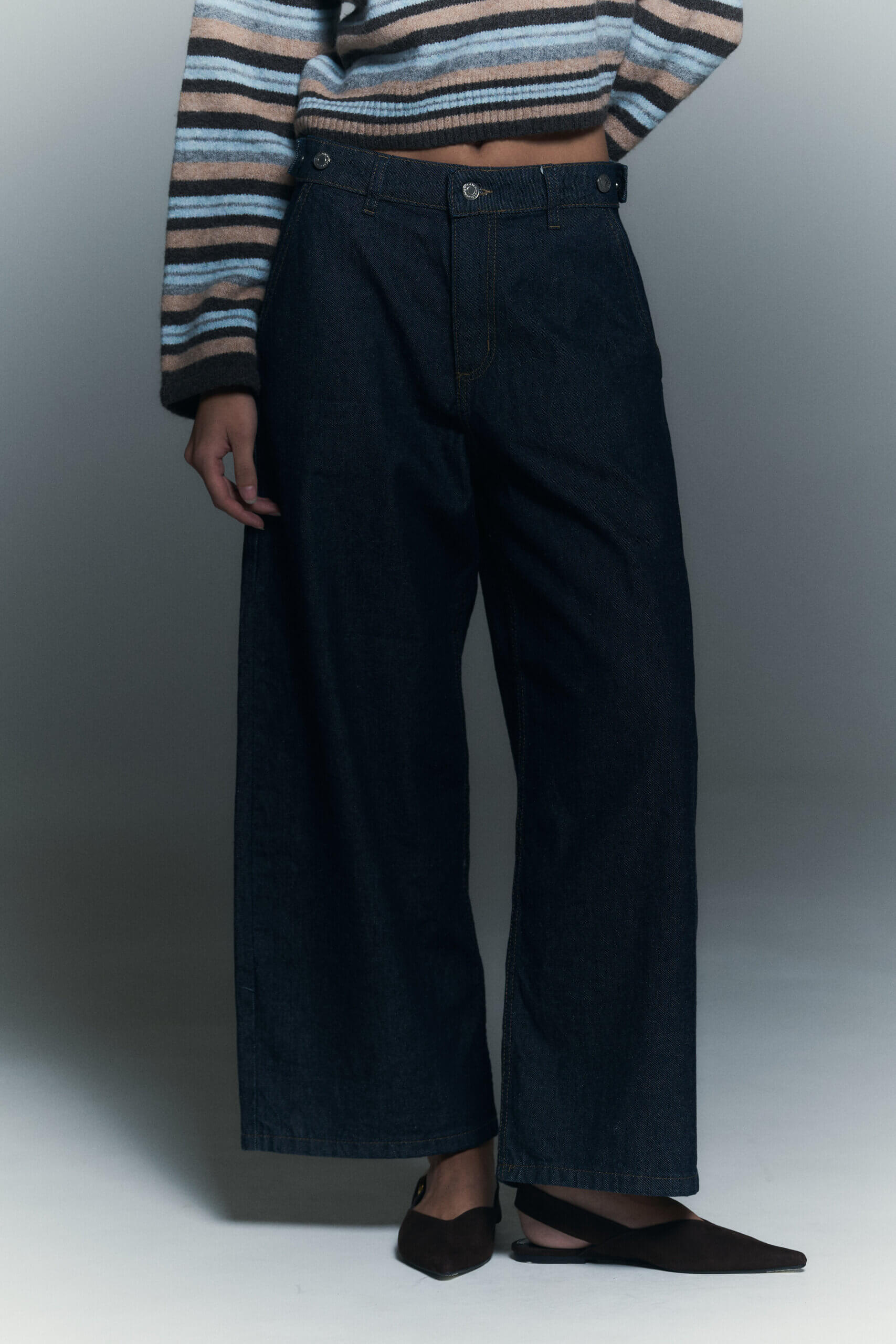 Jean wide leg 5 bolsillos con presillas y botoneria metalica en cintura que permite regular entre tiro alto y medio.