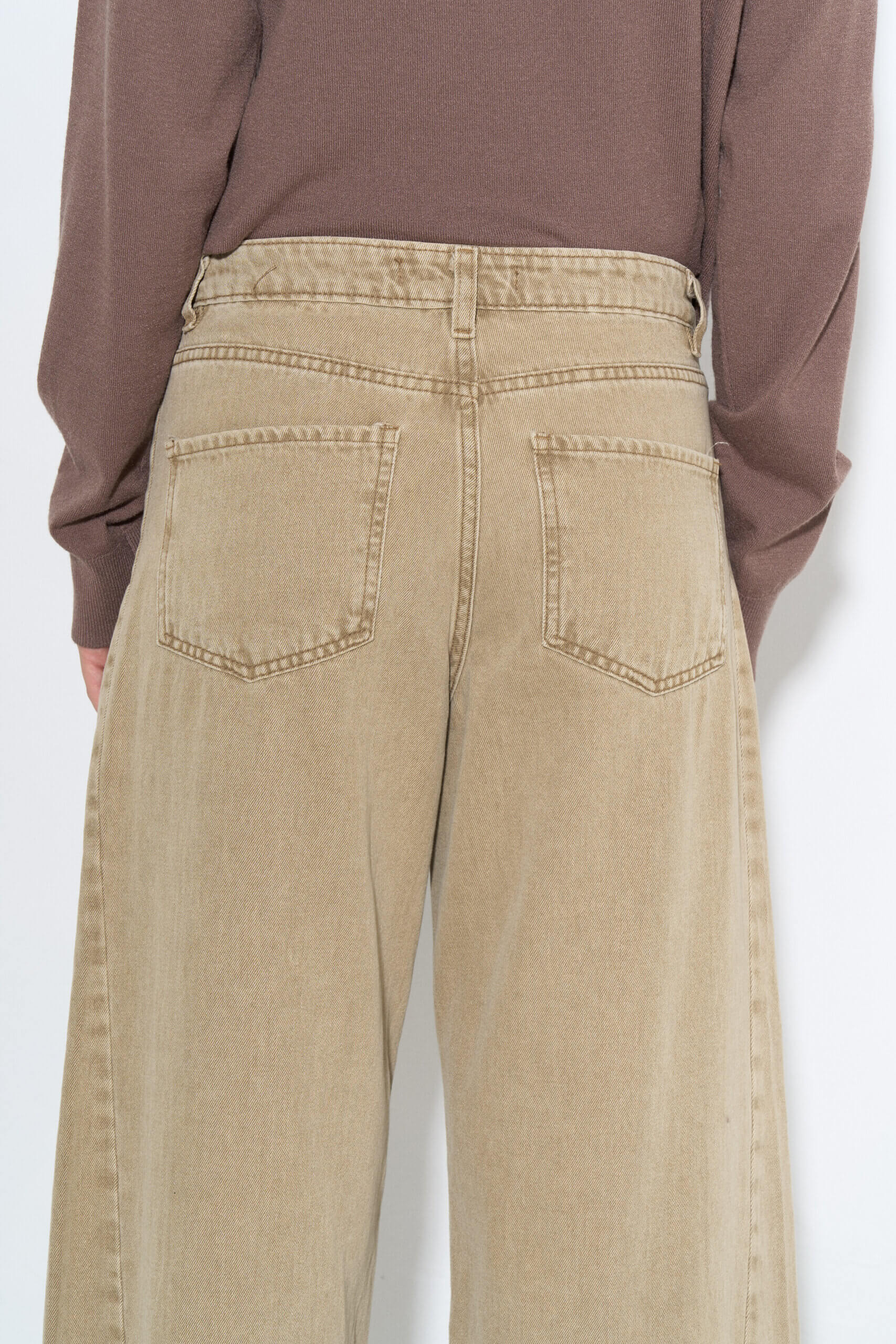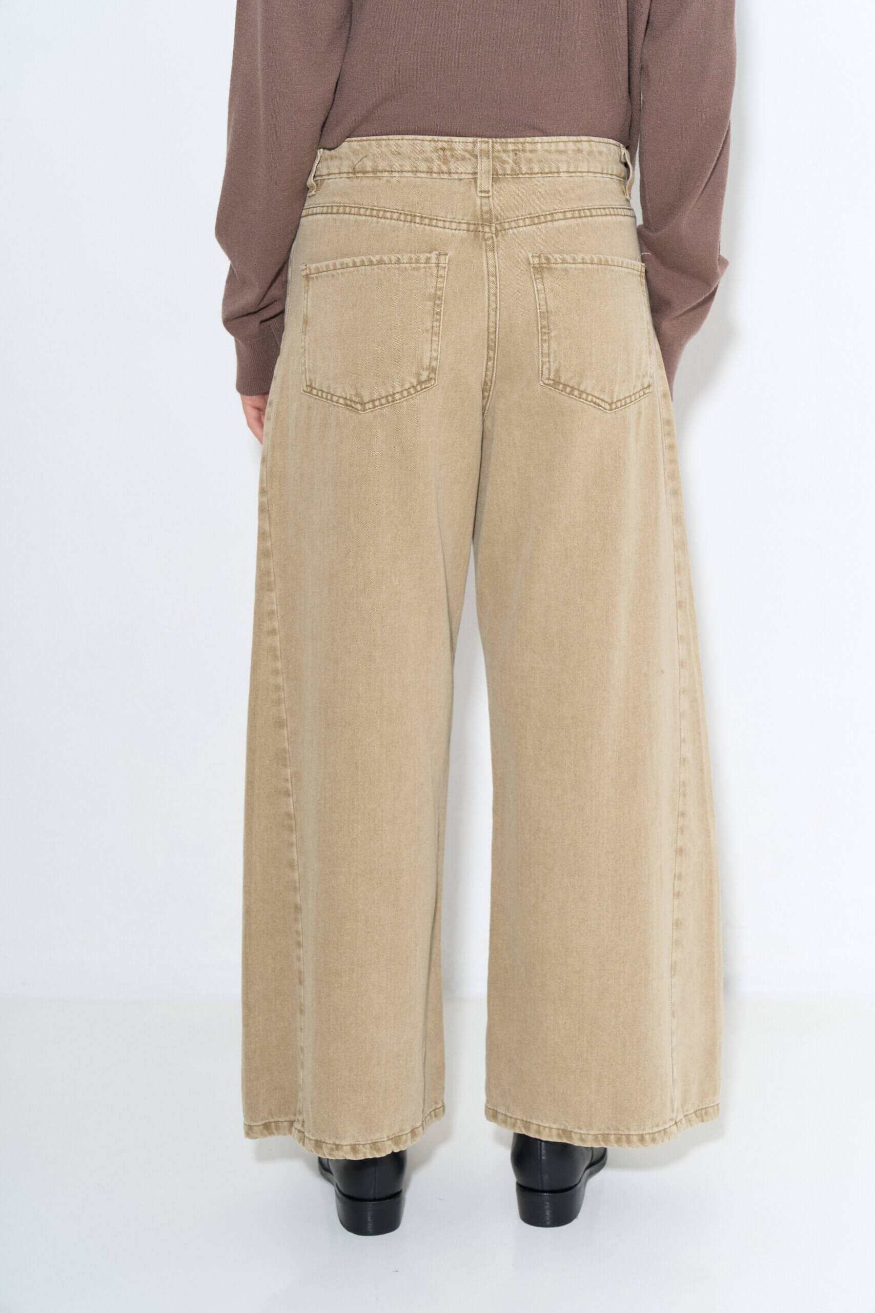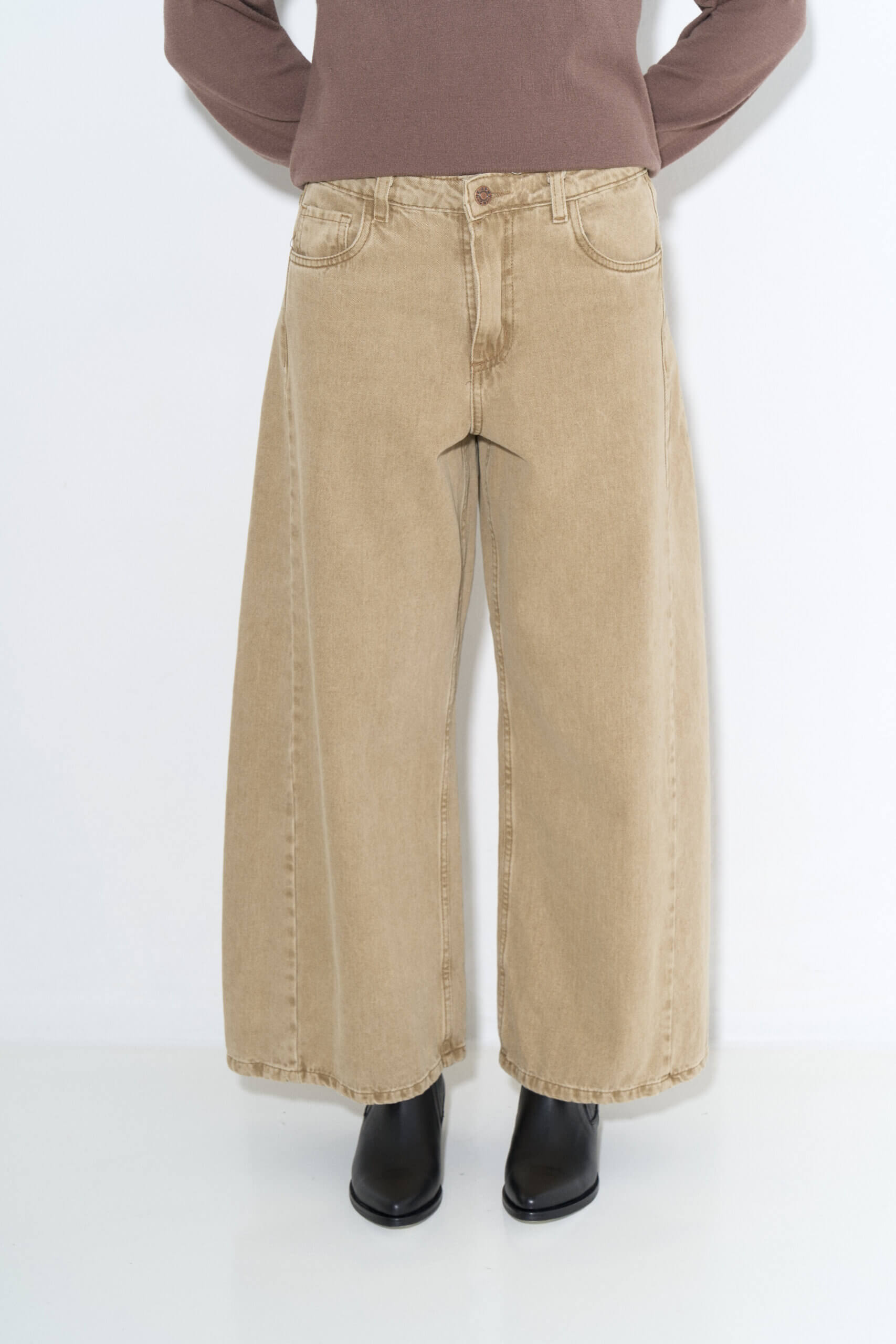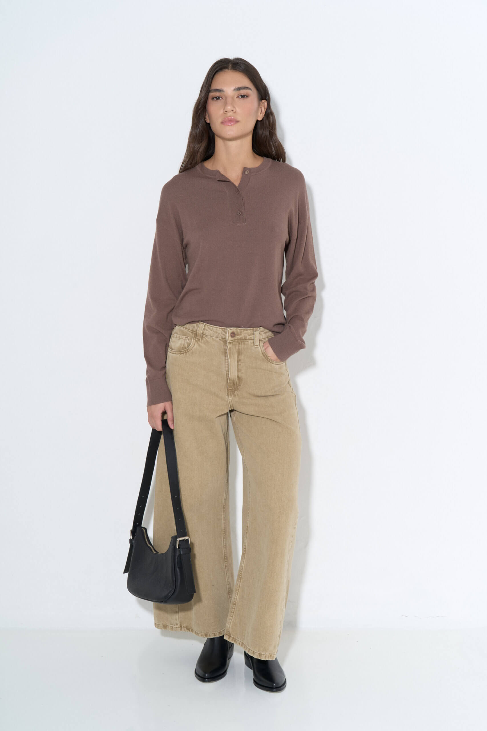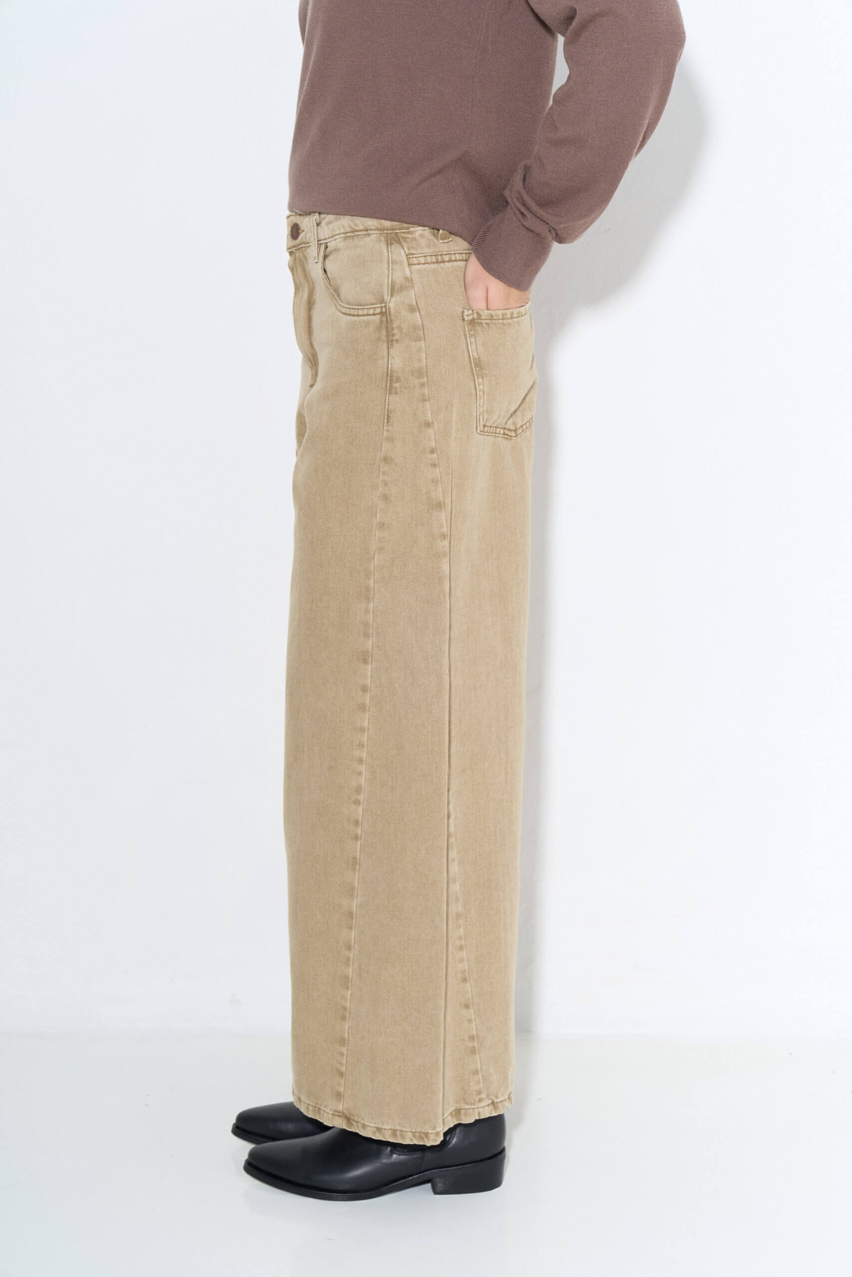 Wide leg rígido tiro medio, 5 bolsillos con recorte lateral y ruedo común.