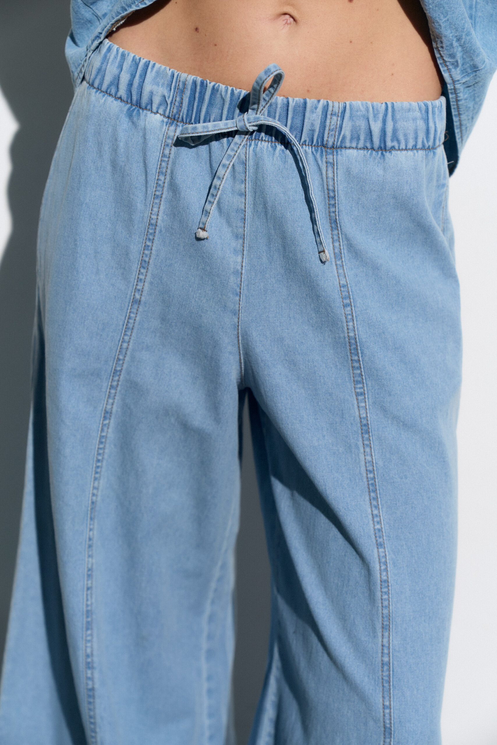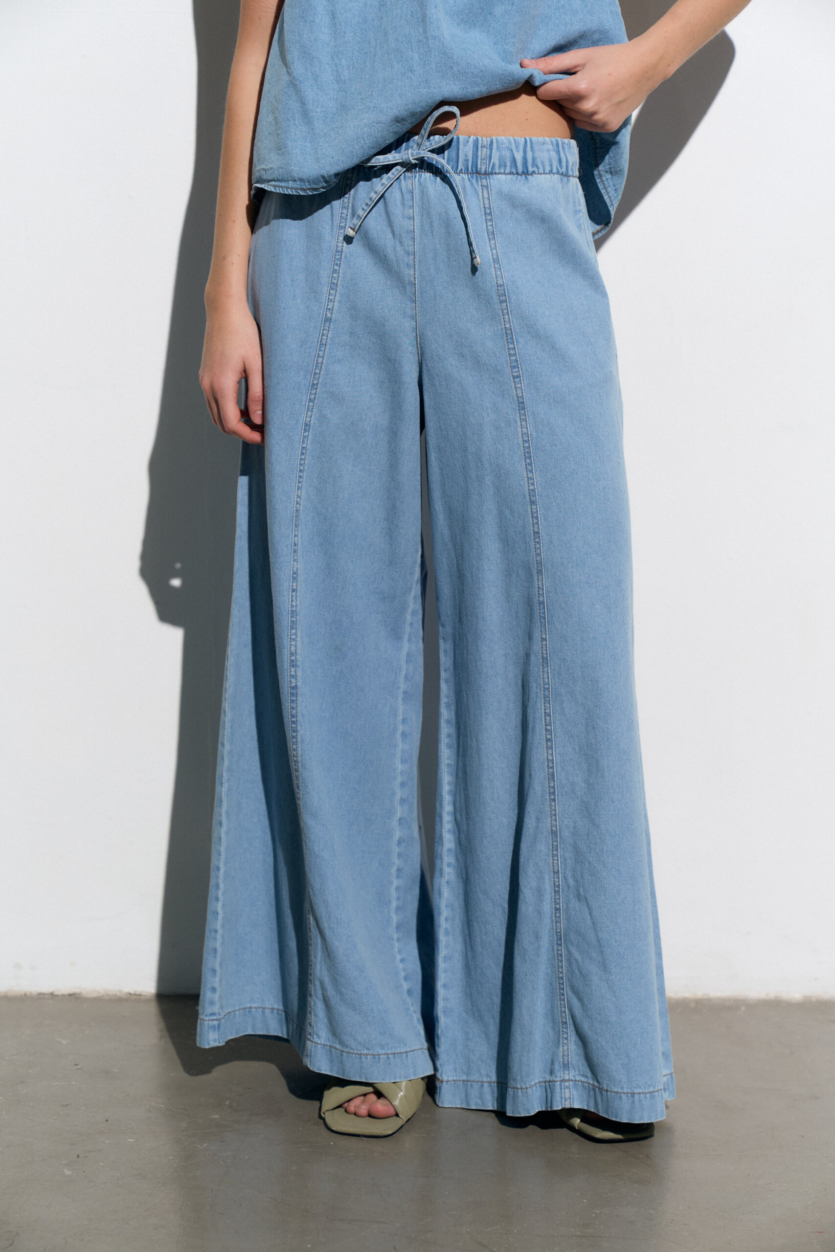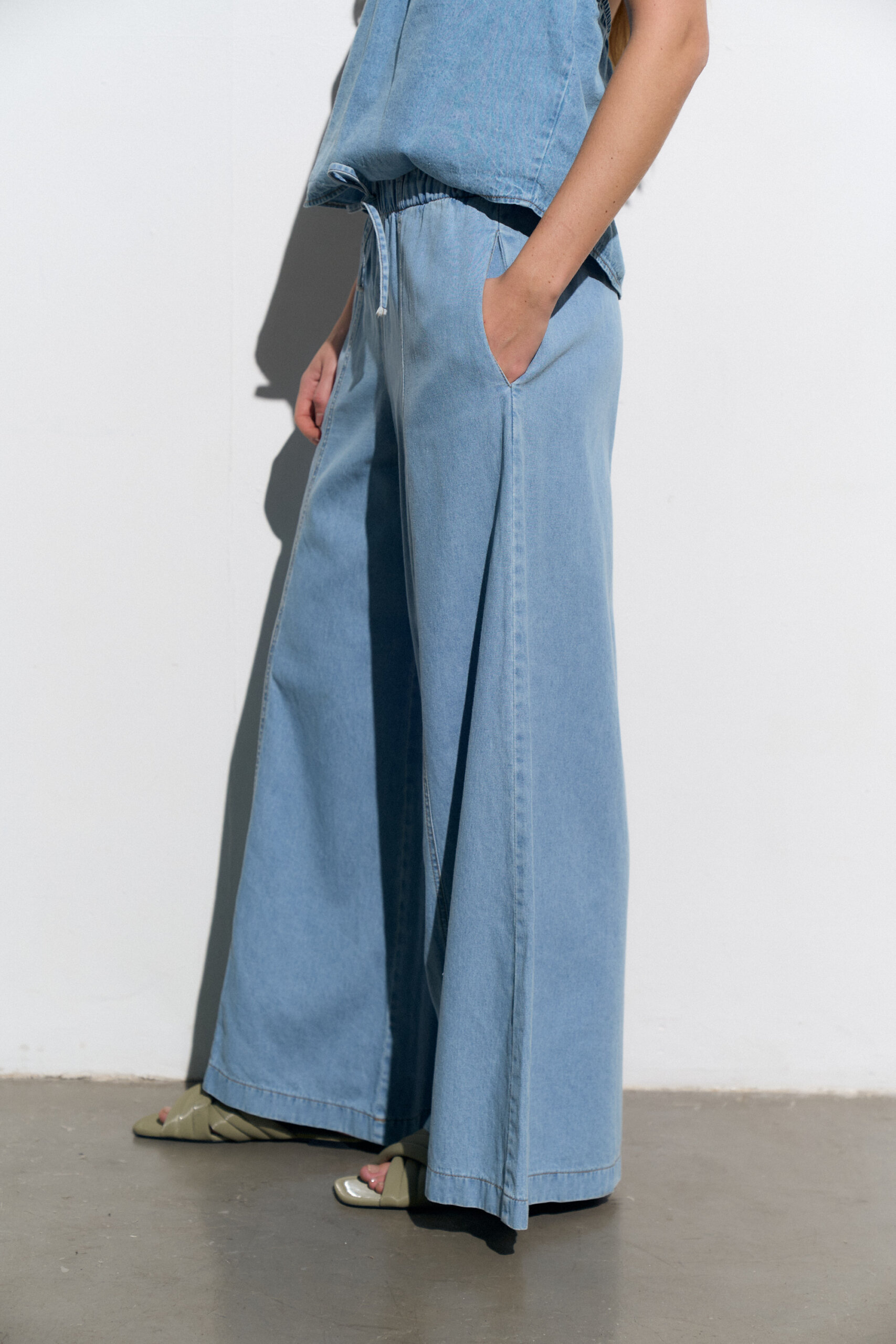 Wide leg de denim camisero con cintura elastizada, recortes delanteros y bolsillos laterales.